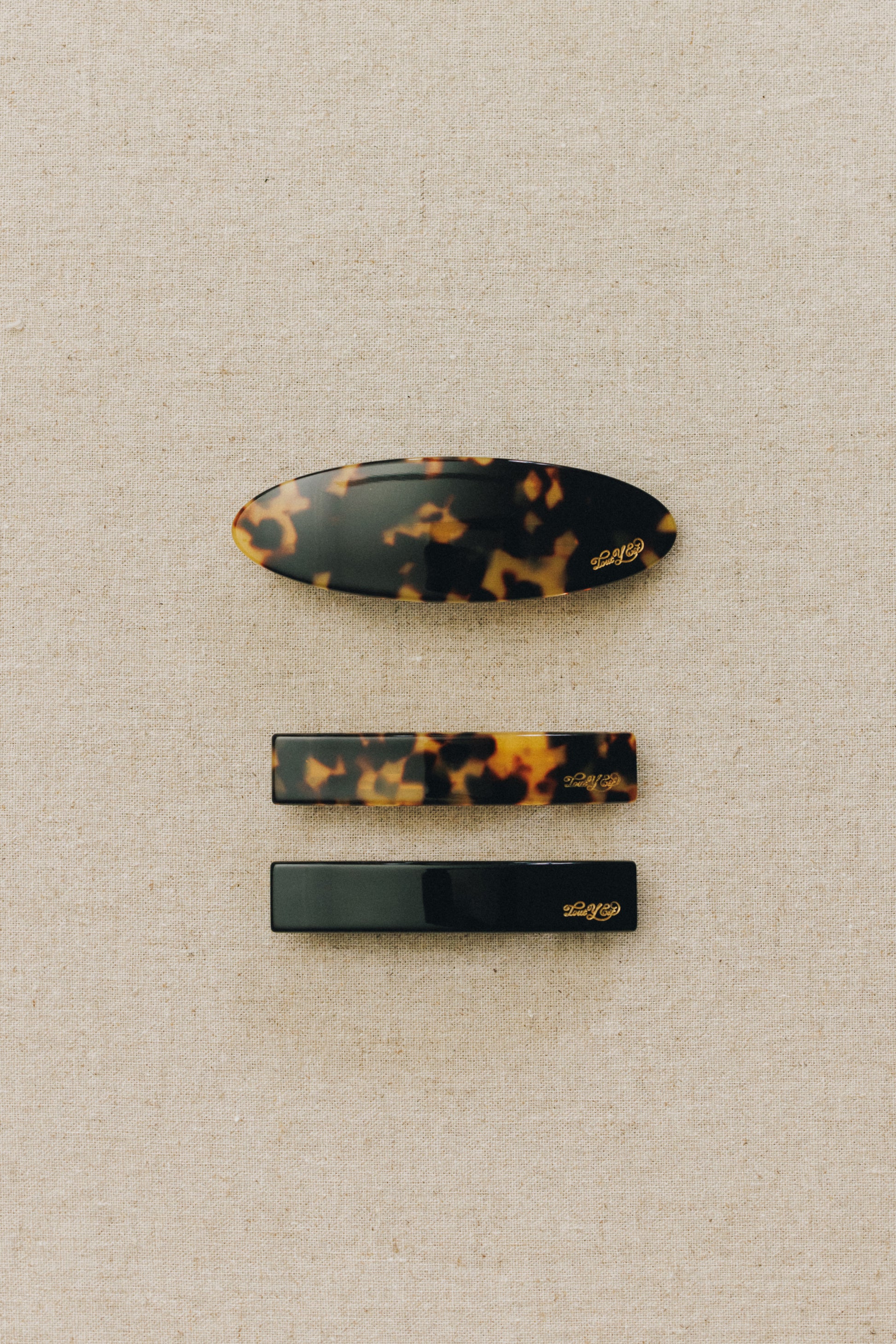 The collection includes a variety of shapes and sizes, such as barrettes, headbands, and clips, available in three colors: black, brown, and leopard.