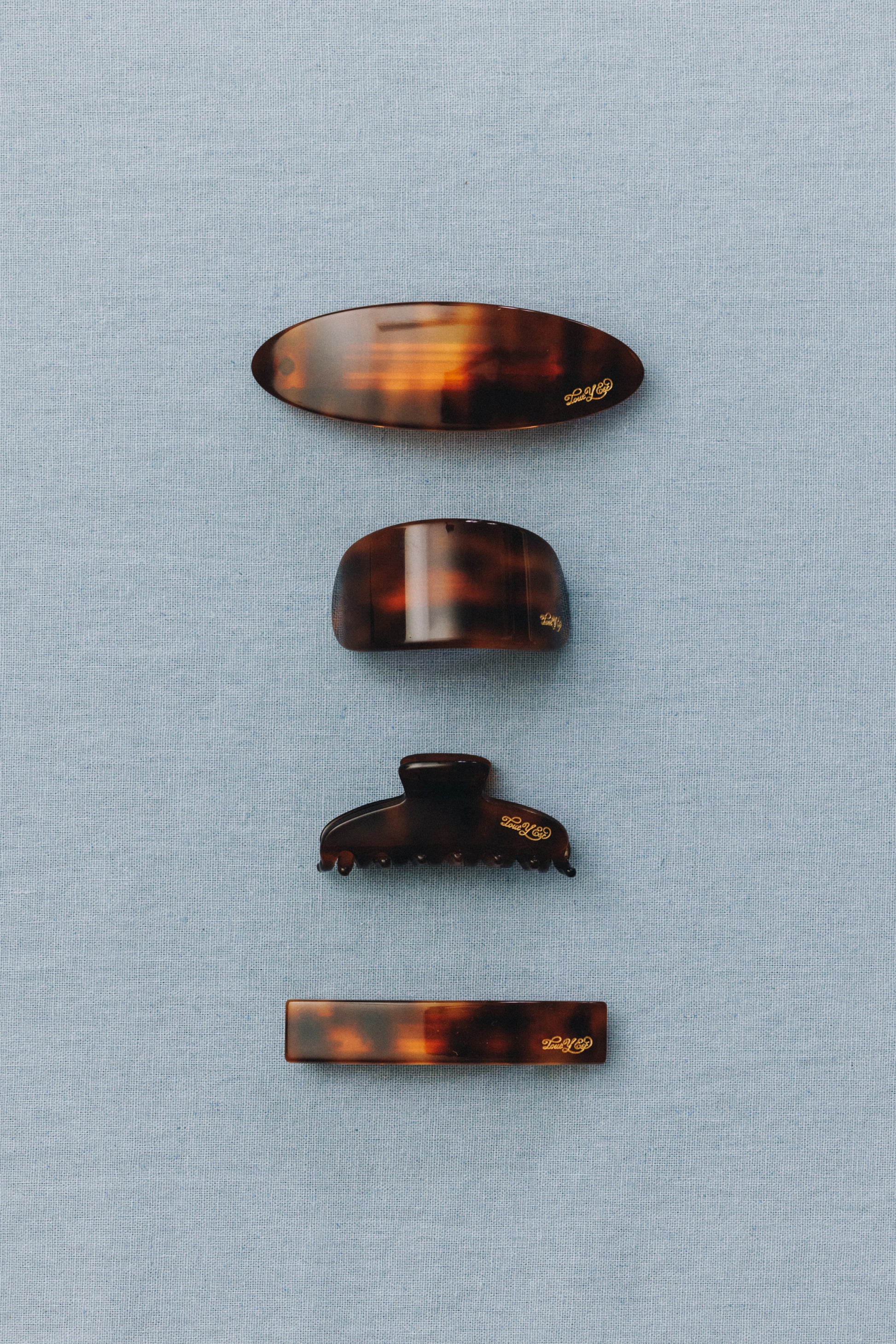 The collection includes a variety of shapes and sizes, such as barrettes, headbands, and clips, available in three colors: black, brown, and leopard.