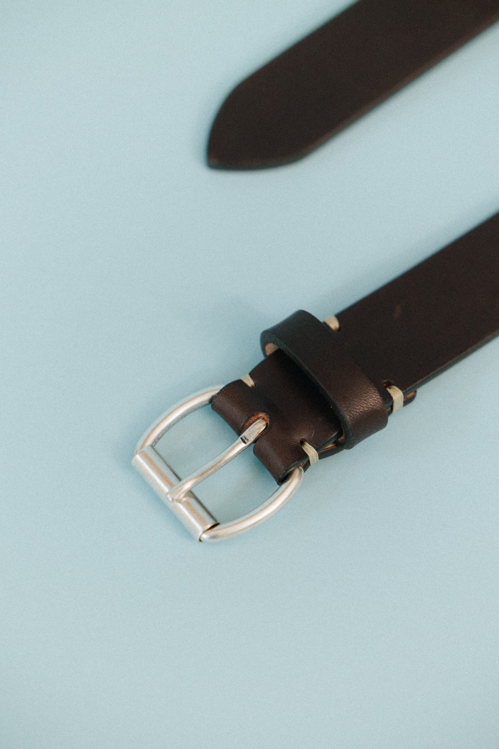 Additionally, the belt is accented with a vintage silver buckle and ivory-colored stitching around the belt loop for an extra touch of style.