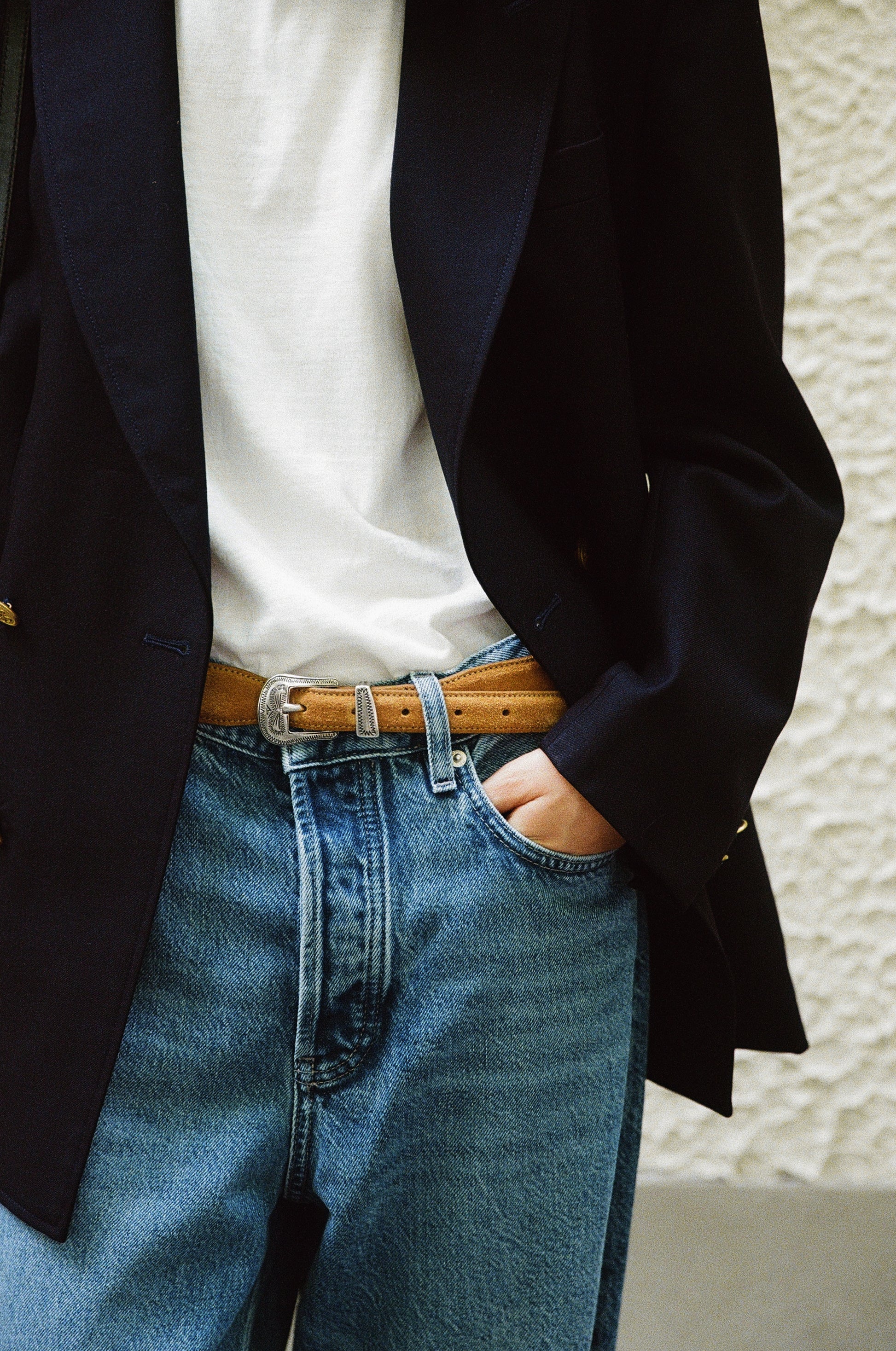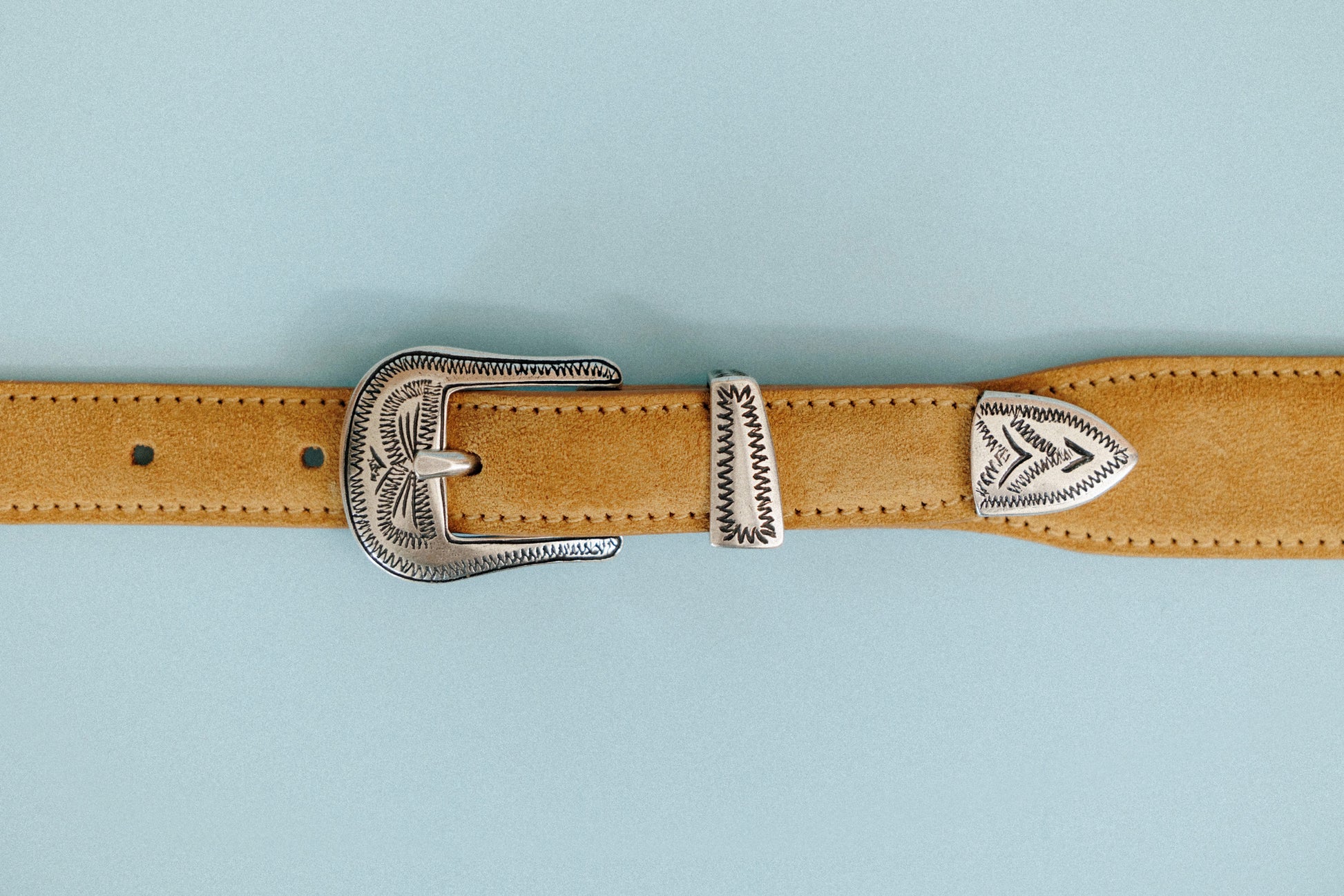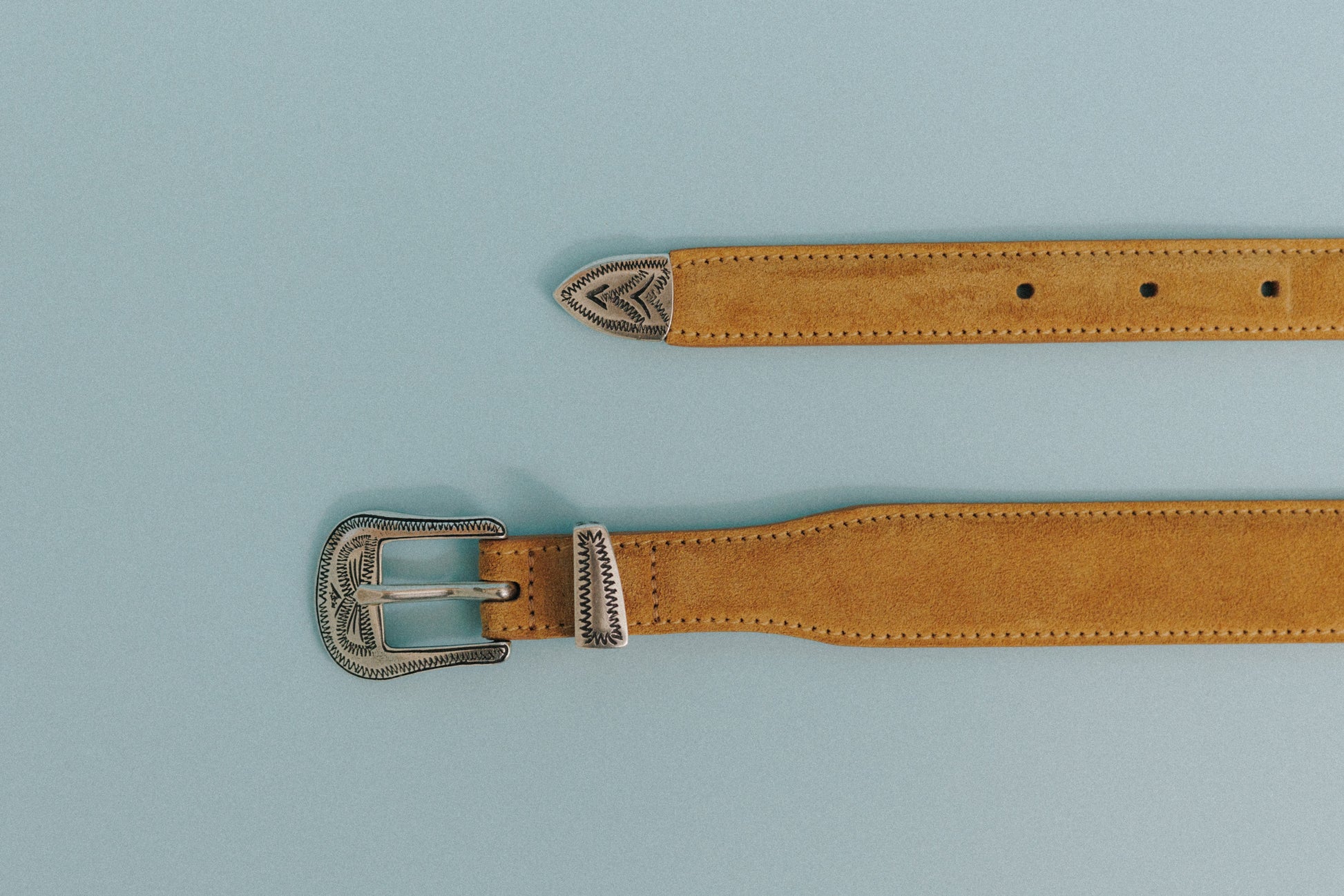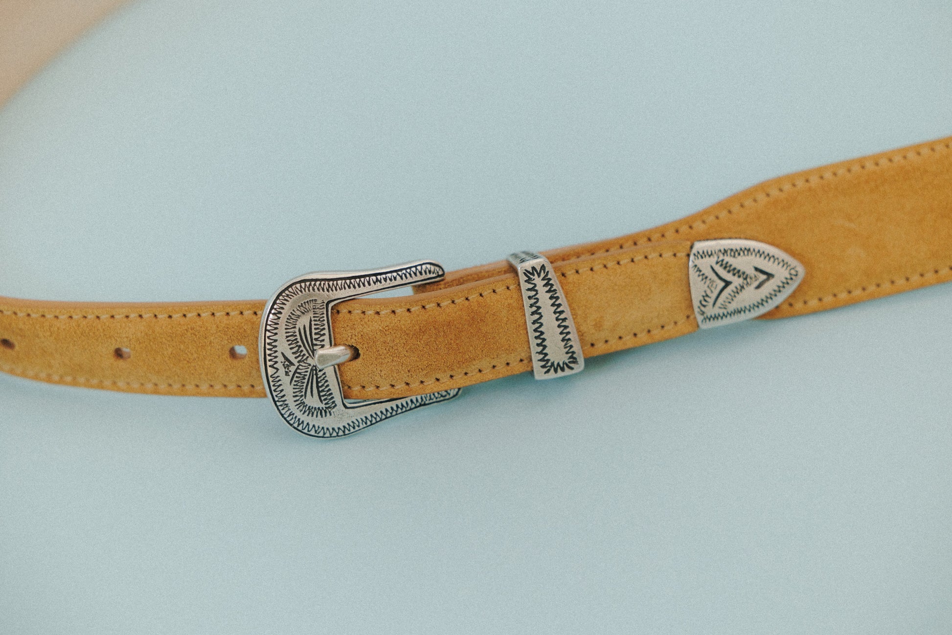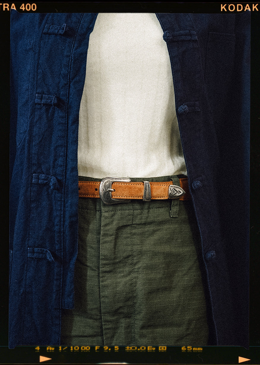 CEINTURE GRAVÉE is a Western-style and crafted in Italy. The silver metal buckle and tip, engraved with intricate patterns, serve as classic yet distinctive accents that embody iconic Western design elements. The exterior is made of suede calf leather, offering a soft and natural texture, while the lining is finished in nubuck calf leather for enhanced comfort.