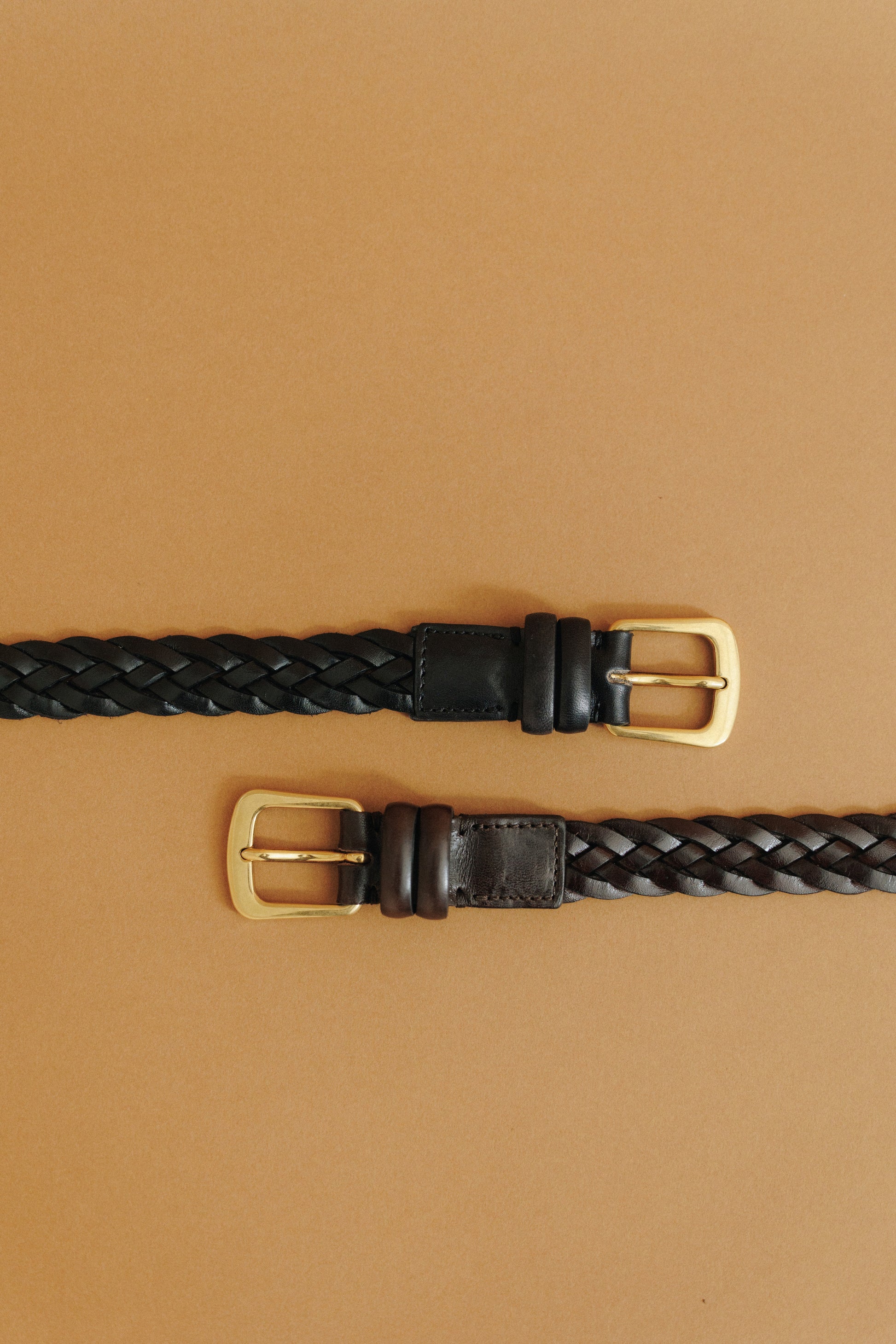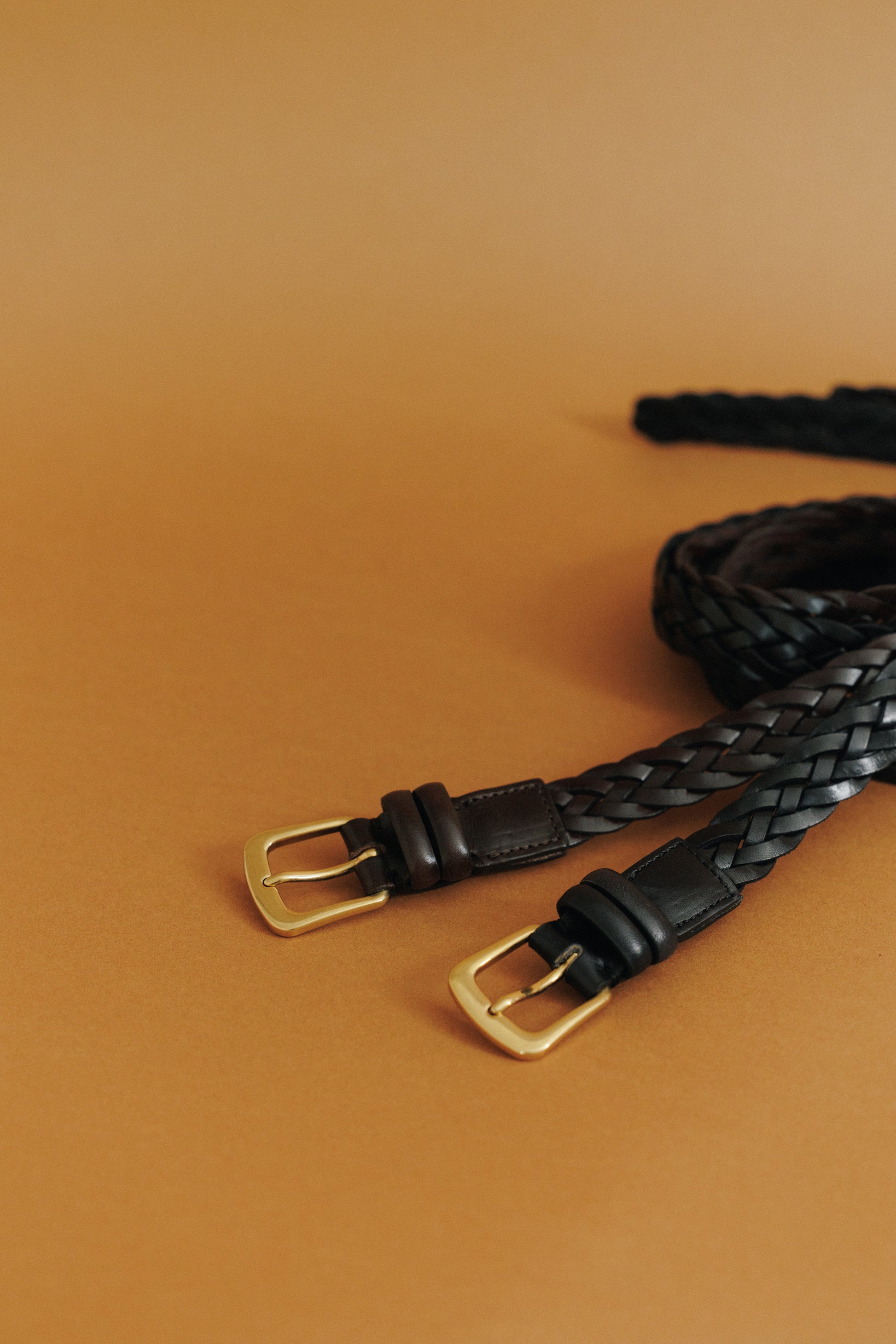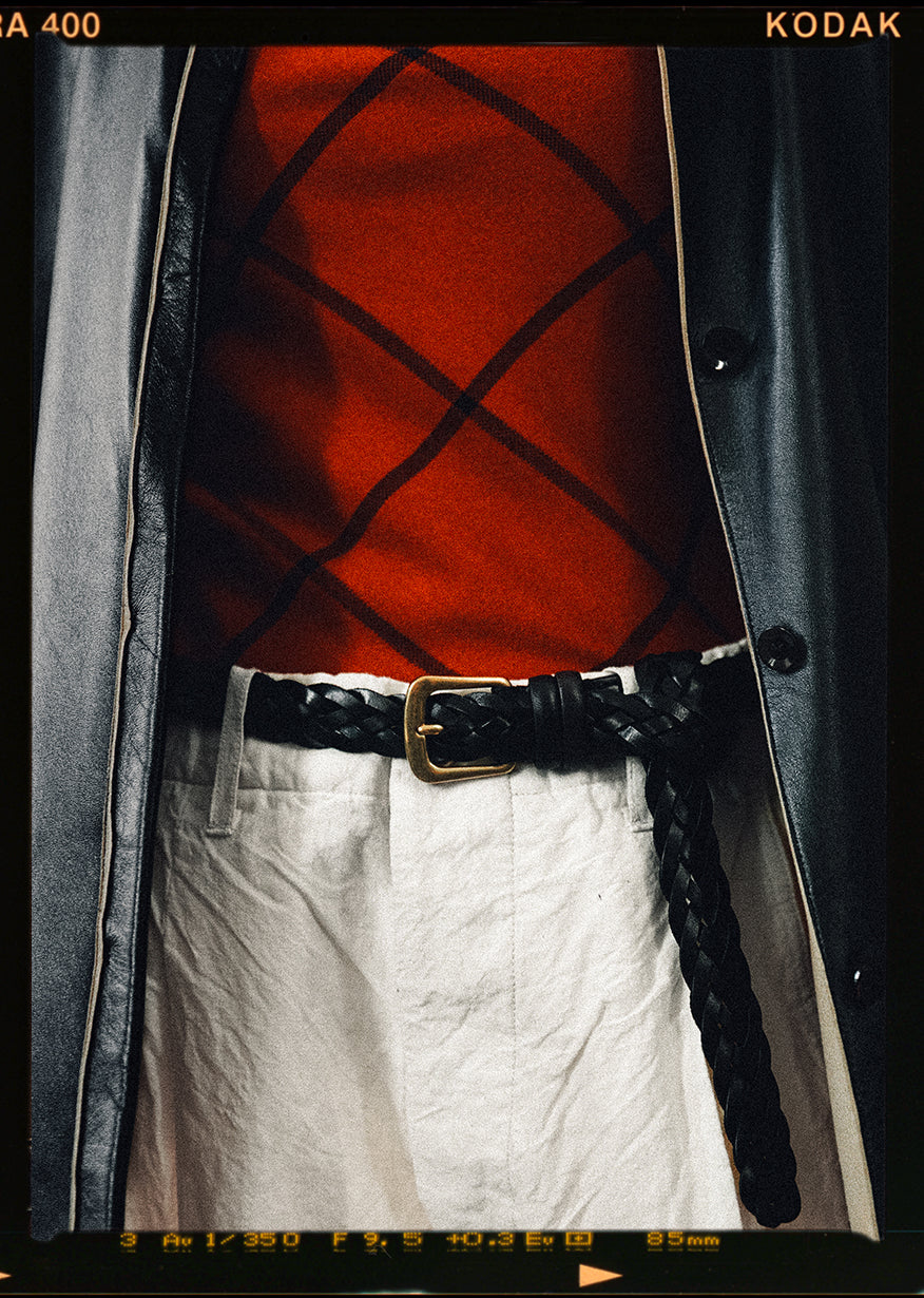 CEINTURE TRESSÉE is a webbing-style belt crafted from durable cowhide leather. Made in Italy, it features intricately twisted leather with a subtle sheen and is accented by a vintage brass buckle. The buckle can be secured at any point along the webbing, ensuring a comfortable fit regardless of size.