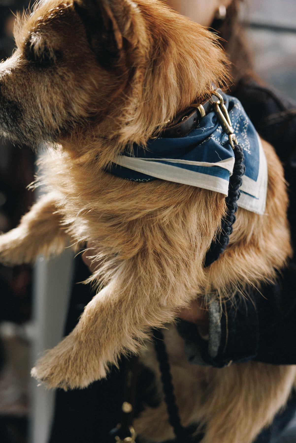 Measuring 55 × 55 cm, it can be used by both pets and humans alike. It can serve as an accessory for your dog during walks or be tied around the wrist or bag as a subtle accent. Featuring a charming combination of dog illustrations and paisley motifs, the design is finished with the “TOUT Y EST” logo printed at the center. Lightweight and soft to the touch, it is suitable for use in all seasons