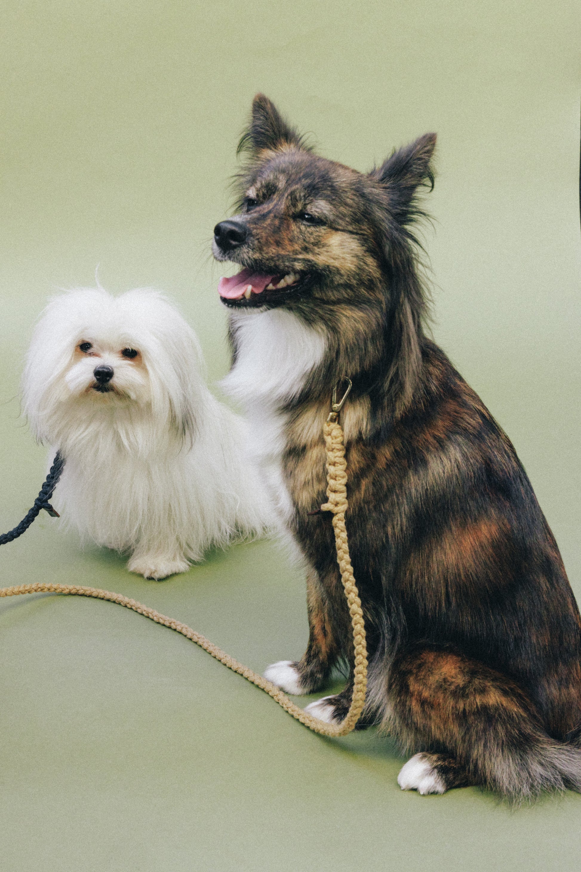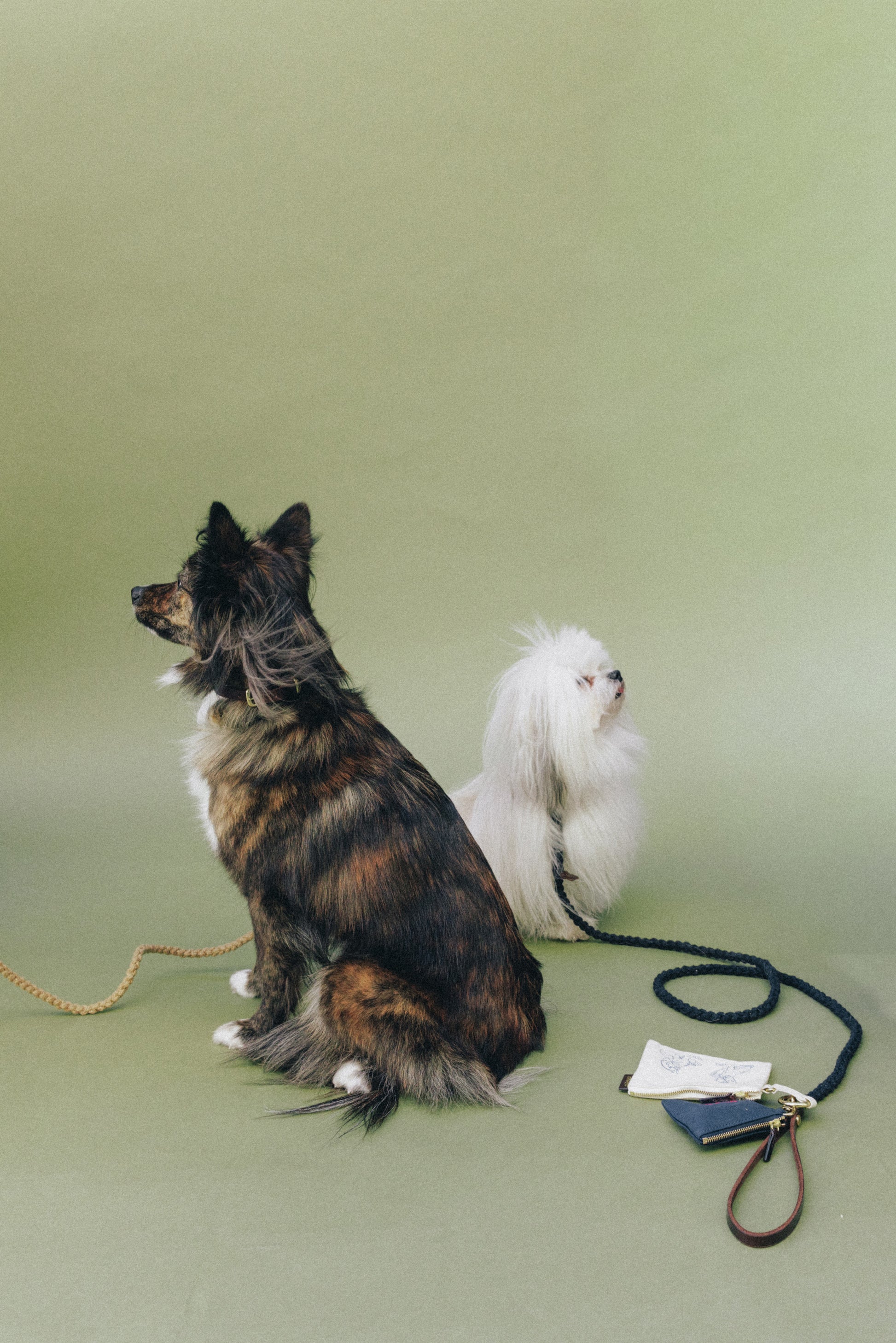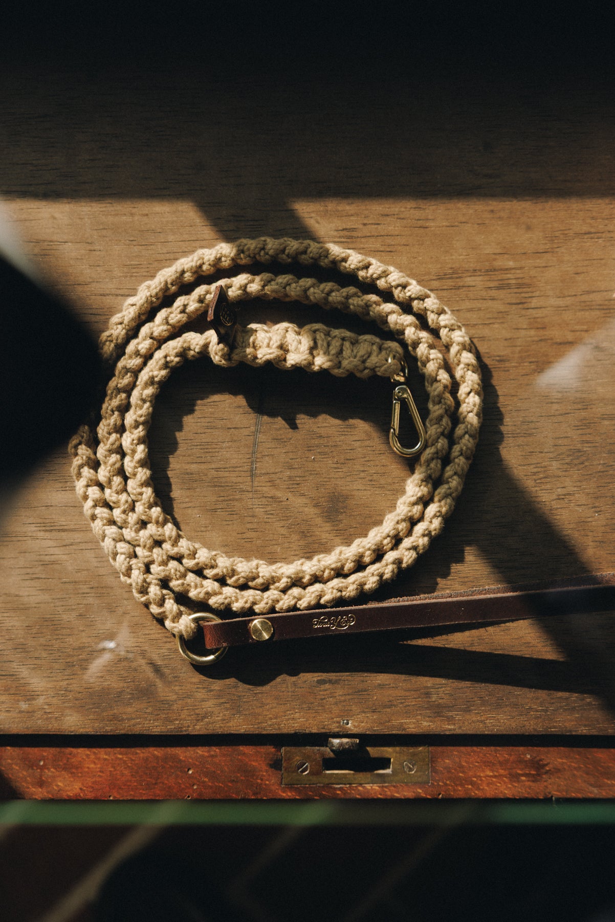 This leash for dogs is crafted from Italian cowhide, brass, and cotton rope.