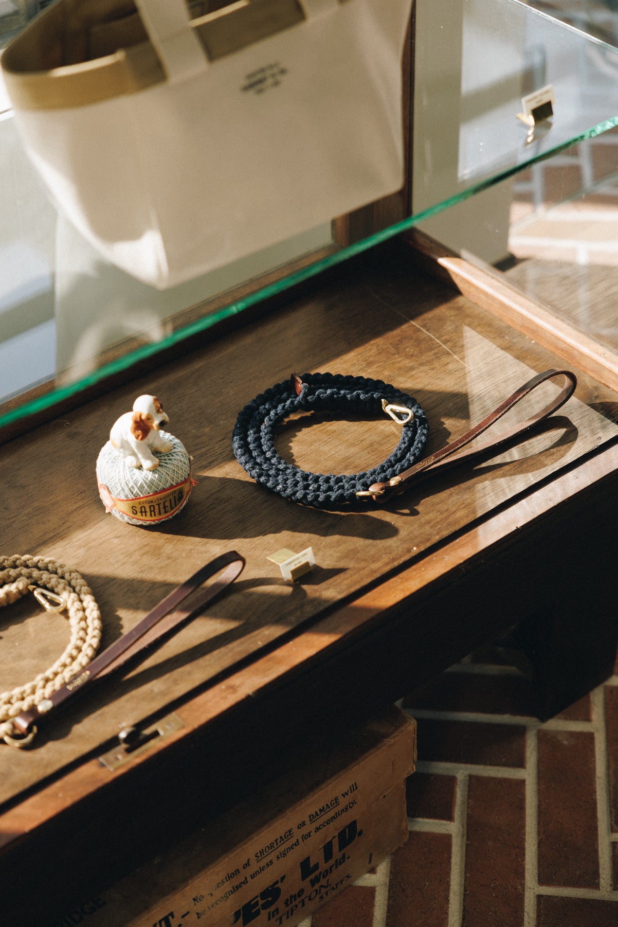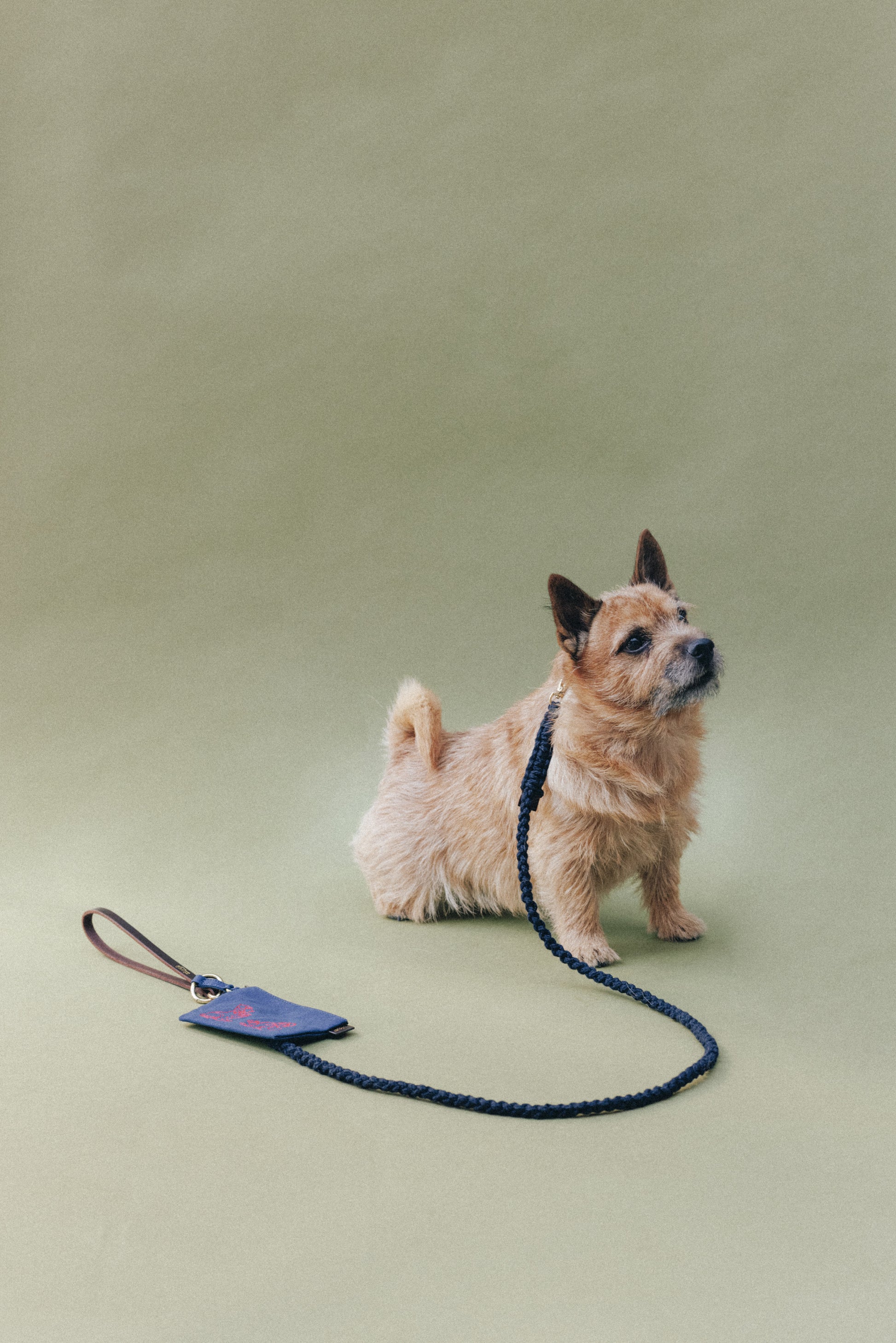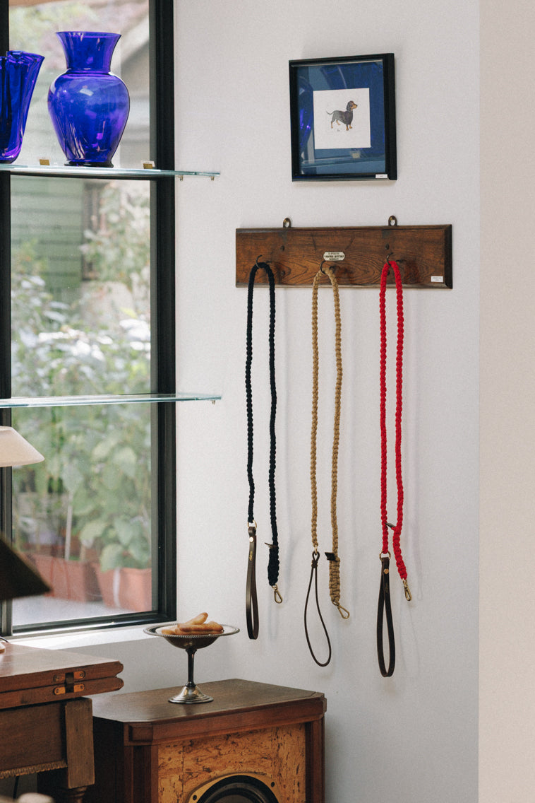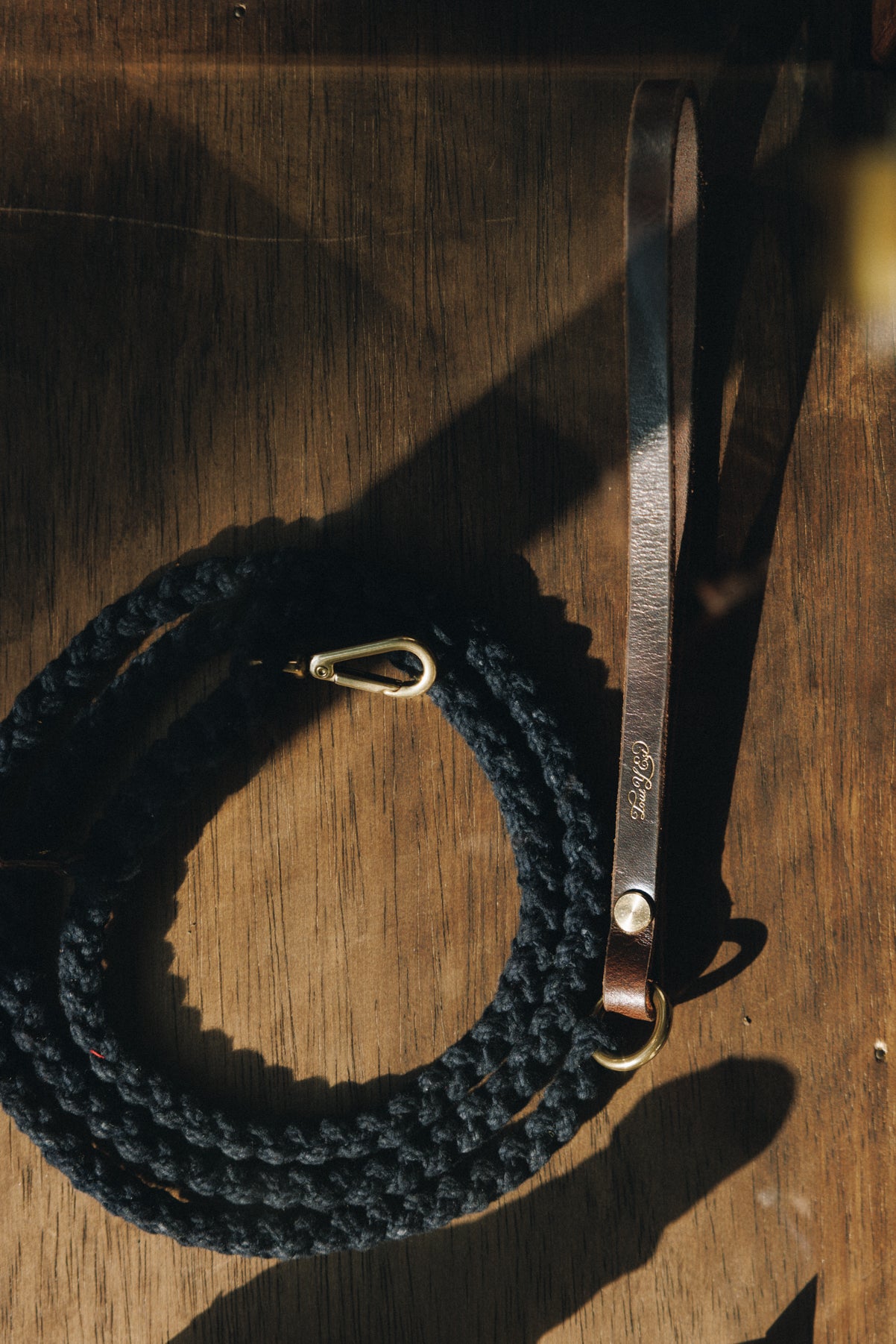 This leash for dogs is crafted from Italian cowhide, brass, and cotton rope.