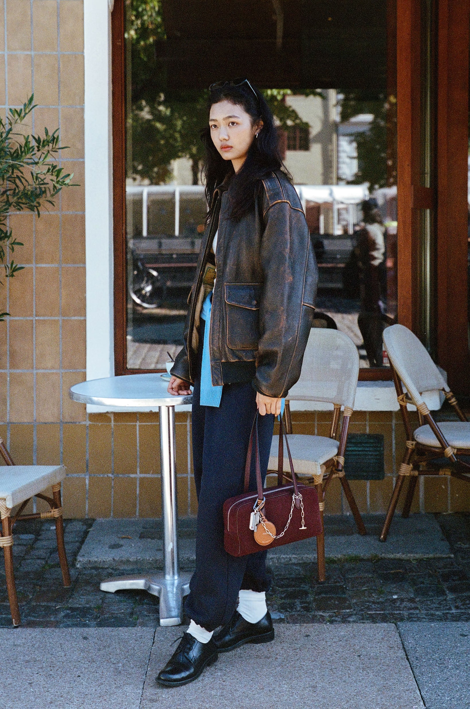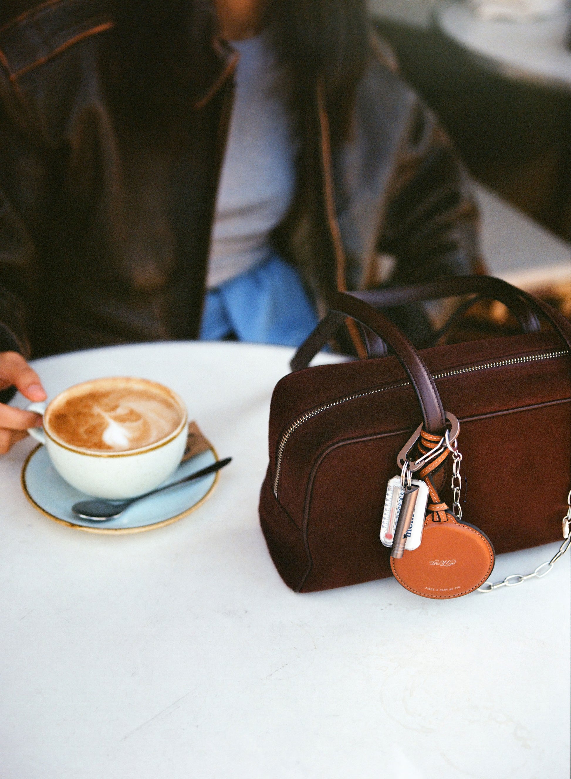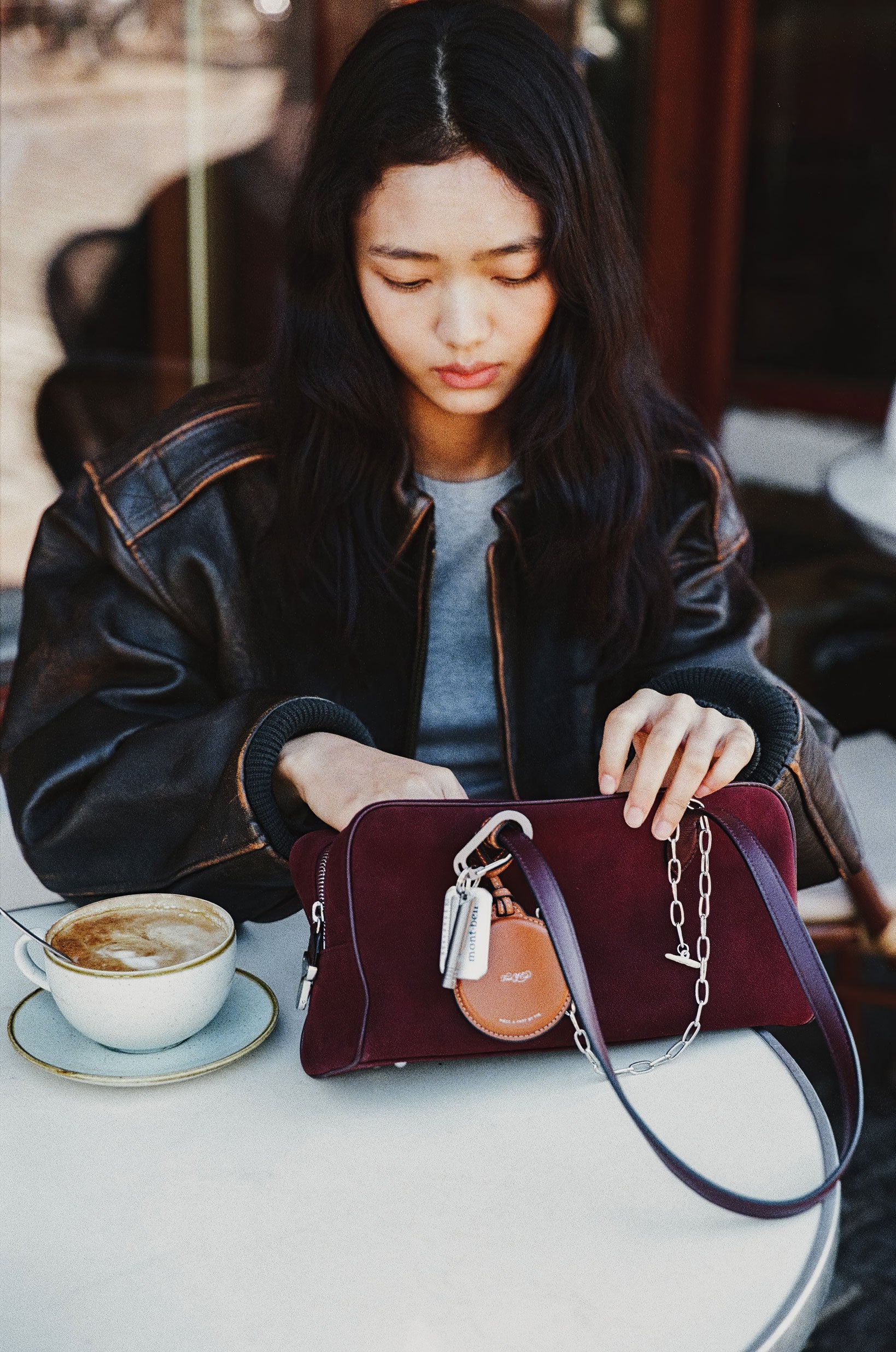 The pendant mirror is a mirror charm that adds a subtle accent to your bag. The front is made of soft cowhide leather, while the back features a mirror, combining decorative appeal with practicality. The long leather strap can be wrapped around bag handles or decorative elements to create a natural look at your preferred length. Lightweight with gentle curves, the front is finished with a simple foil-stamped logo.