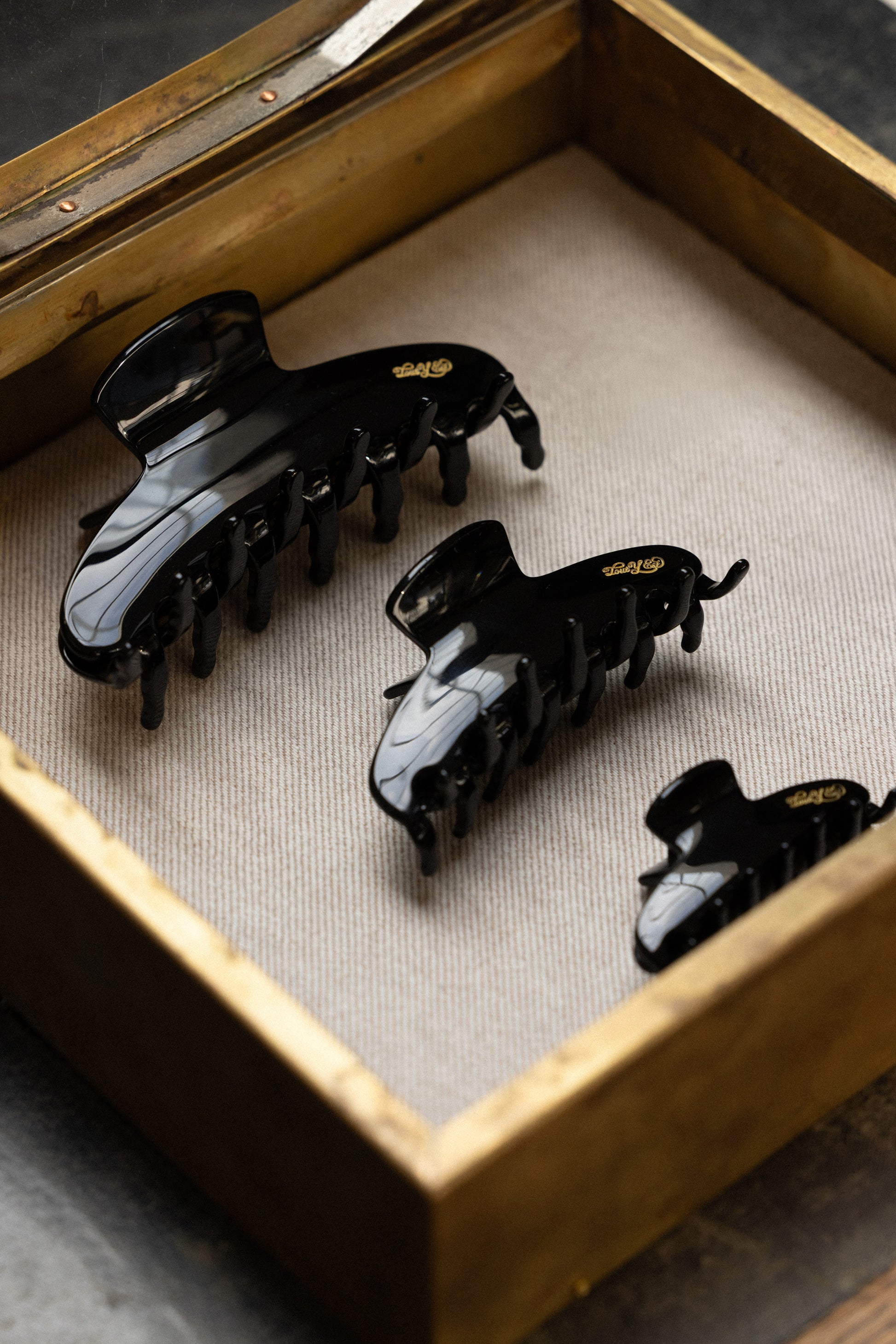 The collection includes a variety of shapes and sizes, such as barrettes, headbands, and clips, available in three colors: black, brown, and leopard.