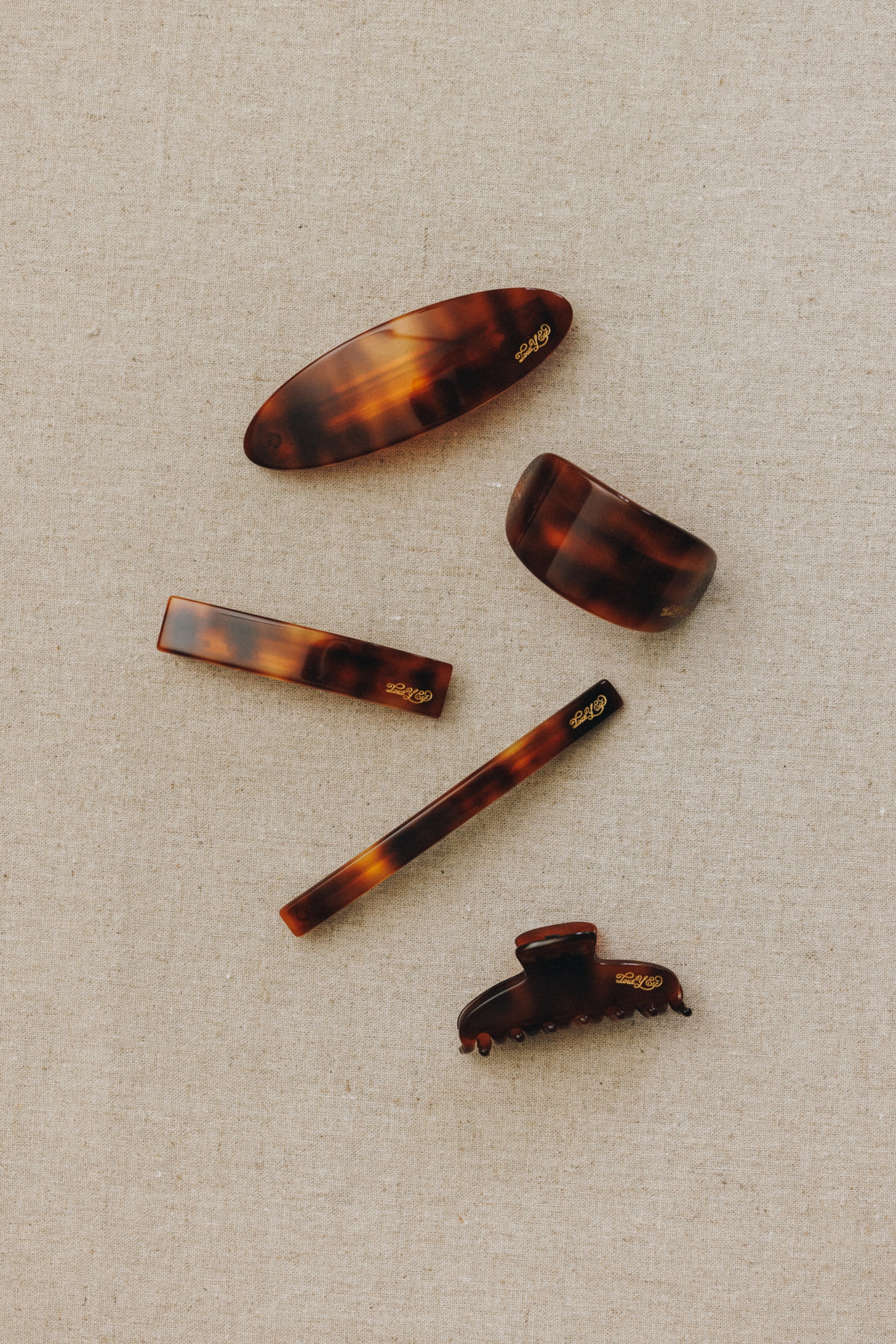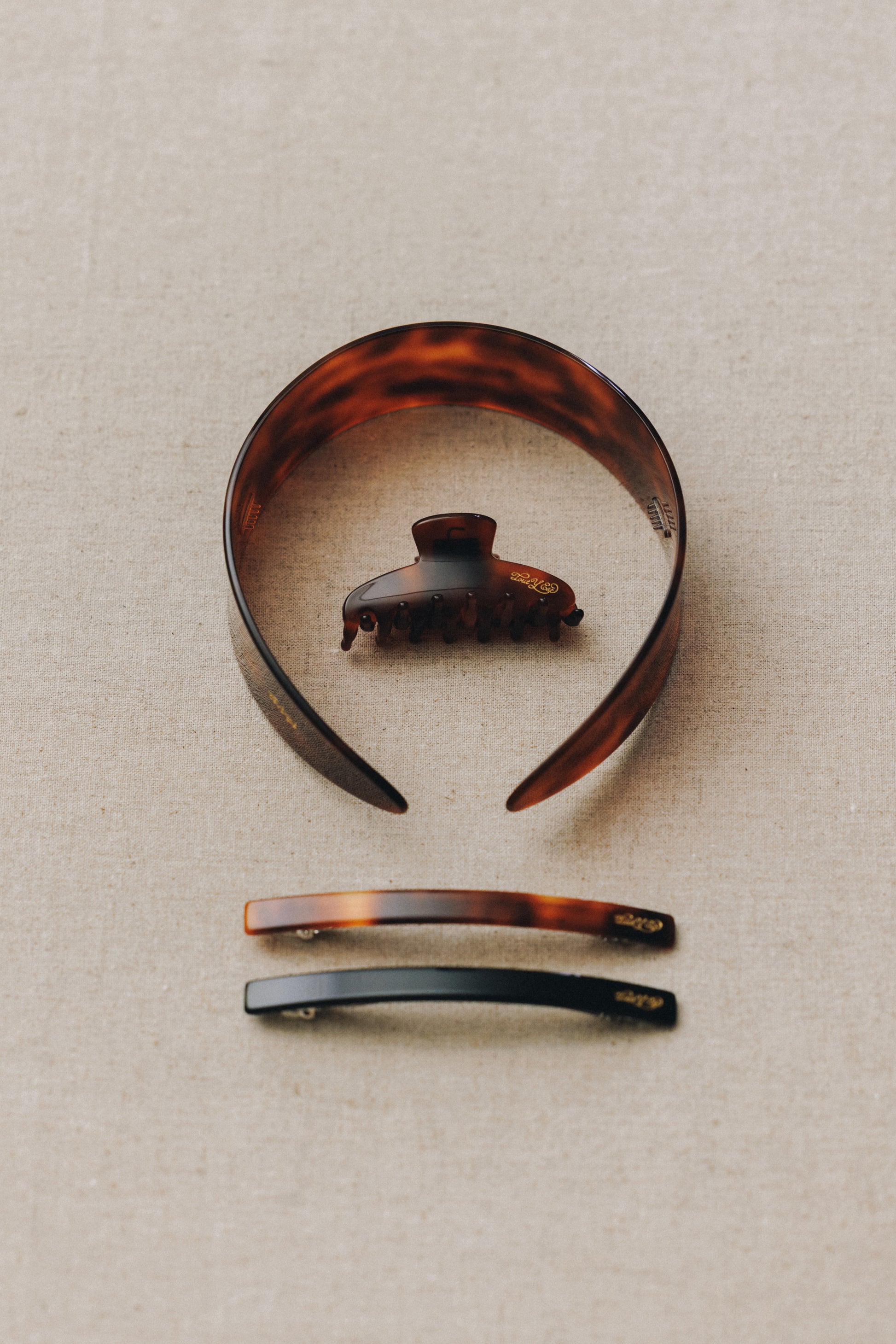 The collection includes a variety of shapes and sizes, such as barrettes, headbands, and clips, available in three colors: black, brown, and leopard.
