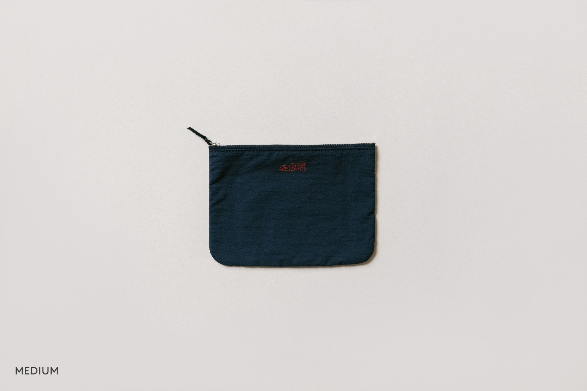 This rectangular pouch is ideal for organizing and carrying essentials. The soft zipper features a leather puller for easy use, and the interior has a pocket for keeping small items neatly stored. The front displays an embroidered logo, and the lining matches the exterior material for enhanced quality.