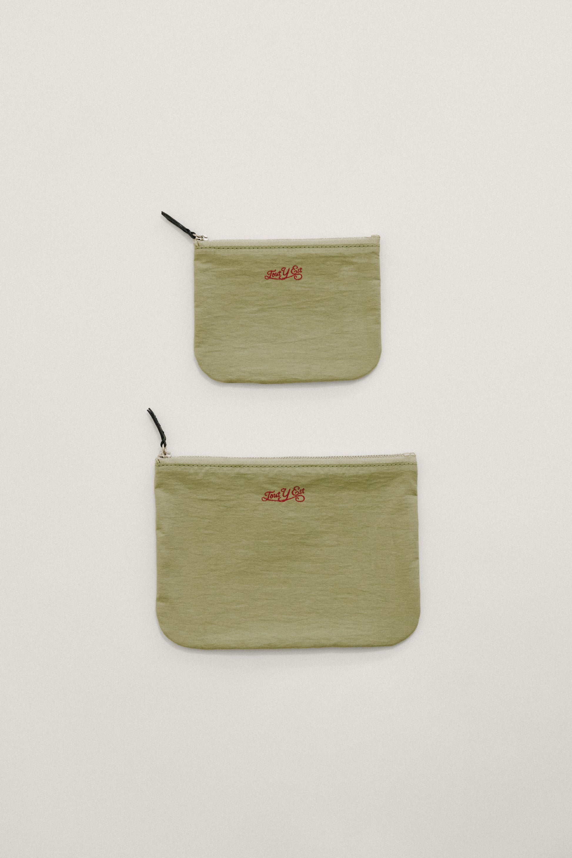 This rectangular pouch is ideal for organizing and carrying essentials. The soft zipper features a leather puller for easy use, and the interior has a pocket for keeping small items neatly stored. The front displays an embroidered logo, and the lining matches the exterior material for enhanced quality.