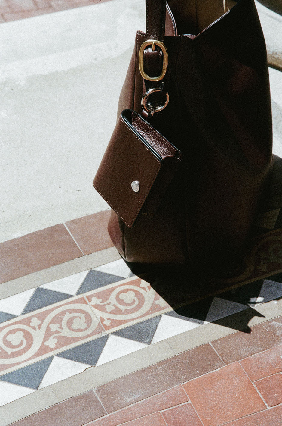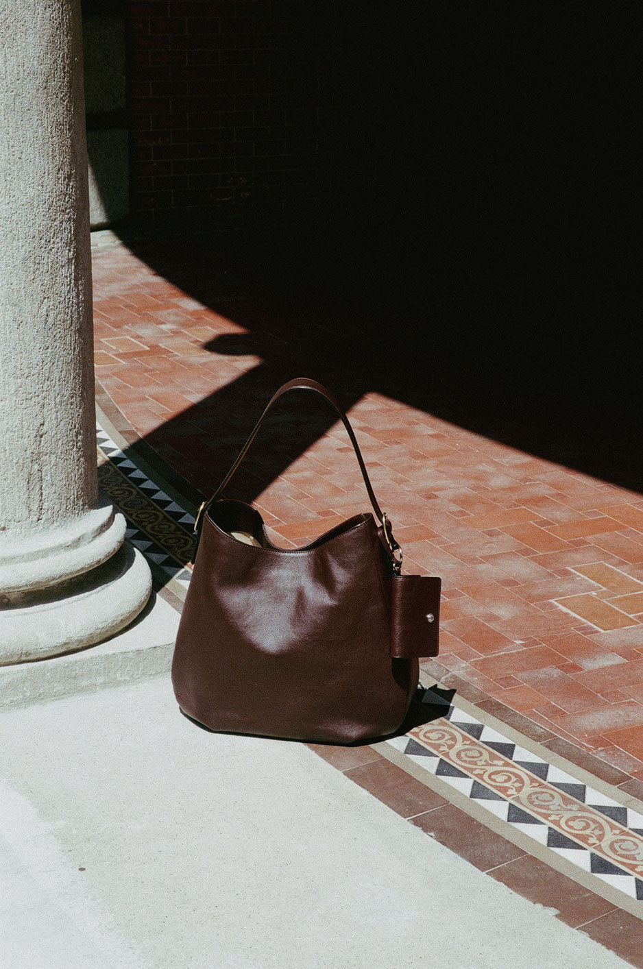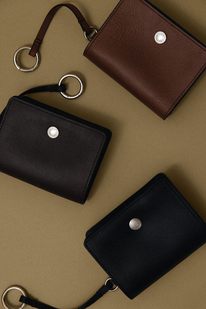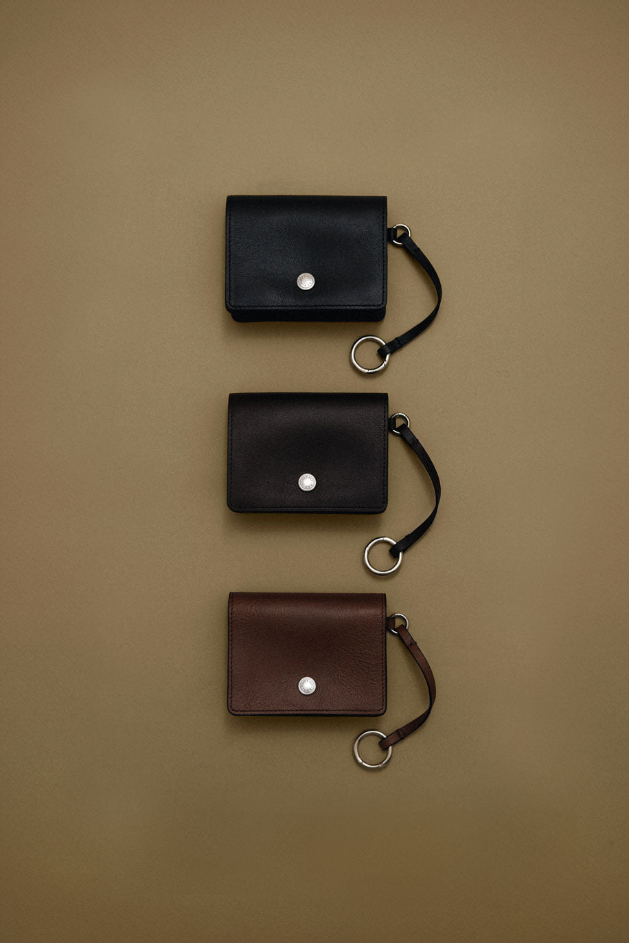 This keyring-style leather pouch is perfect for neatly storing small essentials. It comes with an O-ring and strap, making it easy to attach to a bag, or you can hook it onto your outfit for quick, hands-free access during short outings. The size is ideal for storing frequently used items such as lip balm, AirPods, or credit cards. The soft, oil-treated two-tone leather develops a vintage charm over time, becoming even more attractive with use. The front snap button features an engraved brand logo, while the interior is finished with a foil logo and the signature "small things" label.