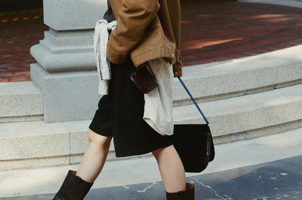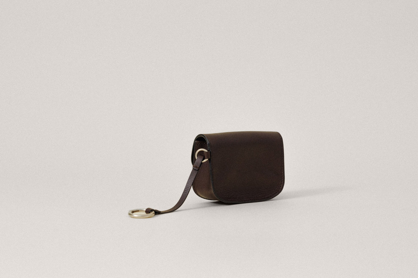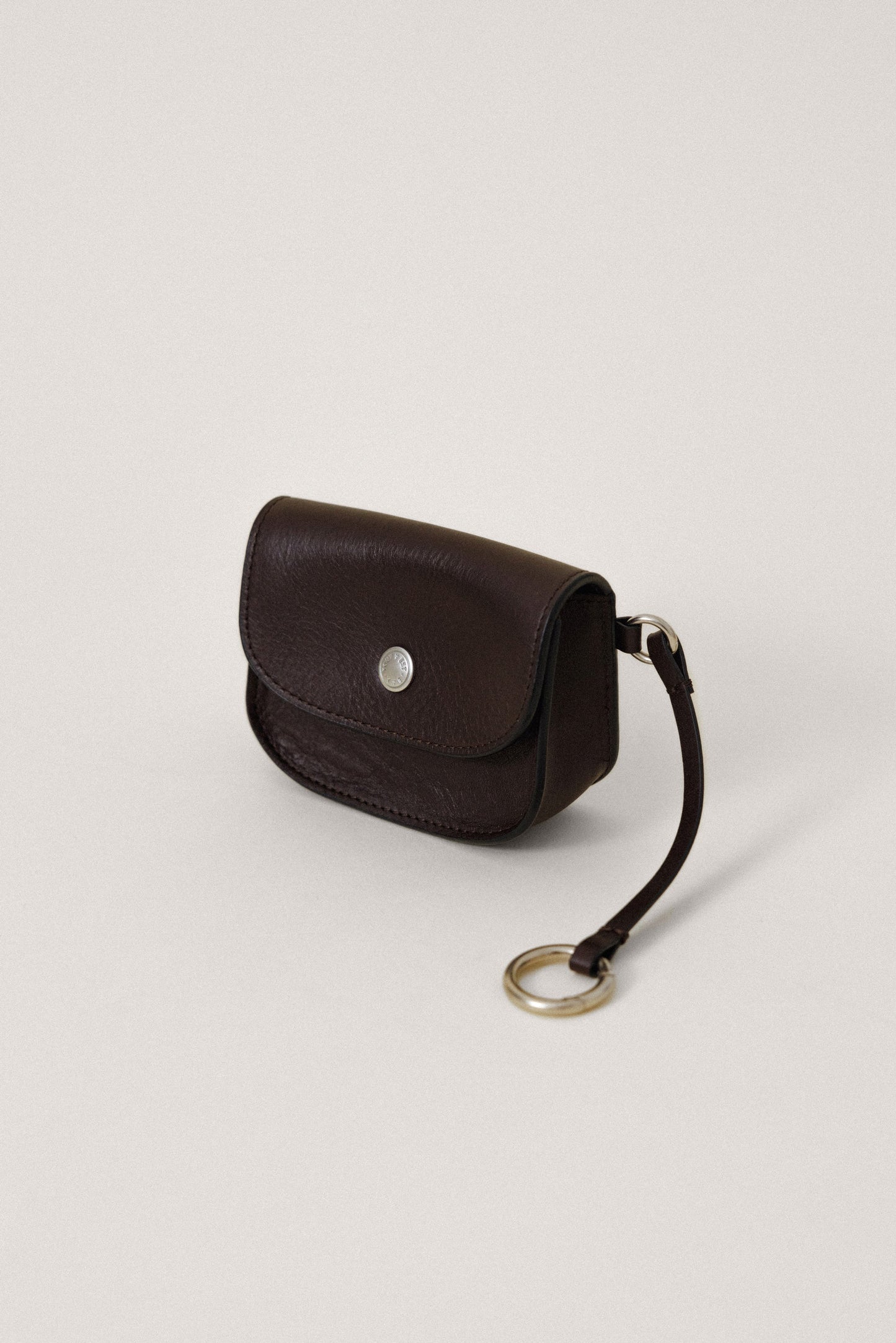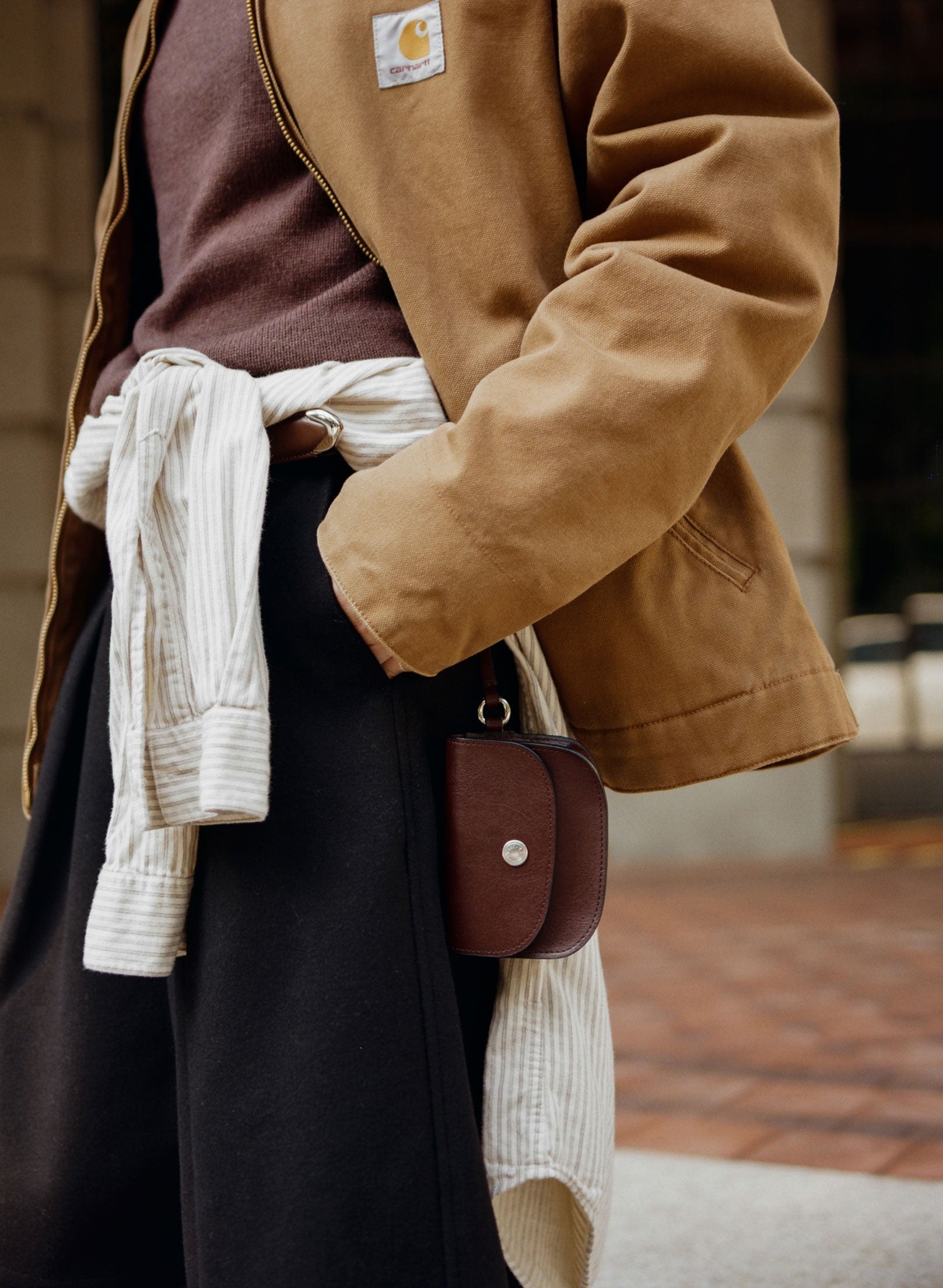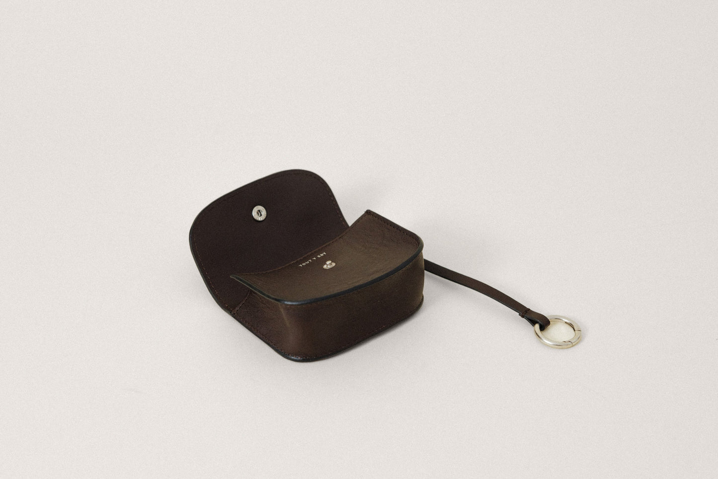 This keyring-style leather pouch is perfect for neatly storing small essentials. It comes with an O-ring and strap, making it easy to attach to a bag, or you can hook it onto your outfit for quick, hands-free access during short outings. The size is ideal for storing frequently used items such as lip balm, AirPods, or credit cards. The soft, oil-treated two-tone leather develops a vintage charm over time, becoming even more attractive with use. The front snap button features an engraved brand logo, while the interior is finished with a foil logo and the signature "small things" label.