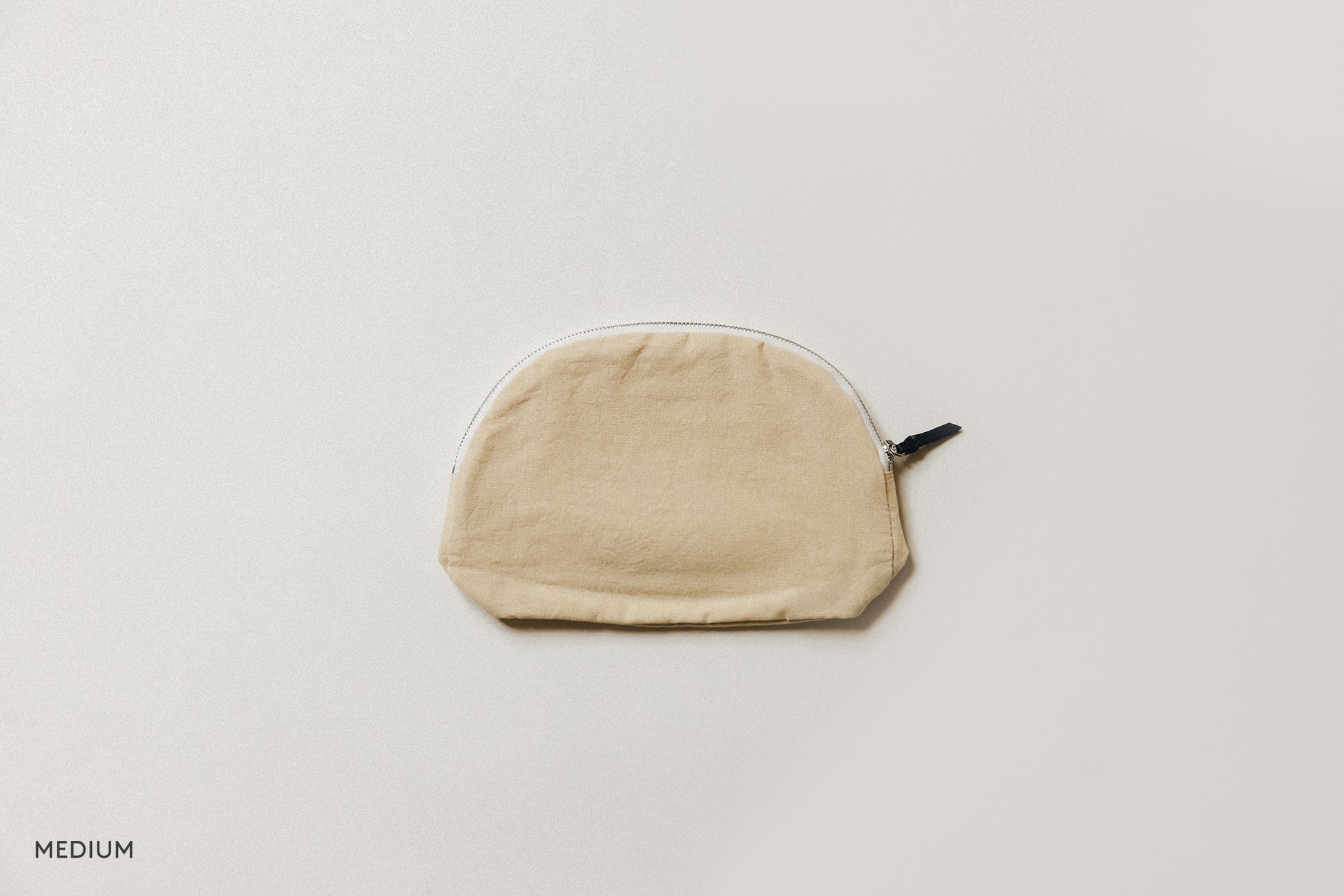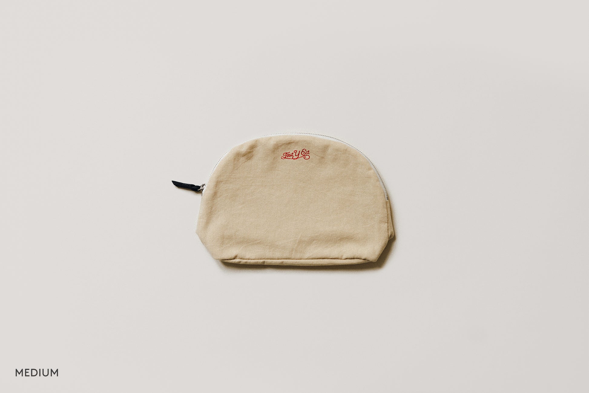 This crescent-shaped pouch is perfect for easily organizing and carrying daily essentials. The soft zipper features a leather puller for convenient use, and the interior includes a pocket to keep small items neatly stored. Its shape, with a slightly widened bottom, provides excellent storage capacity. The front is adorned with an embroidered logo, and the lining is made from the same material as the exterior, enhancing the overall quality.