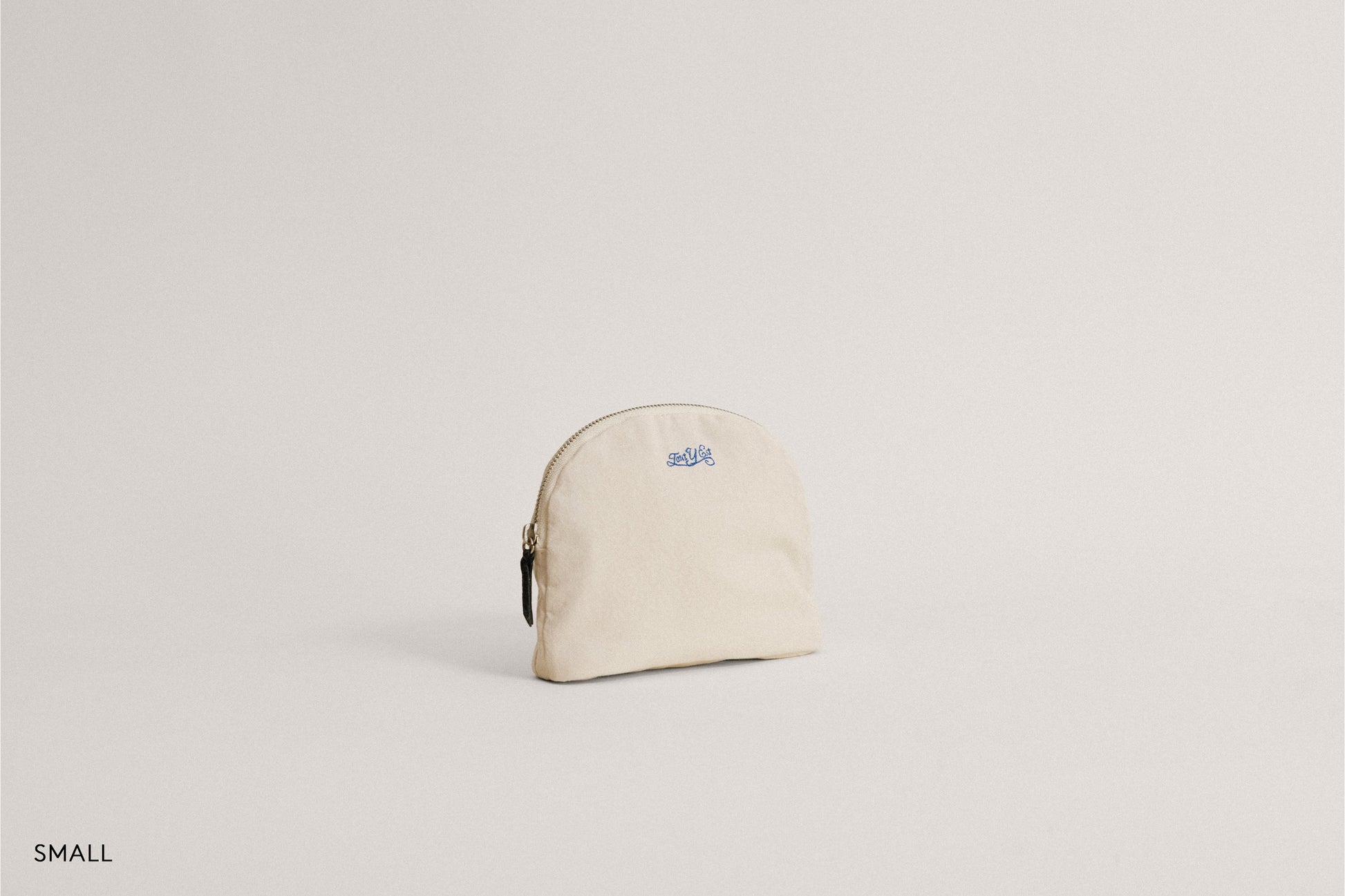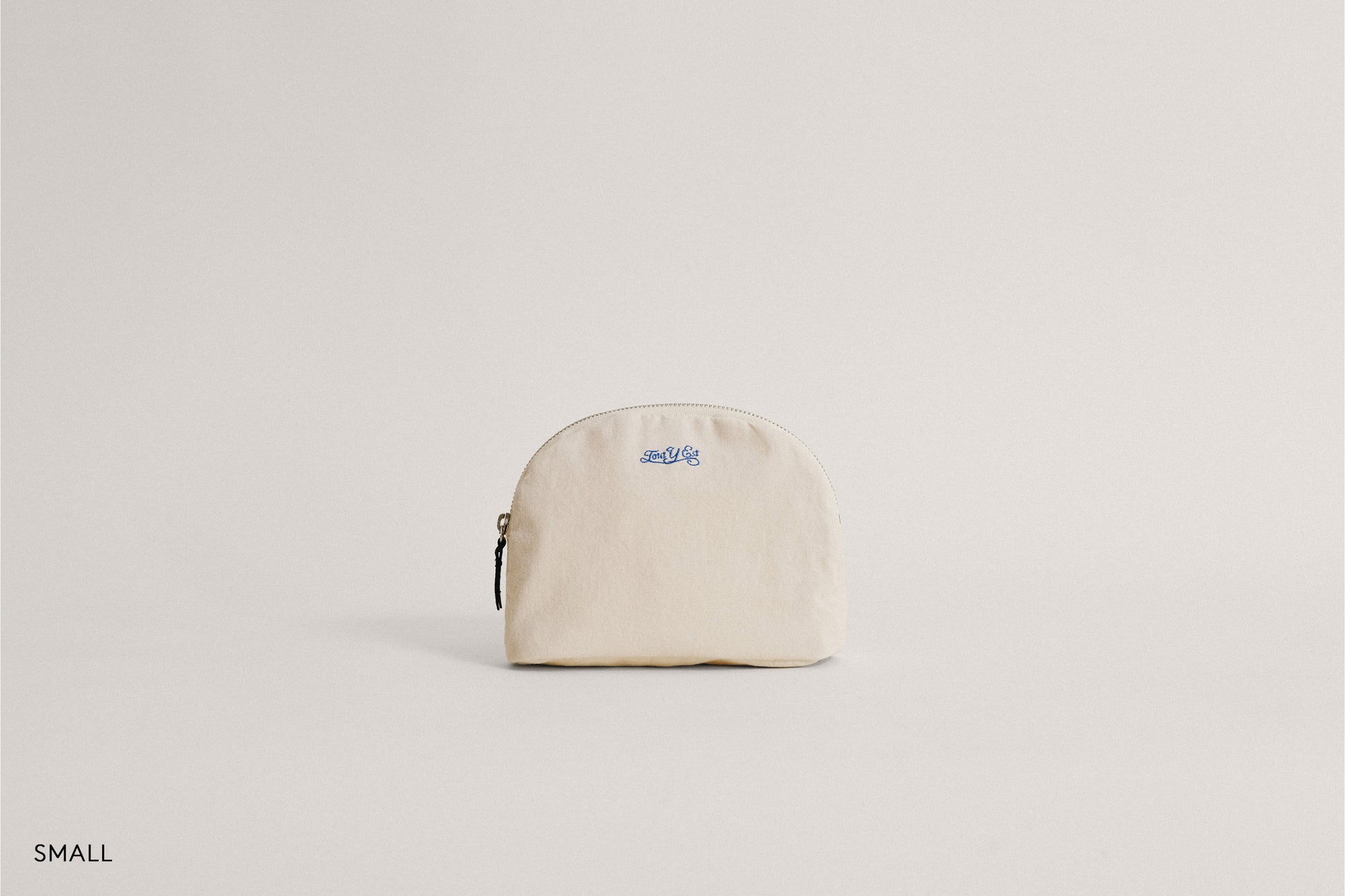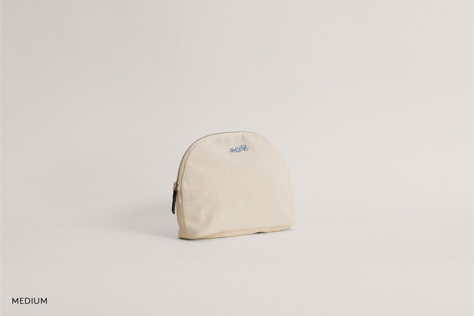 This crescent-shaped pouch is perfect for easily organizing and carrying daily essentials. The soft zipper features a leather puller for convenient use, and the interior includes a pocket to keep small items neatly stored. Its shape, with a slightly widened bottom, provides excellent storage capacity. The front is adorned with an embroidered logo, and the lining is made from the same material as the exterior, enhancing the overall quality.