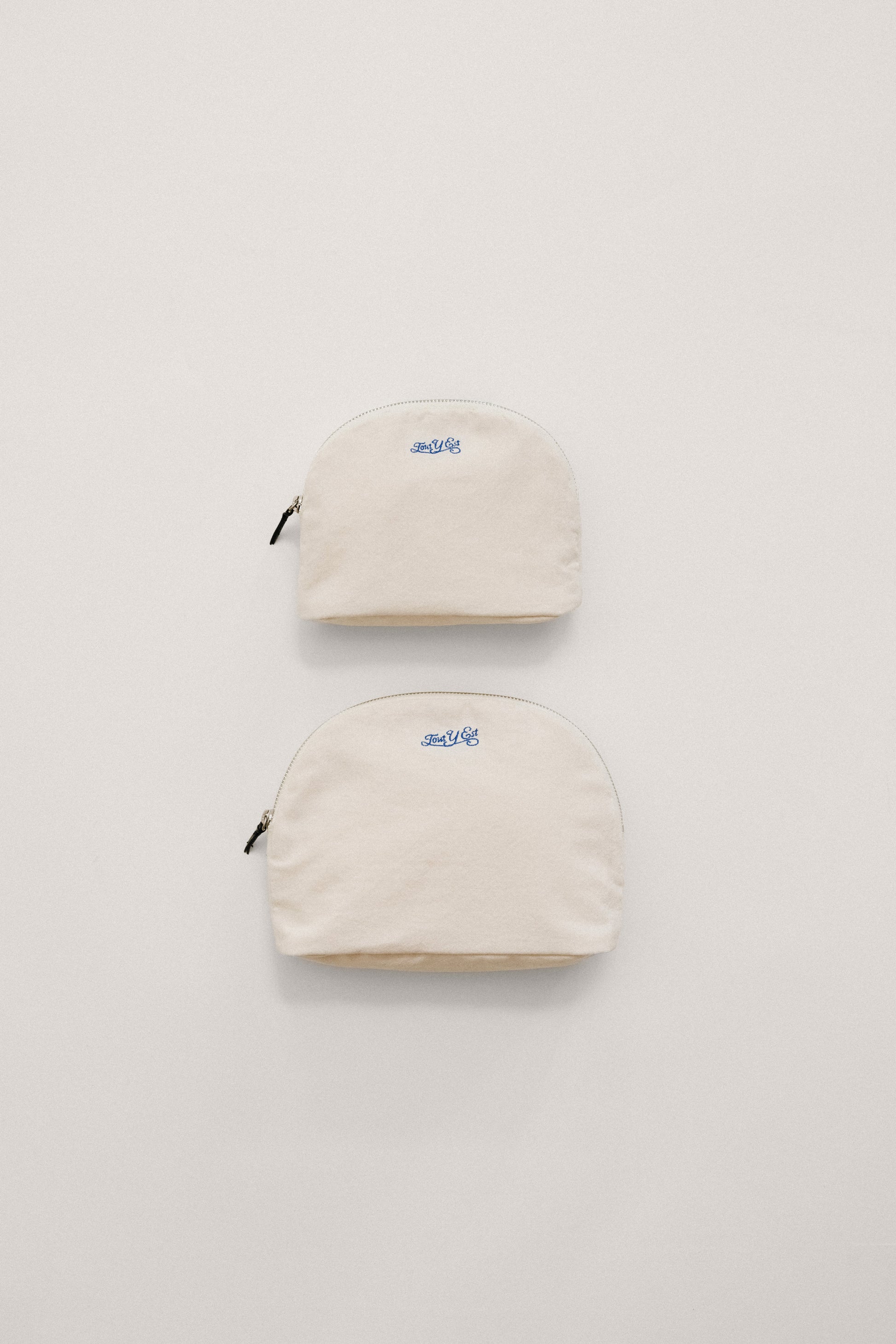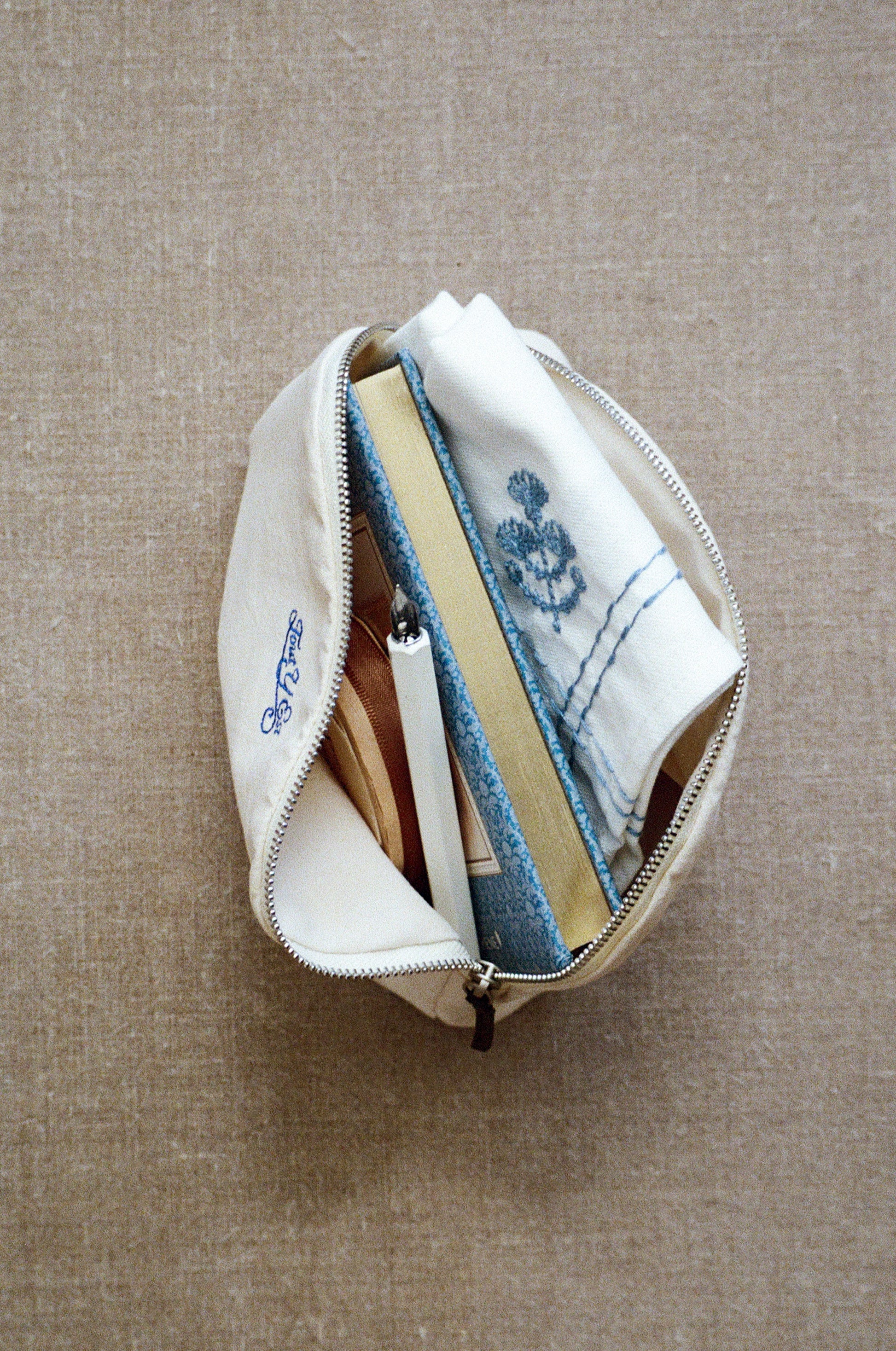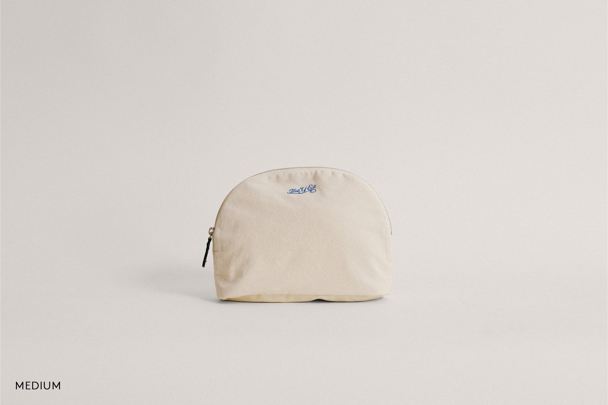 This crescent-shaped pouch is perfect for easily organizing and carrying daily essentials. The soft zipper features a leather puller for convenient use, and the interior includes a pocket to keep small items neatly stored. Its shape, with a slightly widened bottom, provides excellent storage capacity. The front is adorned with an embroidered logo, and the lining is made from the same material as the exterior, enhancing the overall quality.