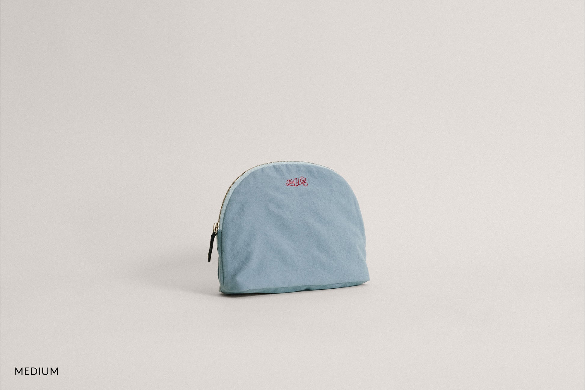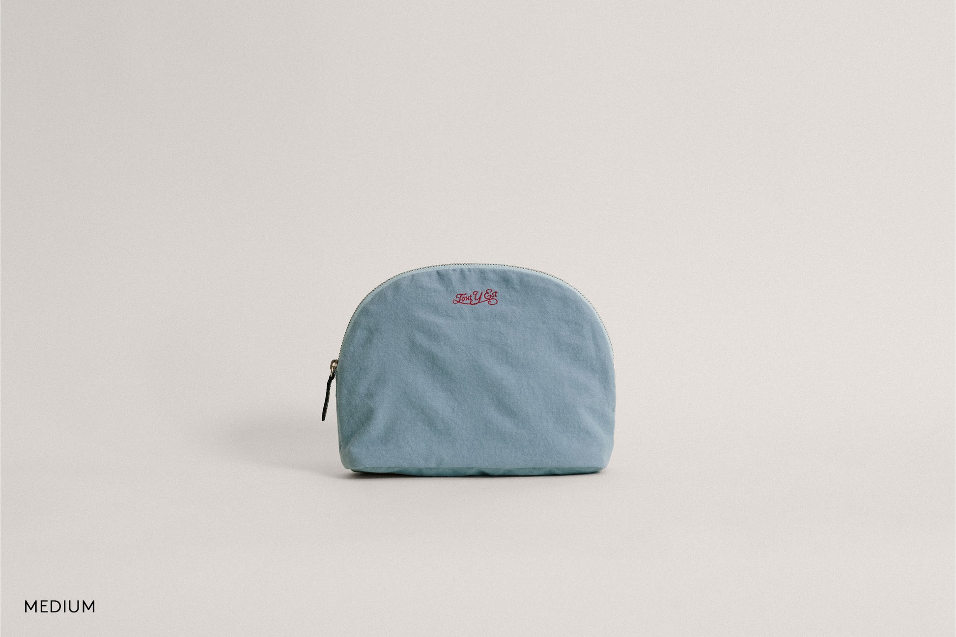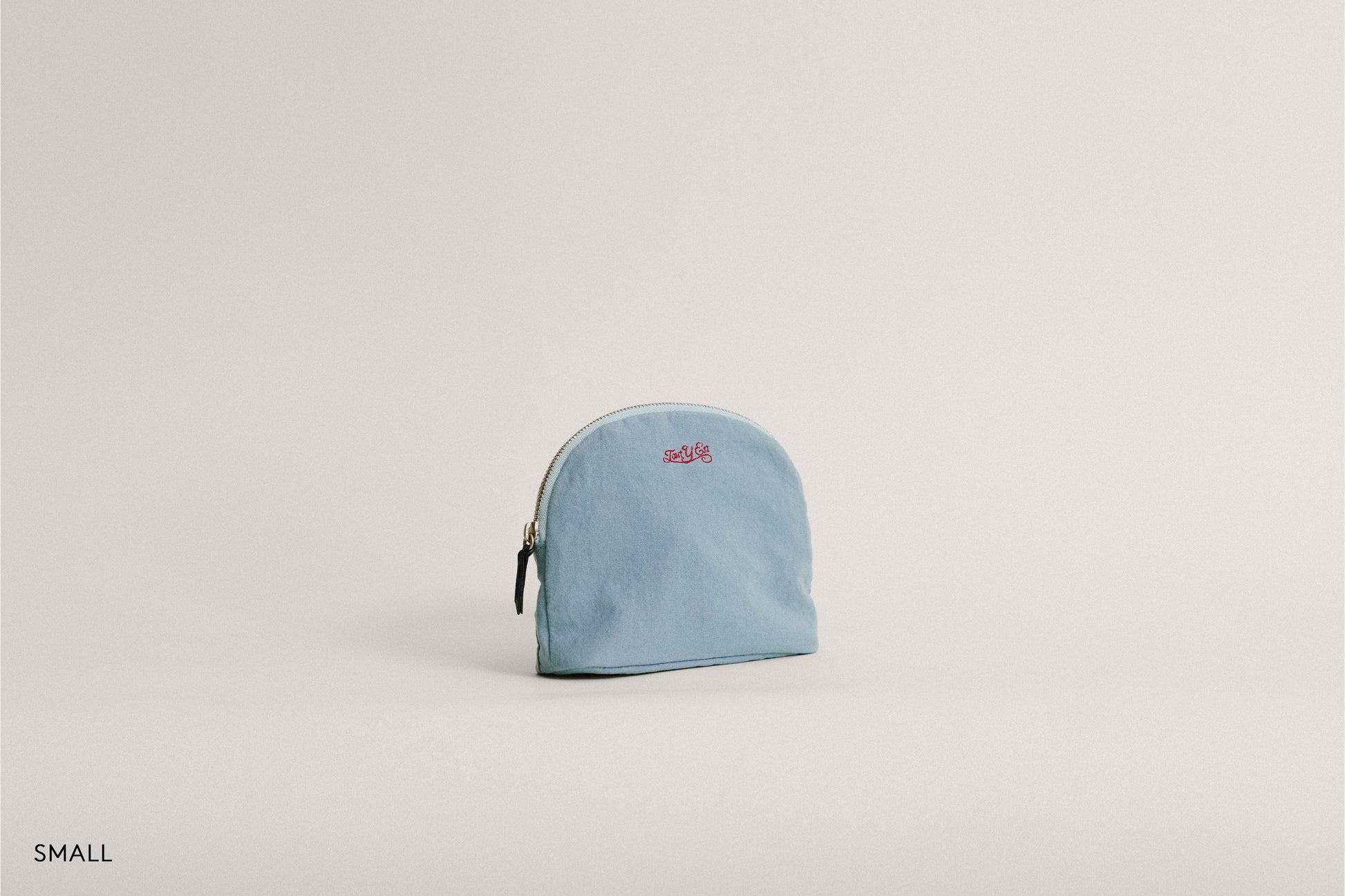 This crescent-shaped pouch is perfect for easily organizing and carrying daily essentials. The soft zipper features a leather puller for convenient use, and the interior includes a pocket to keep small items neatly stored. Its shape, with a slightly widened bottom, provides excellent storage capacity. The front is adorned with an embroidered logo, and the lining is made from the same material as the exterior, enhancing the overall quality.