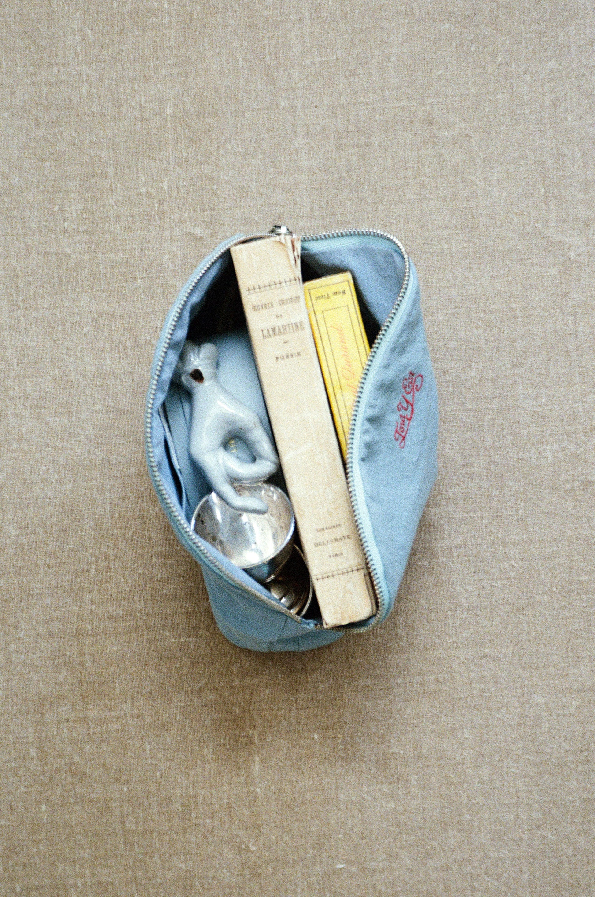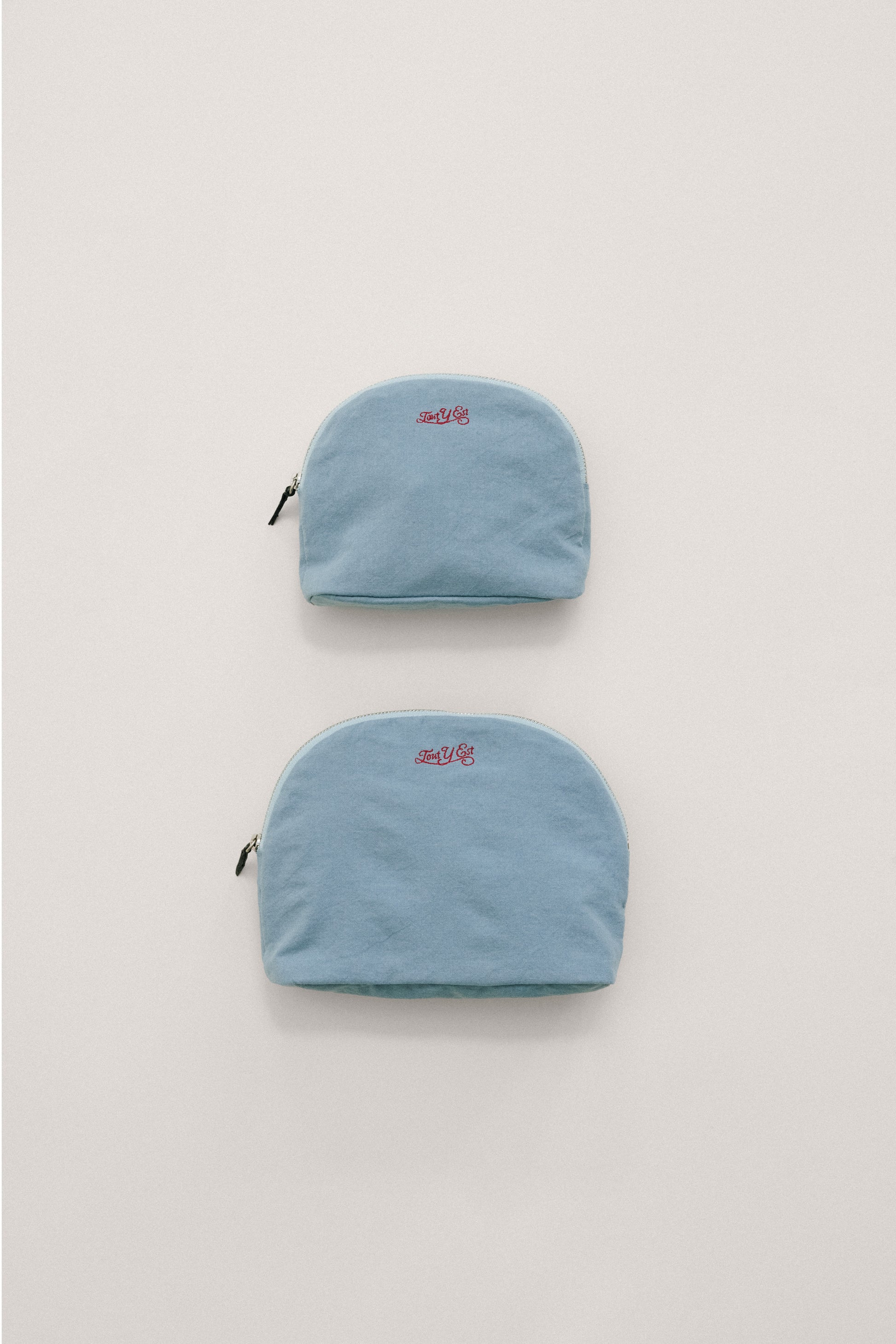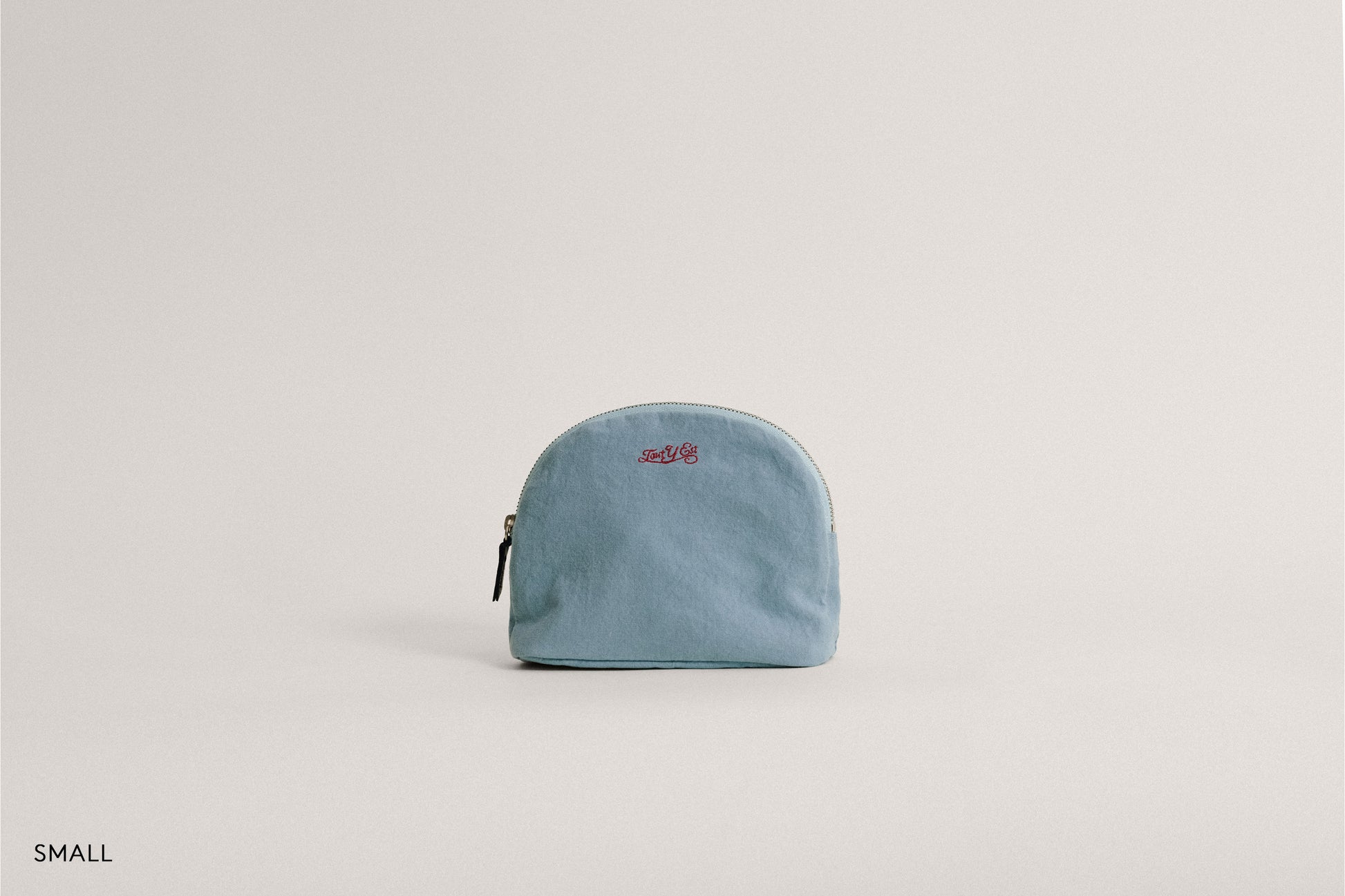 This crescent-shaped pouch is perfect for easily organizing and carrying daily essentials. The soft zipper features a leather puller for convenient use, and the interior includes a pocket to keep small items neatly stored. Its shape, with a slightly widened bottom, provides excellent storage capacity. The front is adorned with an embroidered logo, and the lining is made from the same material as the exterior, enhancing the overall quality.