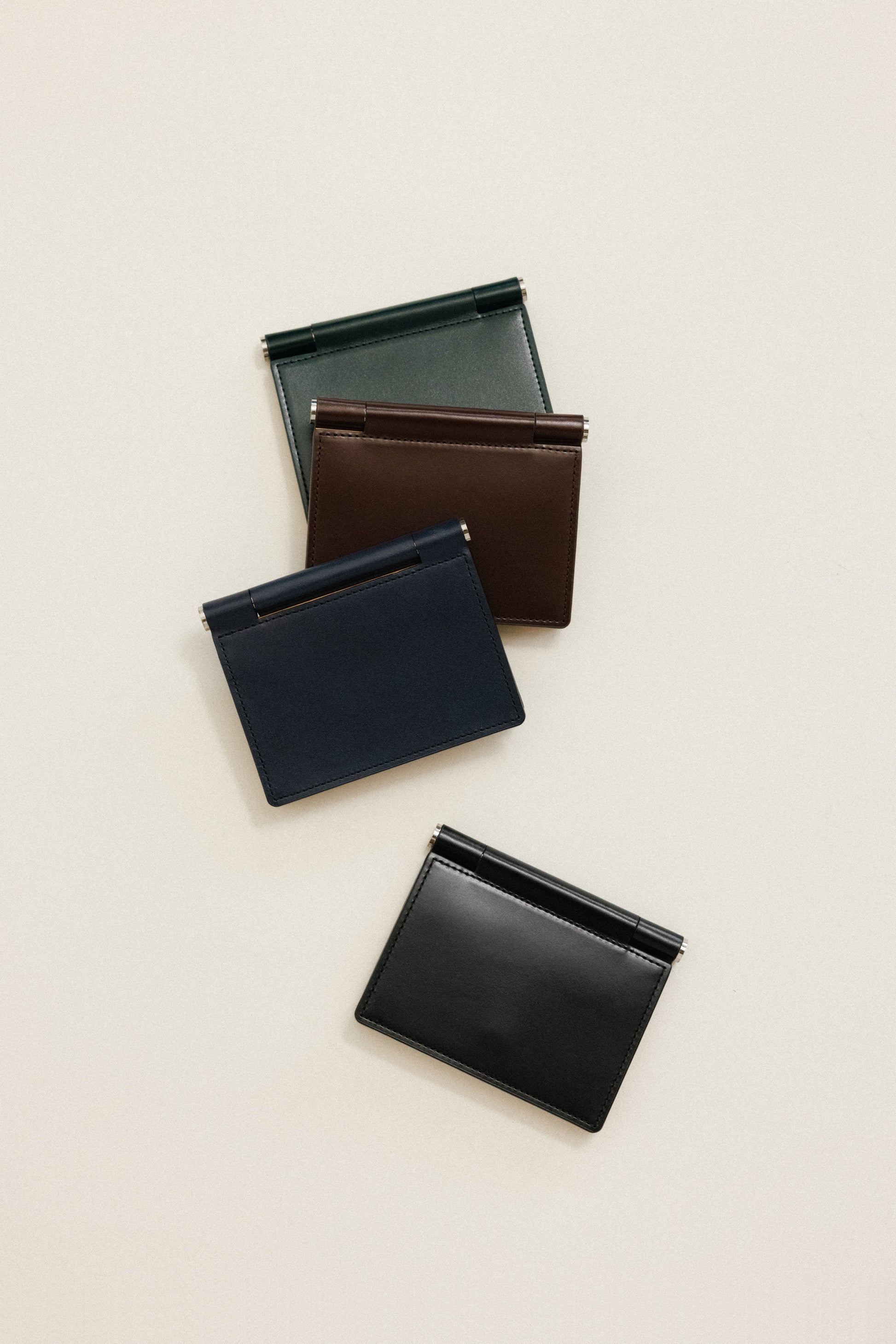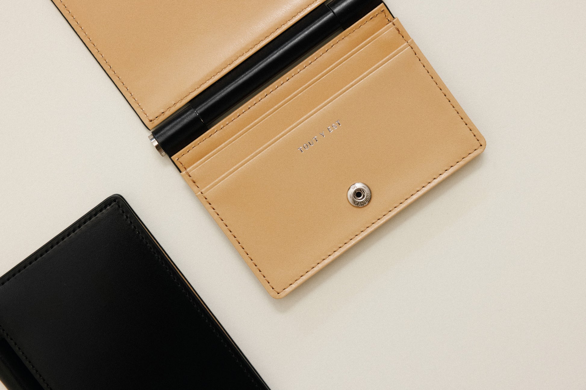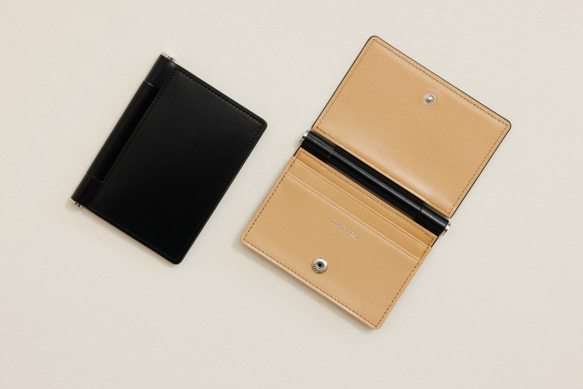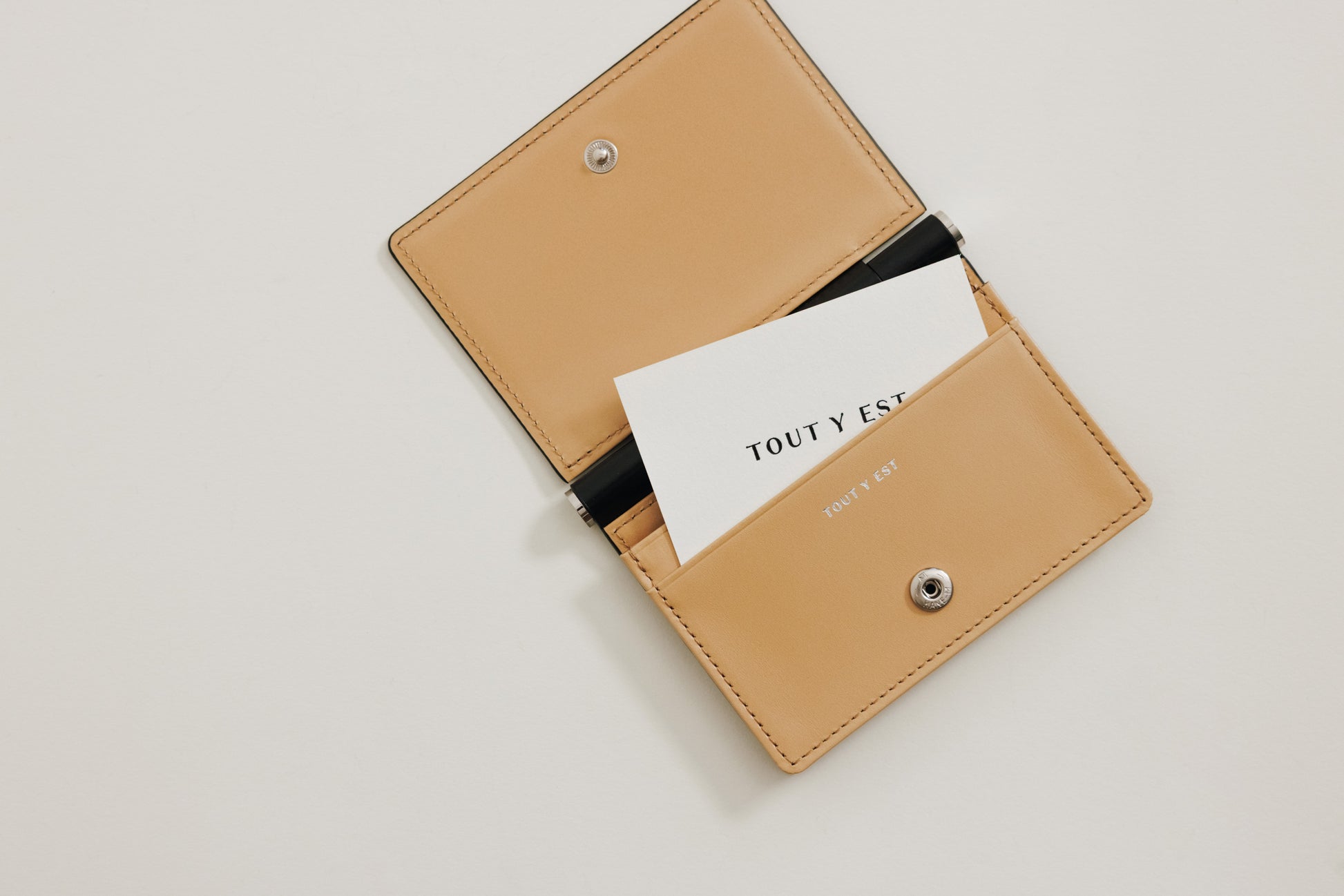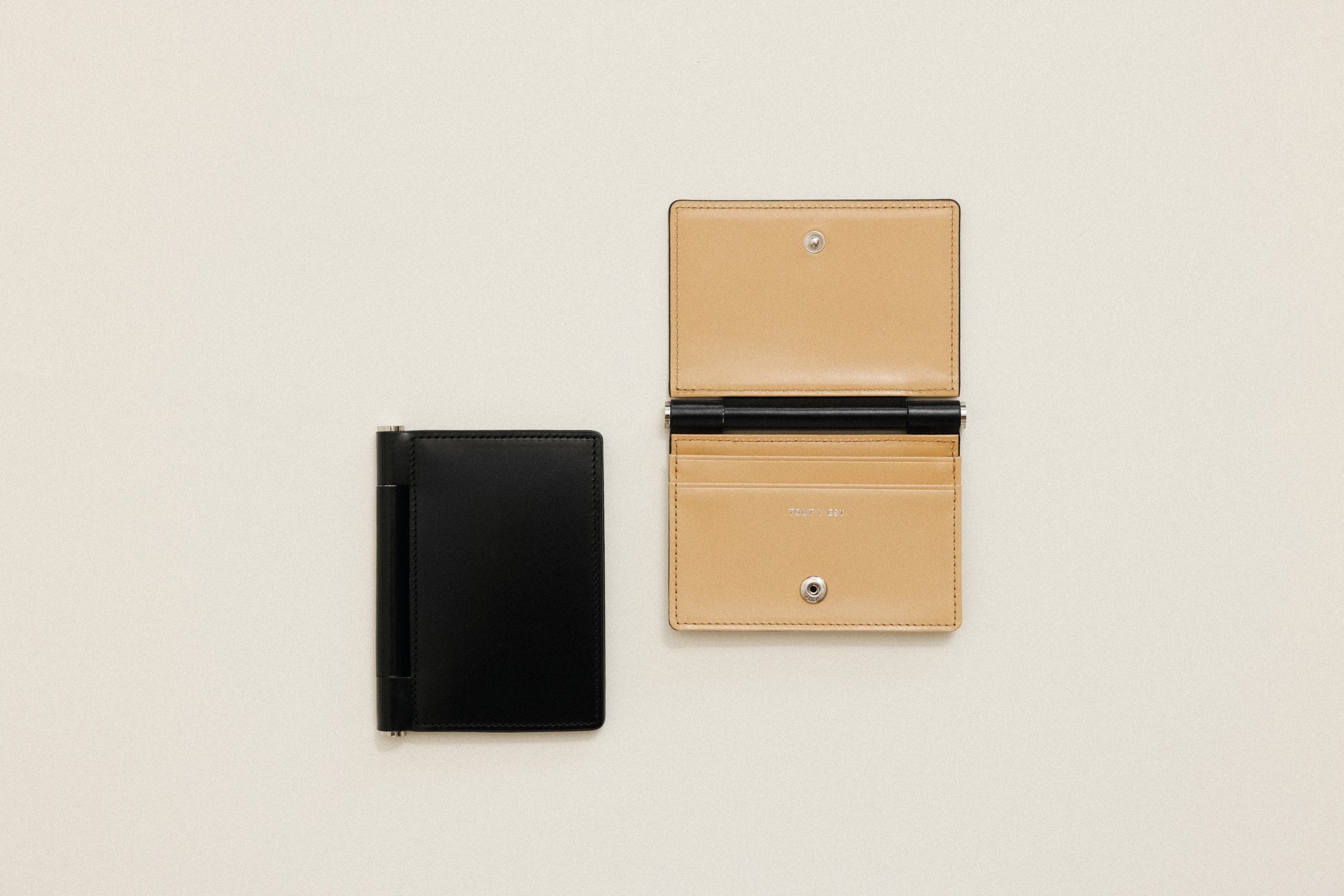 Featuring TOUT Y EST's iconic brass bar decoration, the PAUMELLE business card holder comes with a fully foldable flap around the bar, allowing comfortable access to your belongings. Divided into a spacious compartment and card slot, it makes it easy to separately store frequently used cards. The holder can be opened and closed using snaps and can store around 10 cards.
