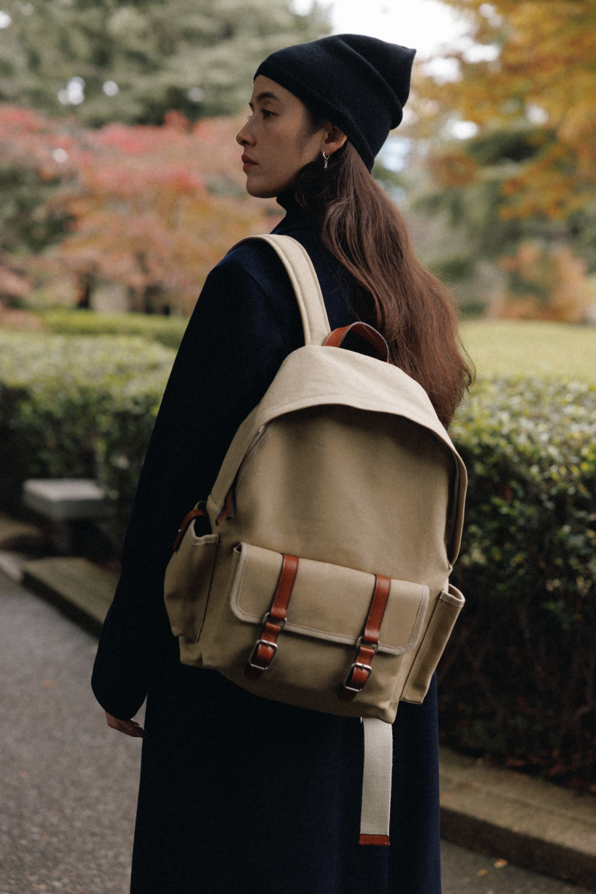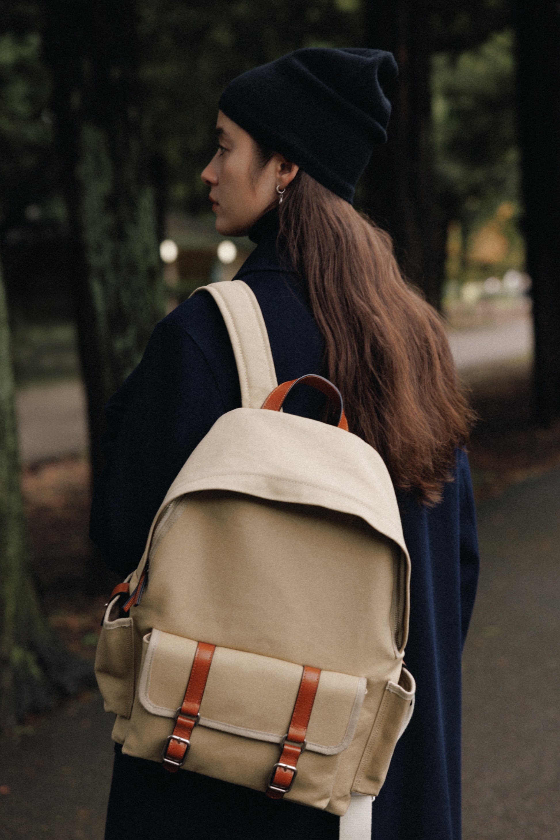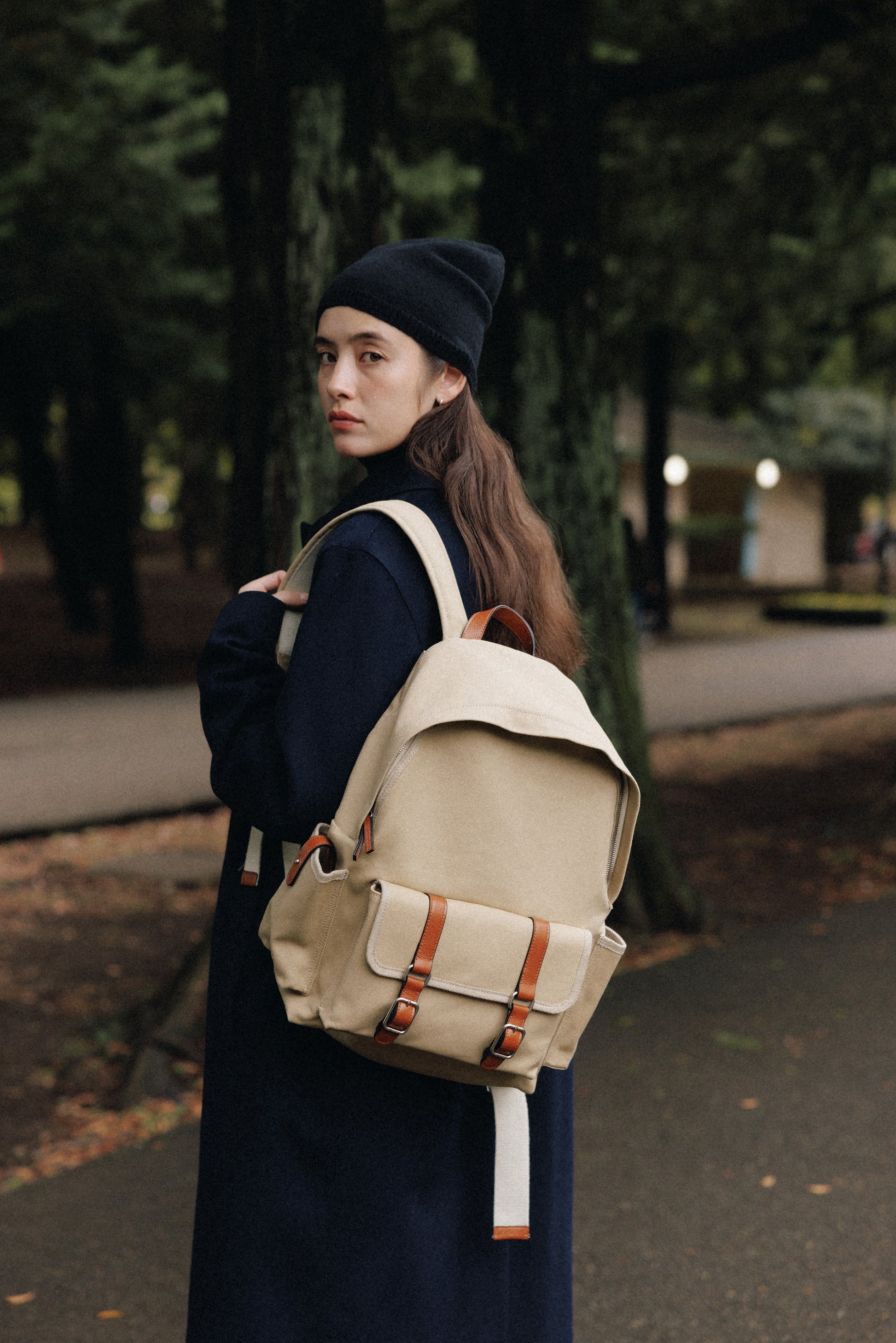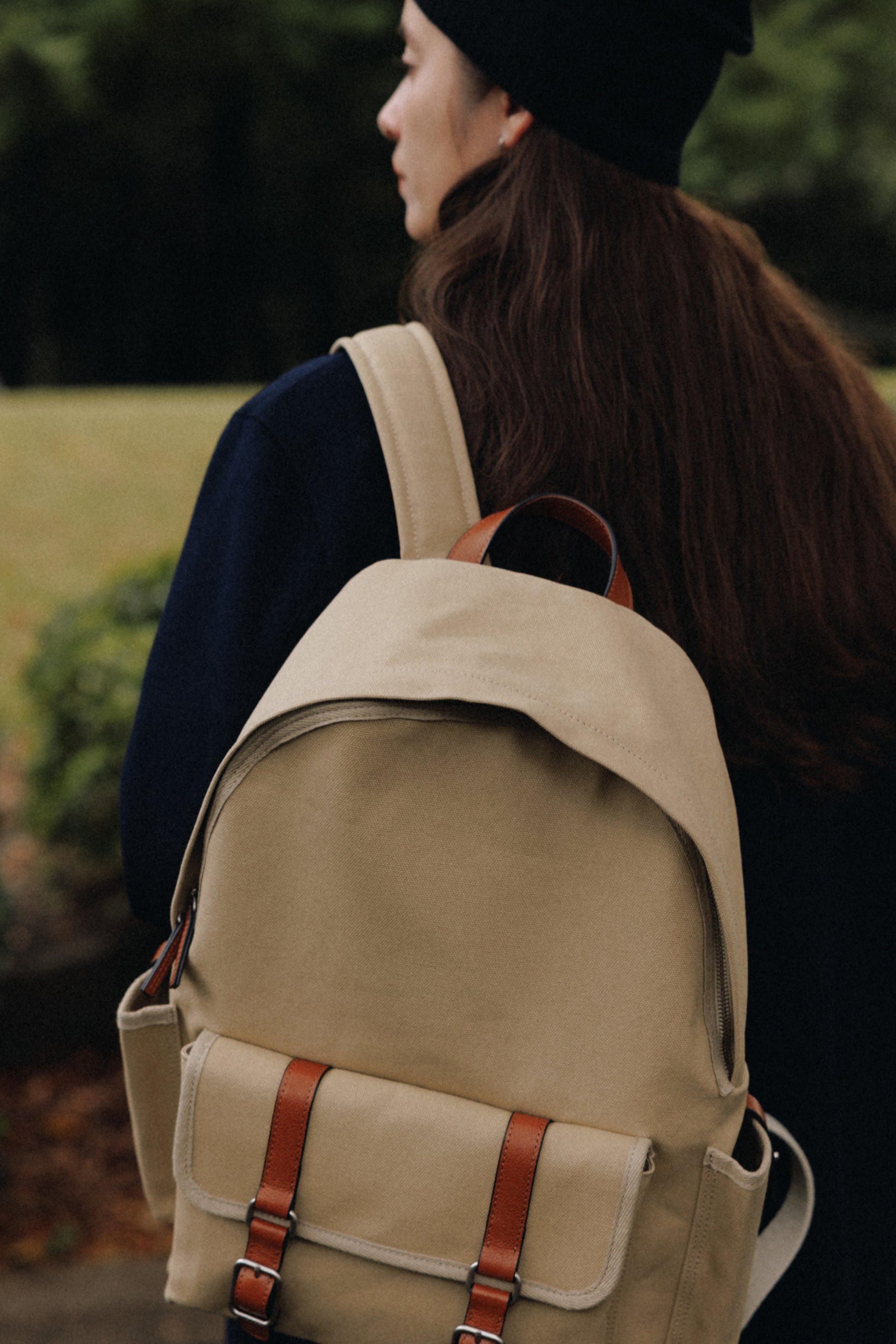 This backpack version is designed based on the signature details of Sac Bout series. Crafted from cotton canvas with partial cow leather accents, it offers a well-balanced and structured silhouette. The front features the series’ iconic buckle pocket, while additional pockets on both sides provide convenient storage for small essentials. The spacious main compartment is secured with a zipper closure, and the interior includes a leather-trimmed zip pocket for organized storage. The shoulder straps are made with ample padding to reduce strain during wear, and a leather top handle ensures comfortable hand carrying.