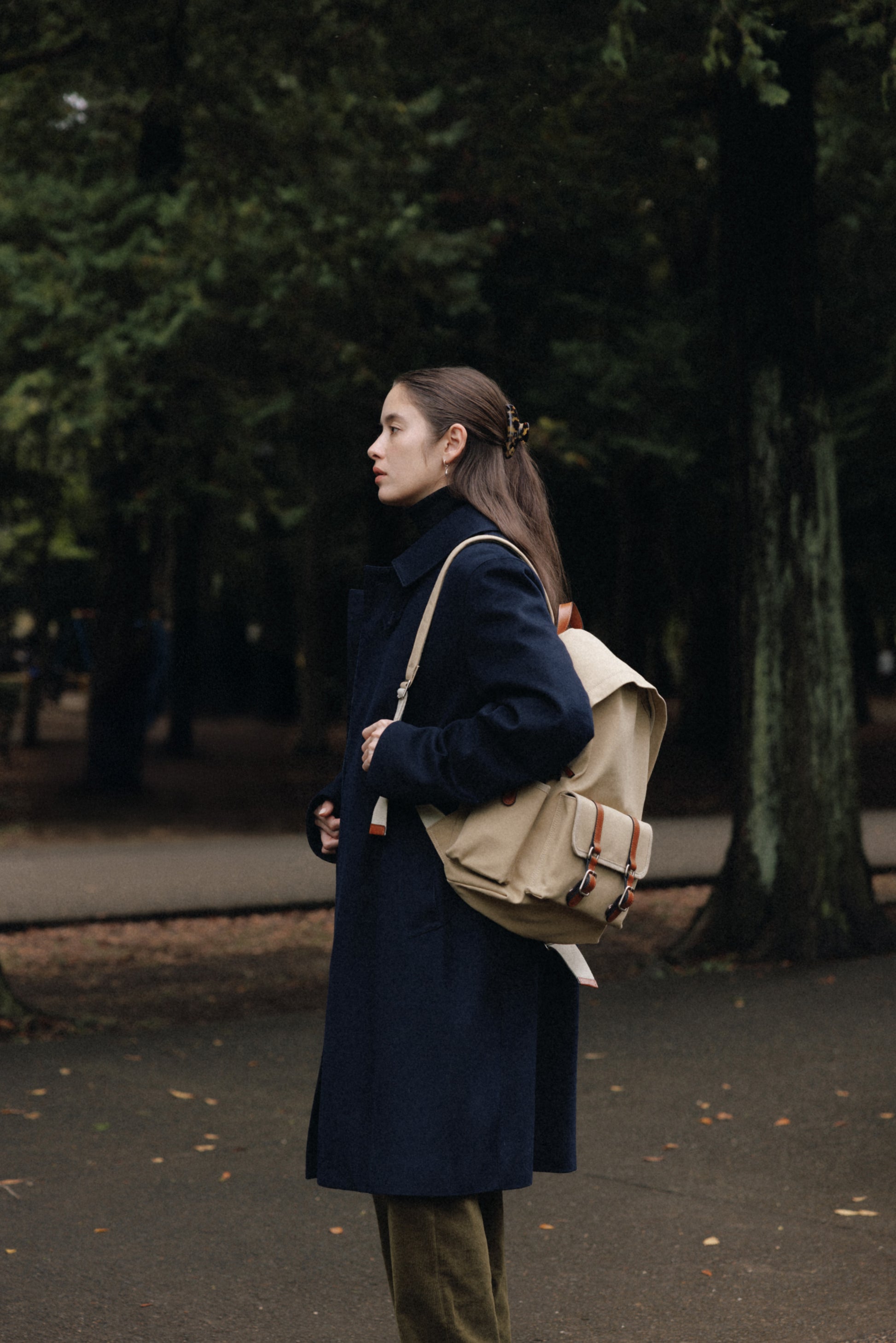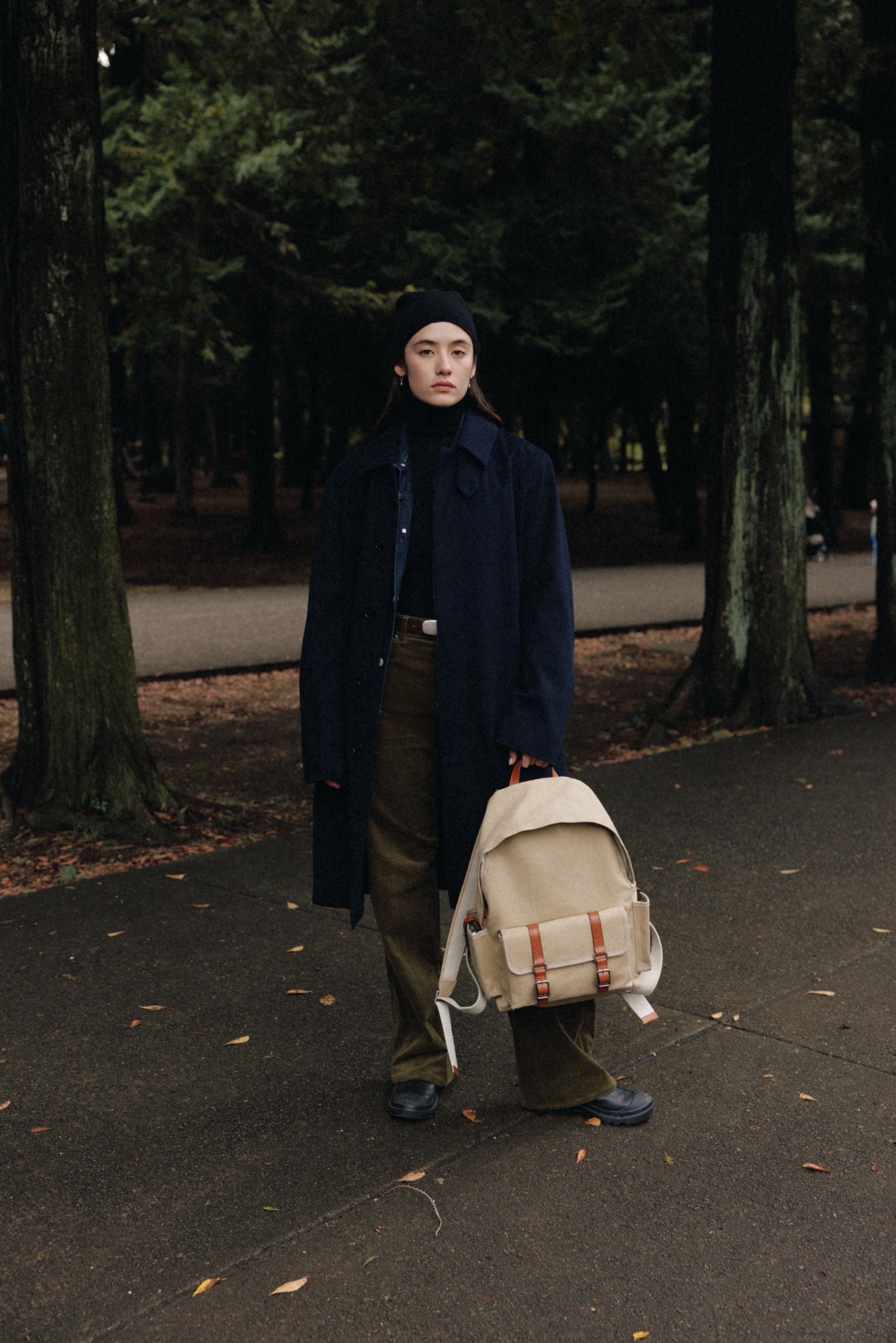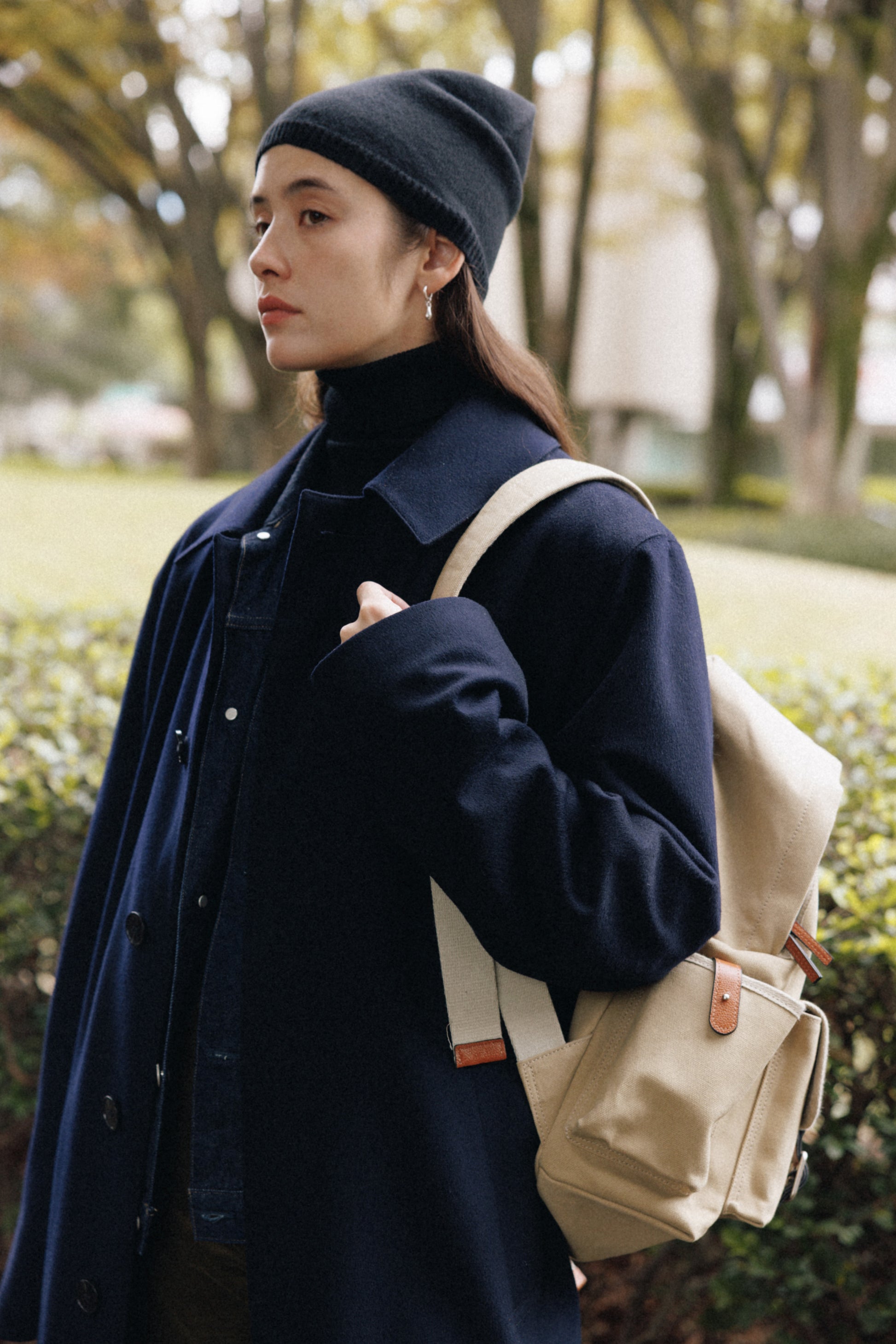 This backpack version is designed based on the signature details of Sac Bout series. Crafted from cotton canvas with partial cow leather accents, it offers a well-balanced and structured silhouette. The front features the series’ iconic buckle pocket, while additional pockets on both sides provide convenient storage for small essentials. The spacious main compartment is secured with a zipper closure, and the interior includes a leather-trimmed zip pocket for organized storage. The shoulder straps are made with ample padding to reduce strain during wear, and a leather top handle ensures comfortable hand carrying.