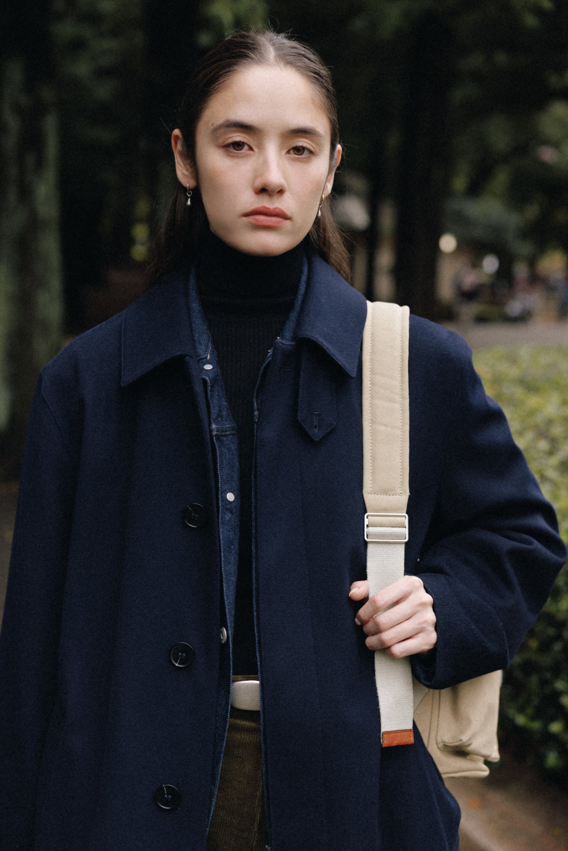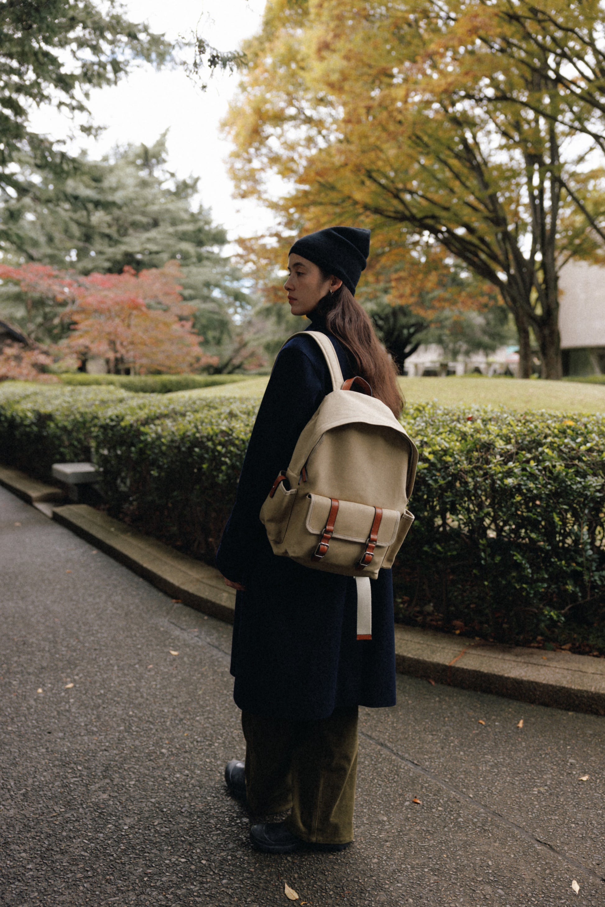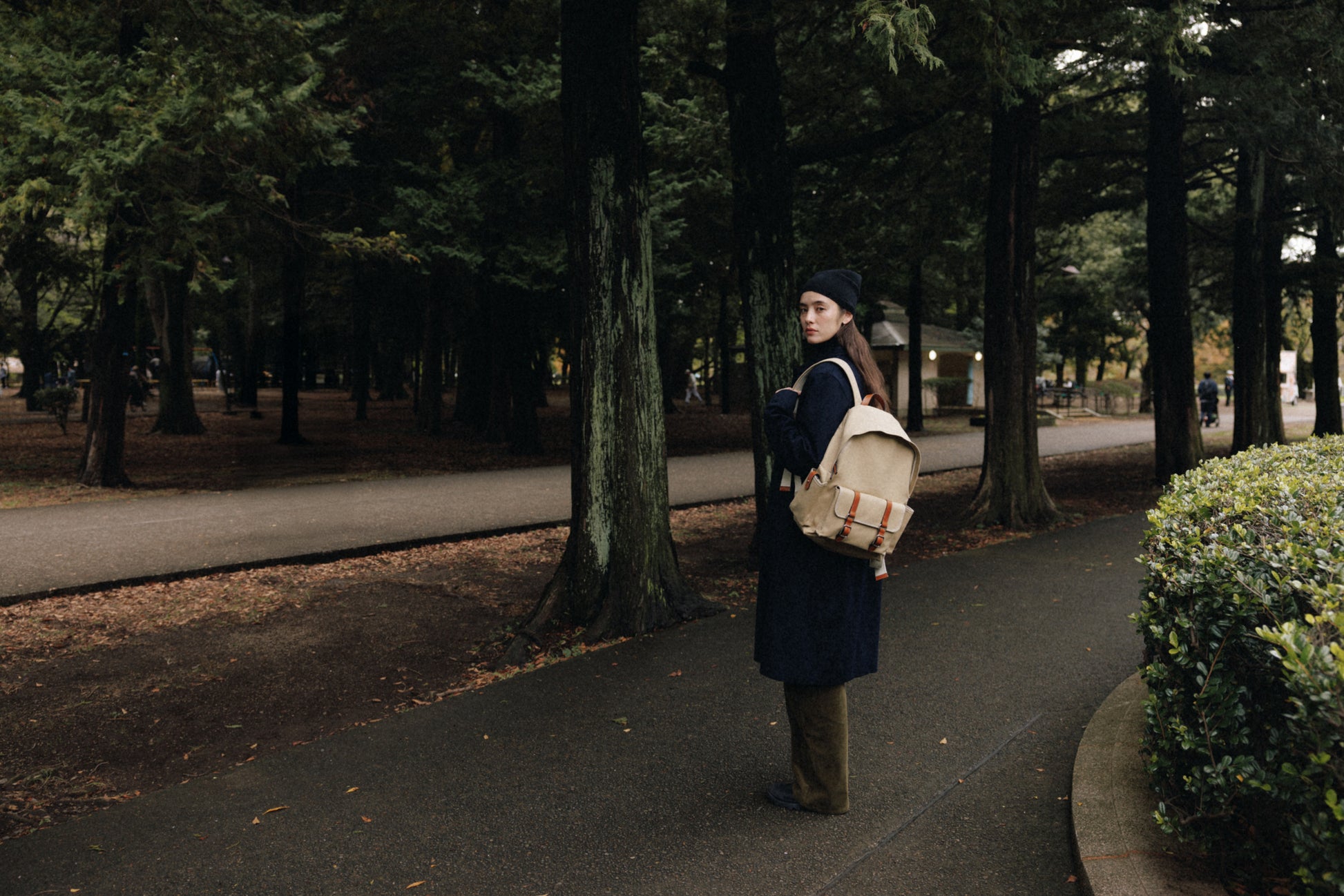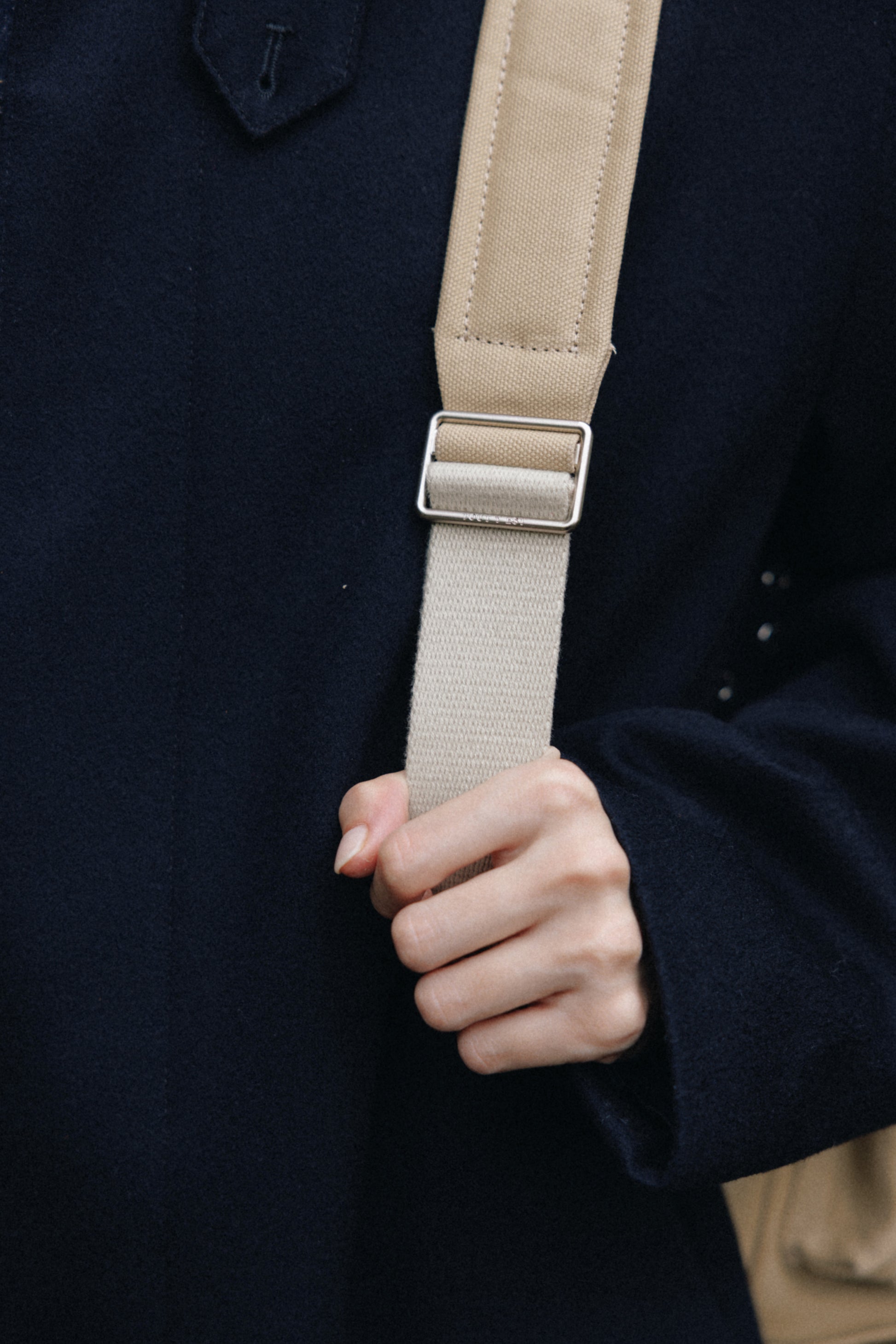 This backpack version is designed based on the signature details of Sac Bout series. Crafted from cotton canvas with partial cow leather accents, it offers a well-balanced and structured silhouette. The front features the series’ iconic buckle pocket, while additional pockets on both sides provide convenient storage for small essentials. The spacious main compartment is secured with a zipper closure, and the interior includes a leather-trimmed zip pocket for organized storage. The shoulder straps are made with ample padding to reduce strain during wear, and a leather top handle ensures comfortable hand carrying.