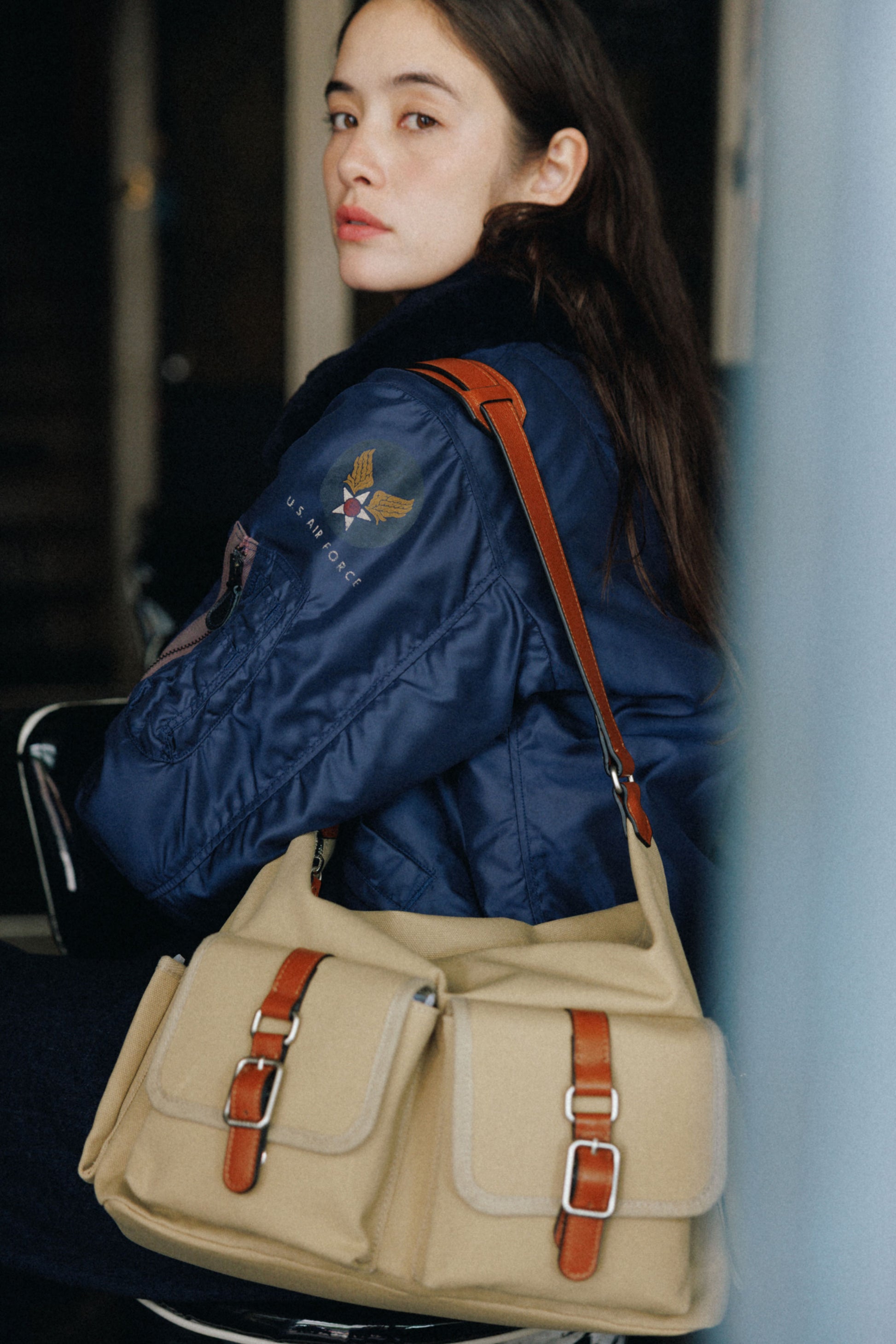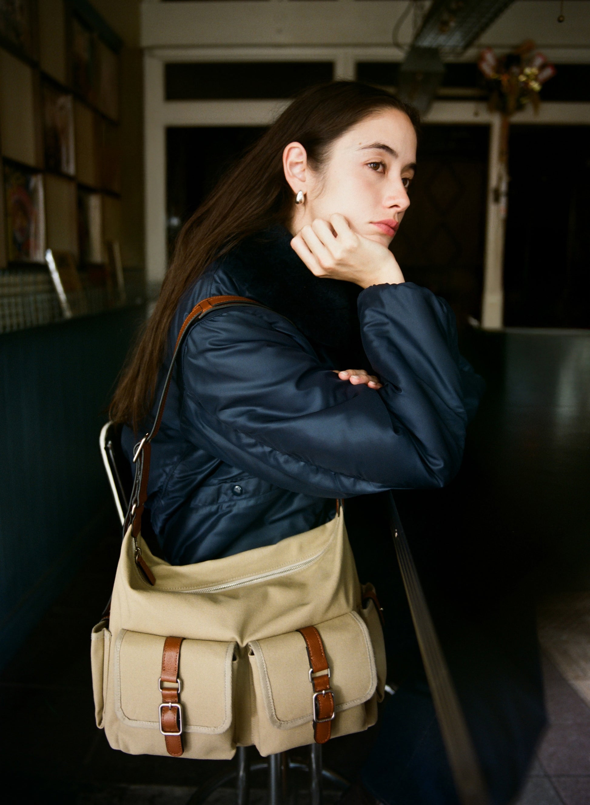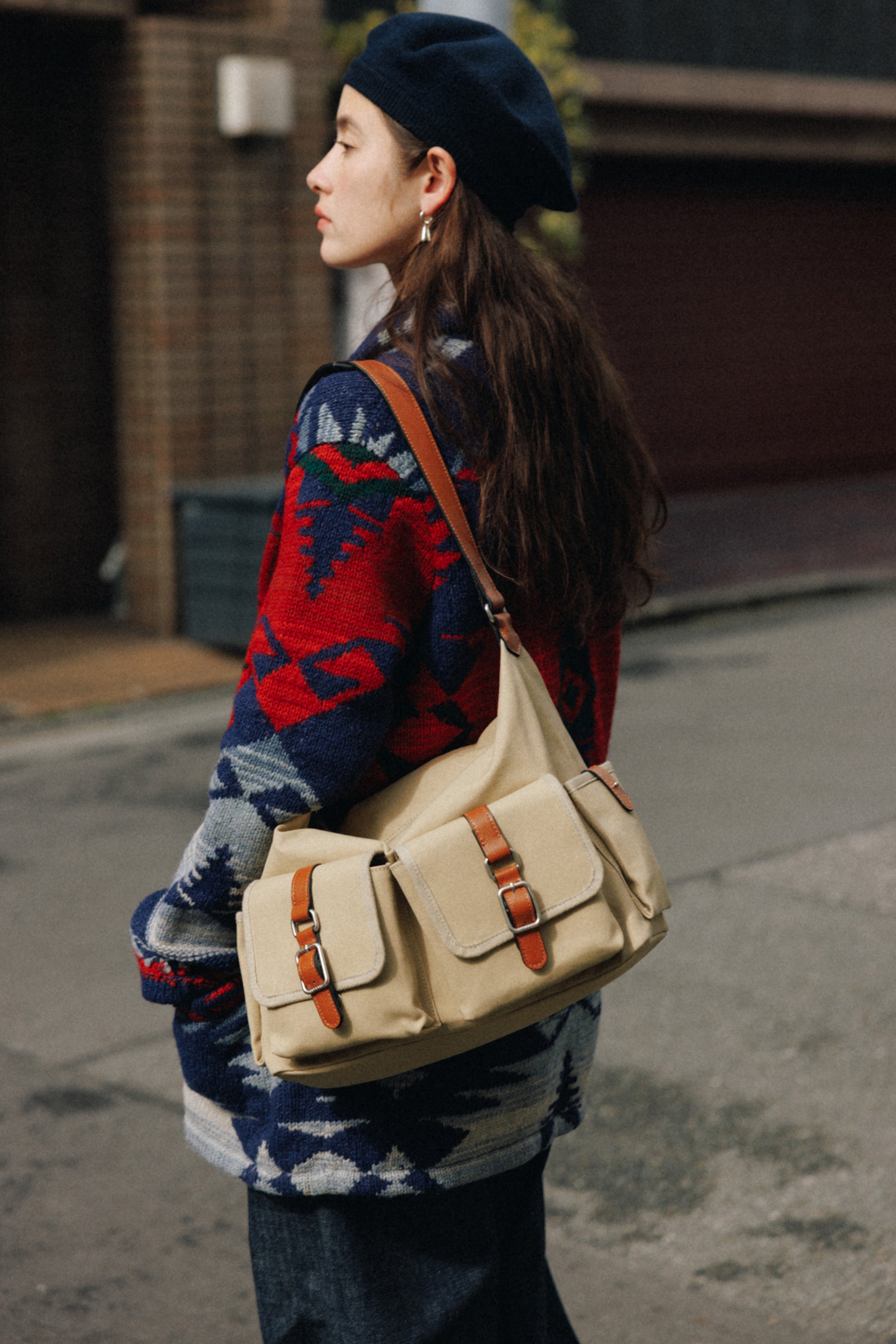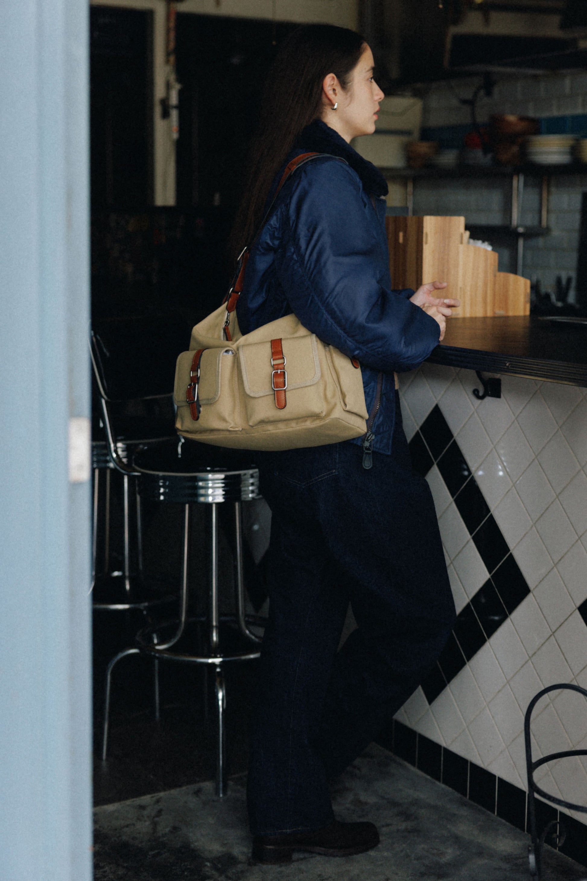 The softly curved silhouette creates a gentler impression compared to the original Bout Bag, and the top zipper closure adds convenience for everyday use. The front features the iconic leather-buckle pocket from the Bout line, while an additional side pocket offers extra storage. The cowhide strap includes a shoulder pad for enhanced comfort, and its adjustable length allows both shoulder and crossbody wear.