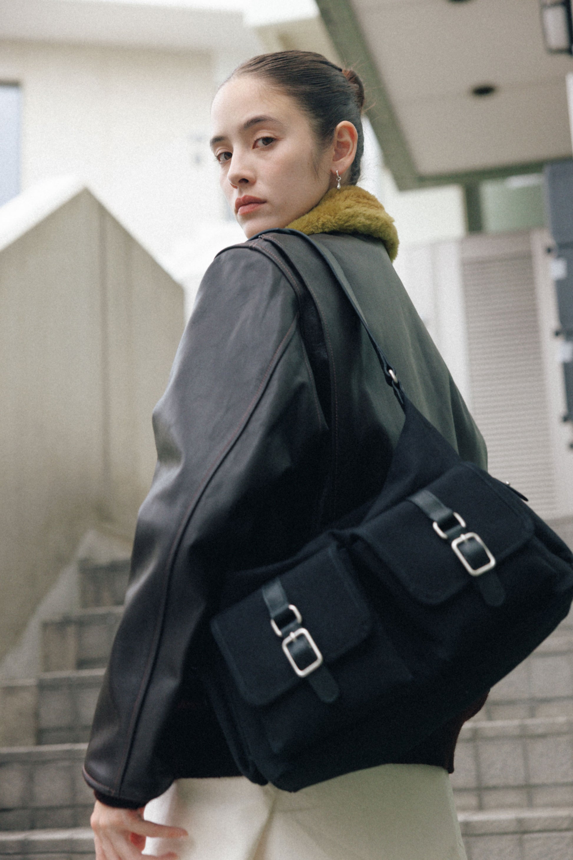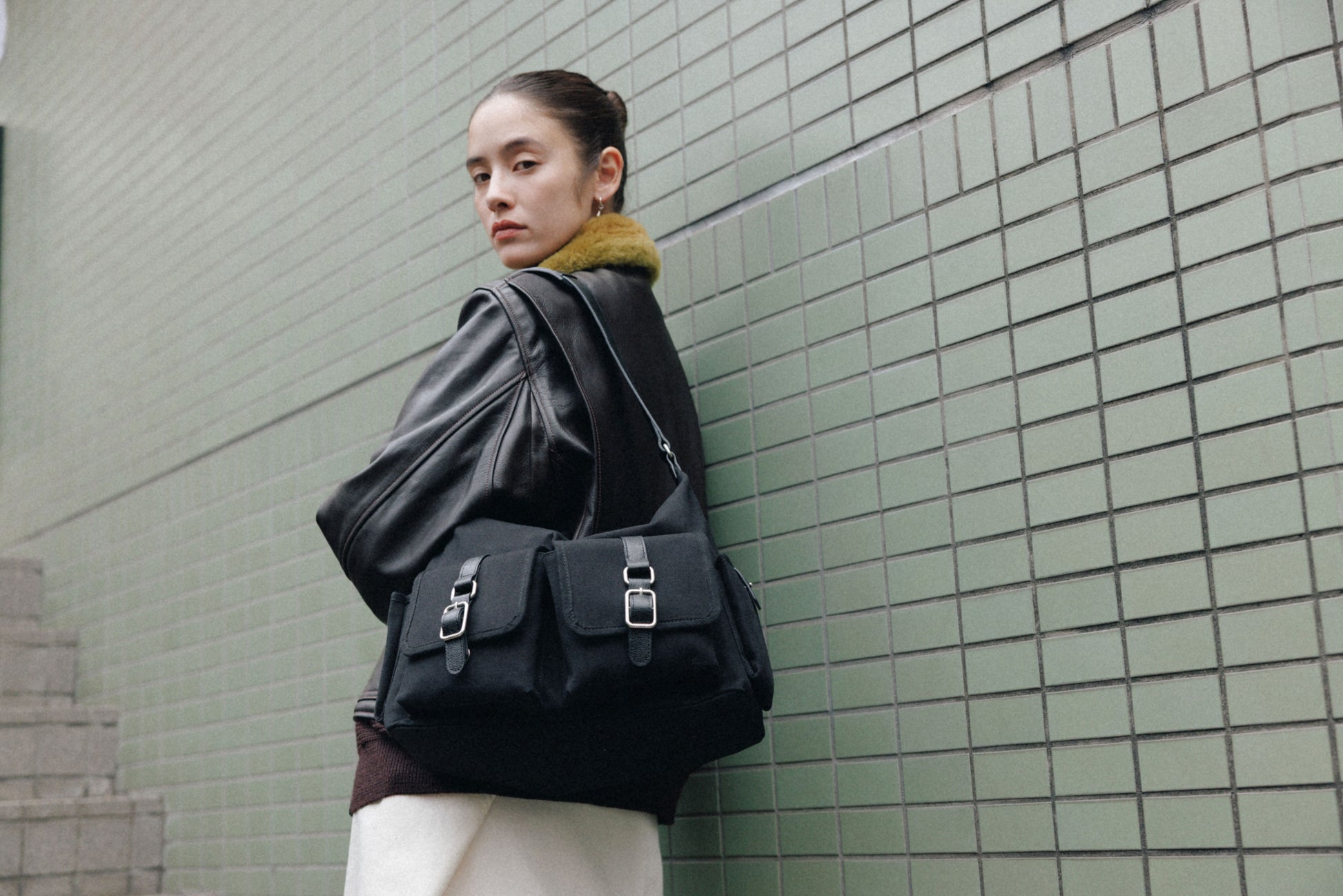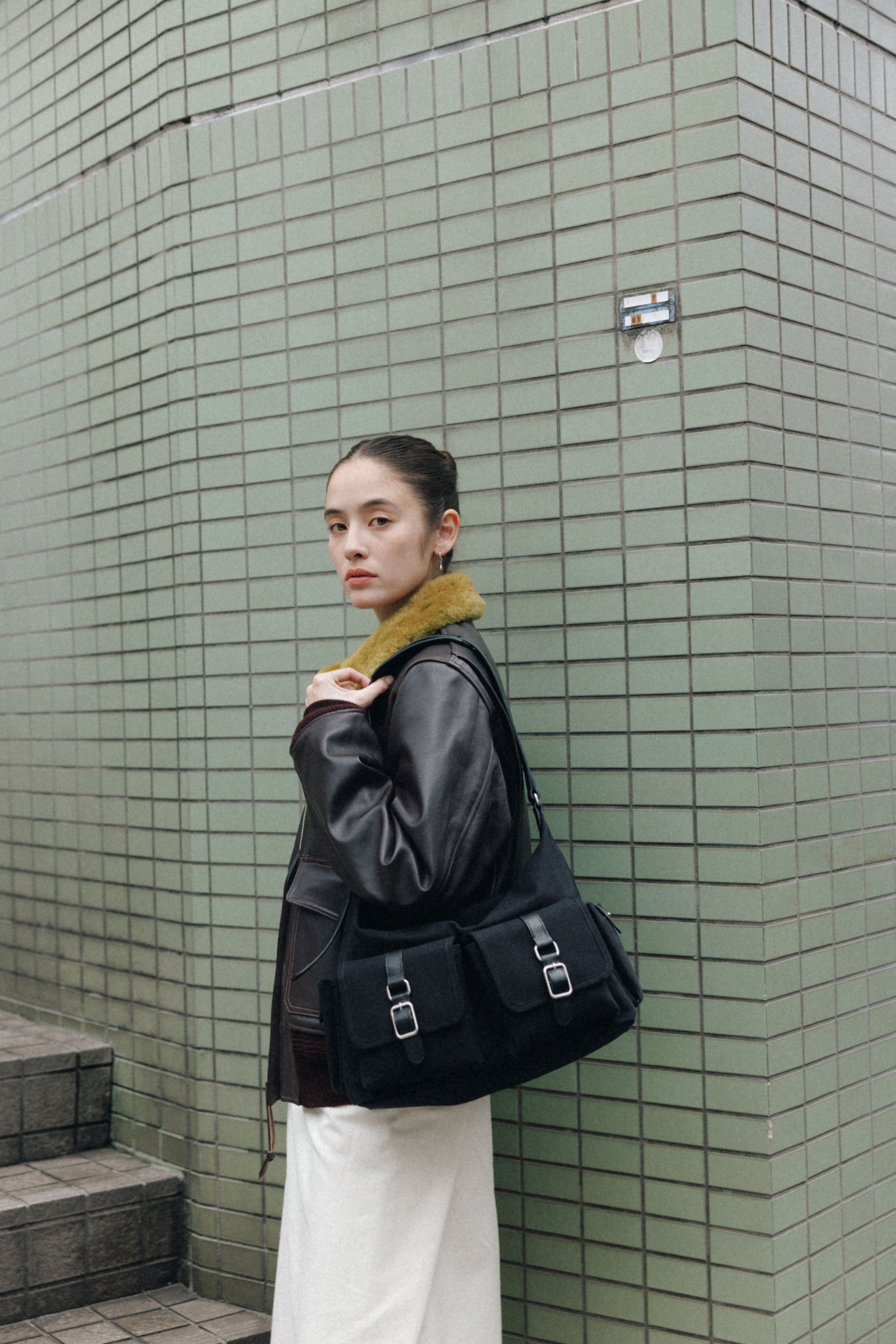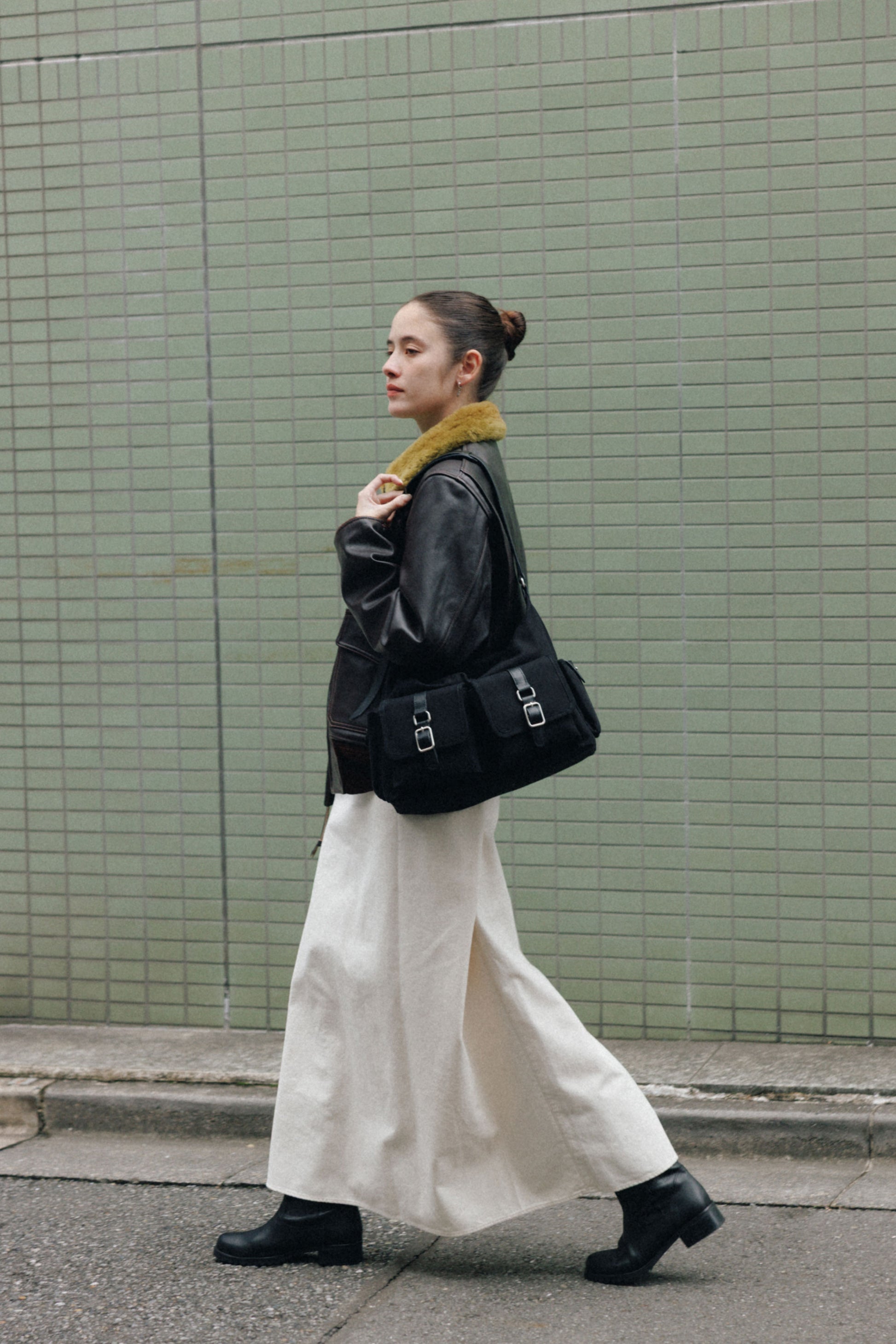 The softly curved silhouette creates a gentler impression compared to the original Bout Bag, and the top zipper closure adds convenience for everyday use. The front features the iconic leather-buckle pocket from the Bout line, while an additional side pocket offers extra storage. The cowhide strap includes a shoulder pad for enhanced comfort, and its adjustable length allows both shoulder and crossbody wear.