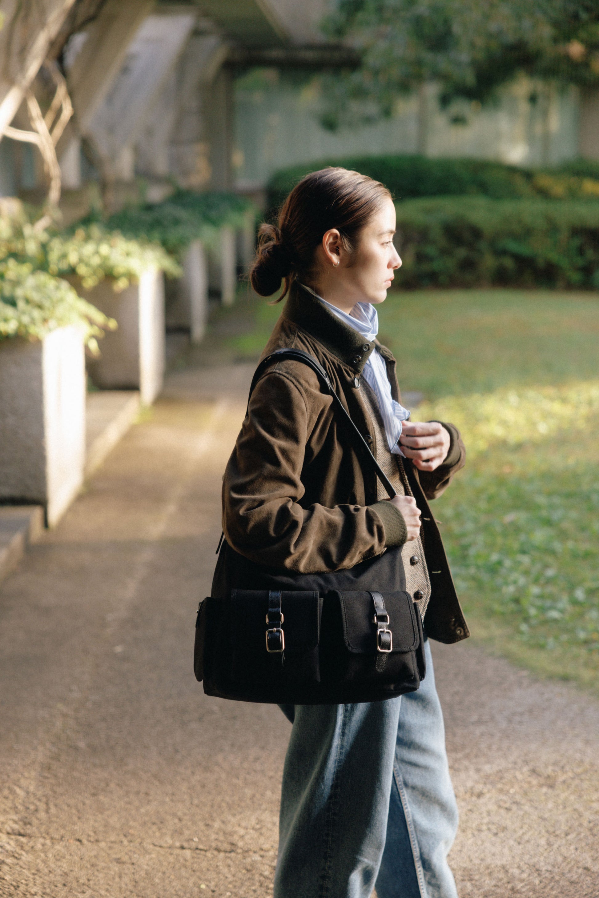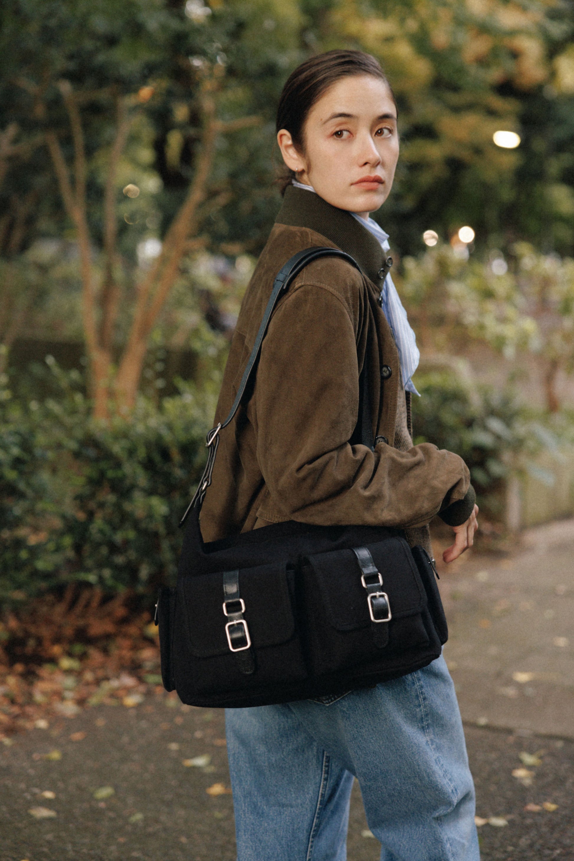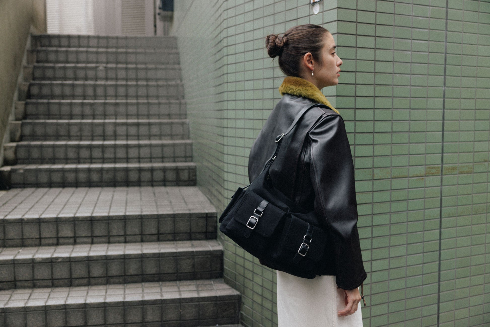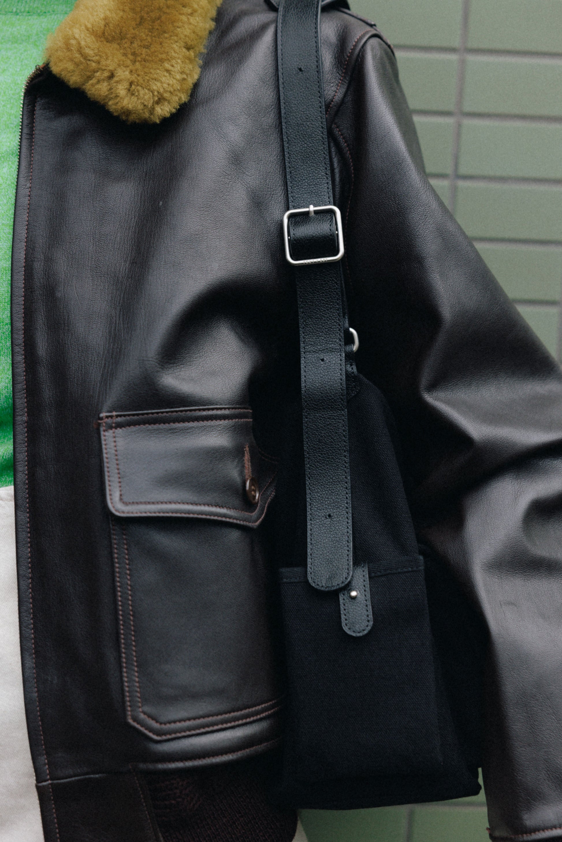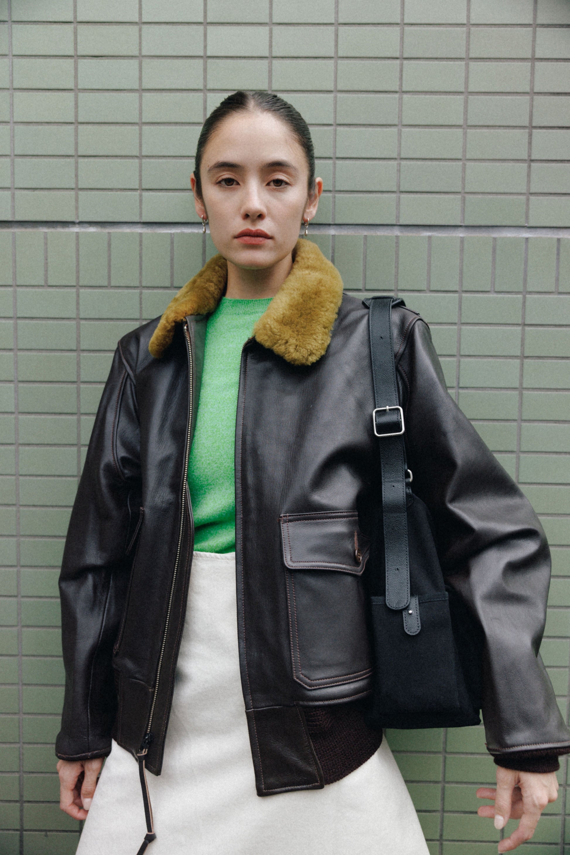 The softly curved silhouette creates a gentler impression compared to the original Bout Bag, and the top zipper closure adds convenience for everyday use. The front features the iconic leather-buckle pocket from the Bout line, while an additional side pocket offers extra storage. The cowhide strap includes a shoulder pad for enhanced comfort, and its adjustable length allows both shoulder and crossbody wear.
