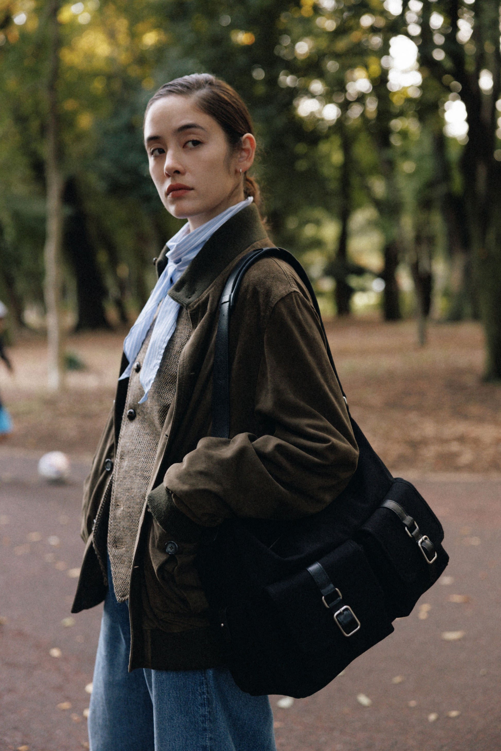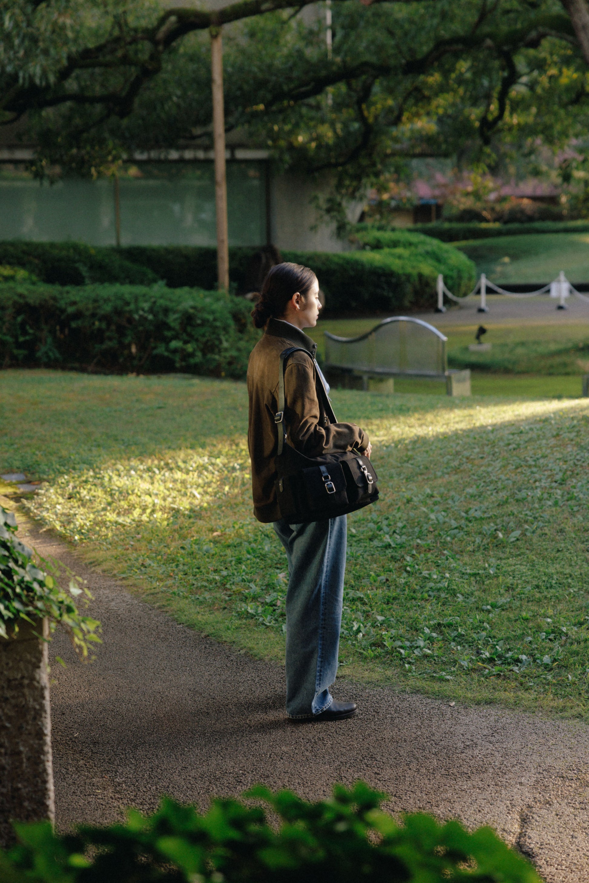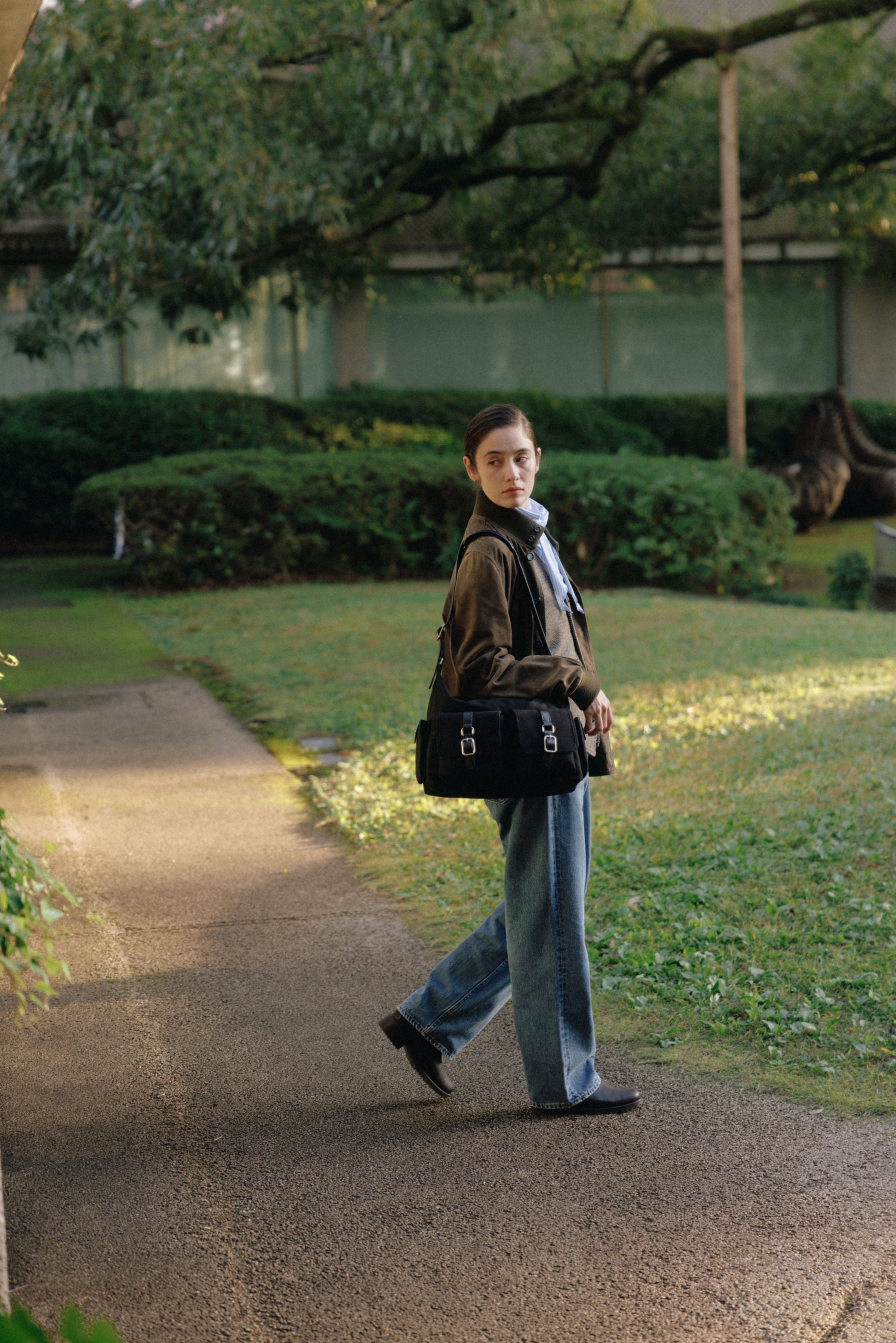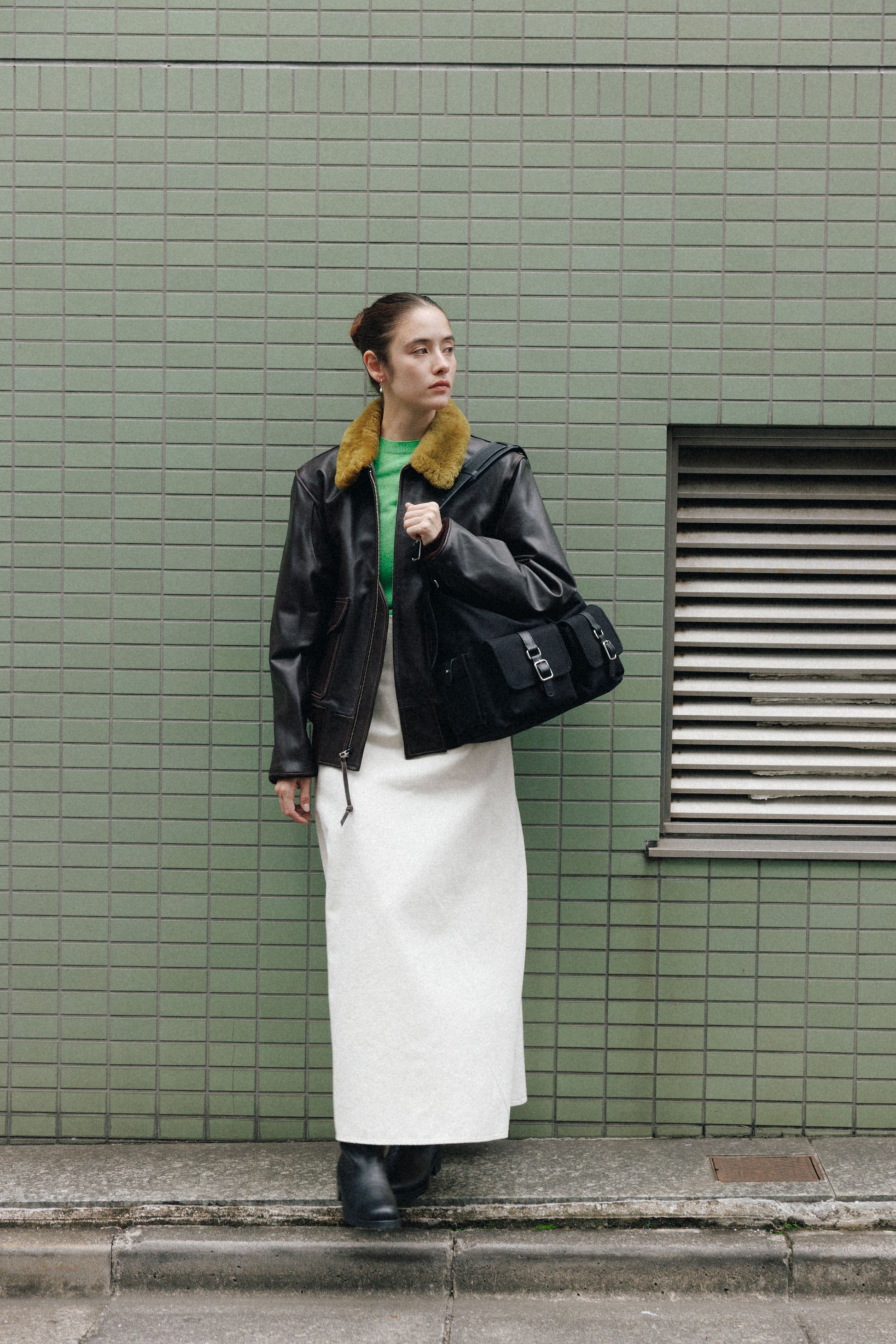 The softly curved silhouette creates a gentler impression compared to the original Bout Bag, and the top zipper closure adds convenience for everyday use. The front features the iconic leather-buckle pocket from the Bout line, while an additional side pocket offers extra storage. The cowhide strap includes a shoulder pad for enhanced comfort, and its adjustable length allows both shoulder and crossbody wear.