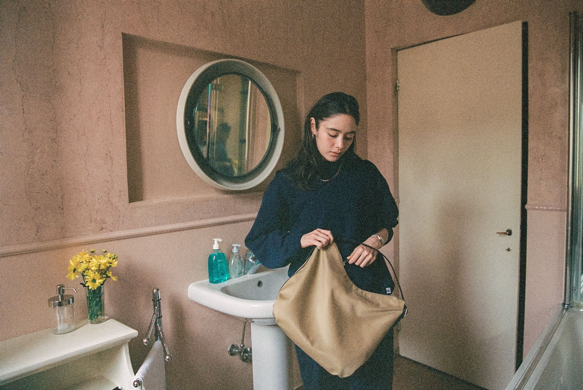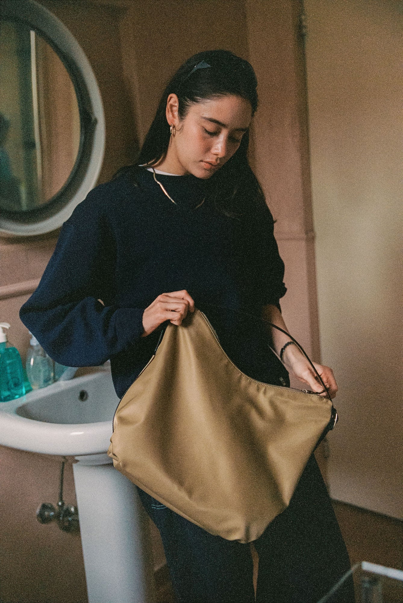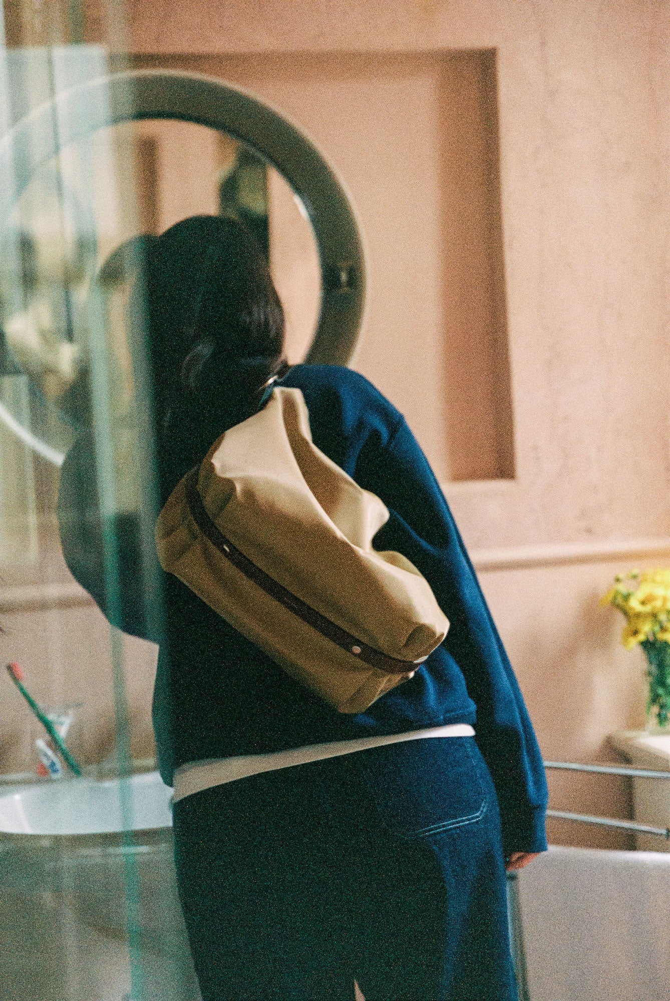 The CANOT TOILE bag is crafted from a lightweight and durable material, featuring leather strap decoration and signature buckles. The nickel-plated brass buckle has an engraved logo, and the hem is pleated to give the bag a natural shape even with belongings inside. The outer fabric is water-resistant, making it suitable for use in any season. The leather decorations around the bag support its shape and are finished with the embossed logo. Inside, there is a small pocket with zipper closure, and the length of strap can be adjusted with a belt buckle. The original size can accomodate a 13-inch laptop, and it can be flexibly shaped depending on your belongings, making it easy to wear anywhere.