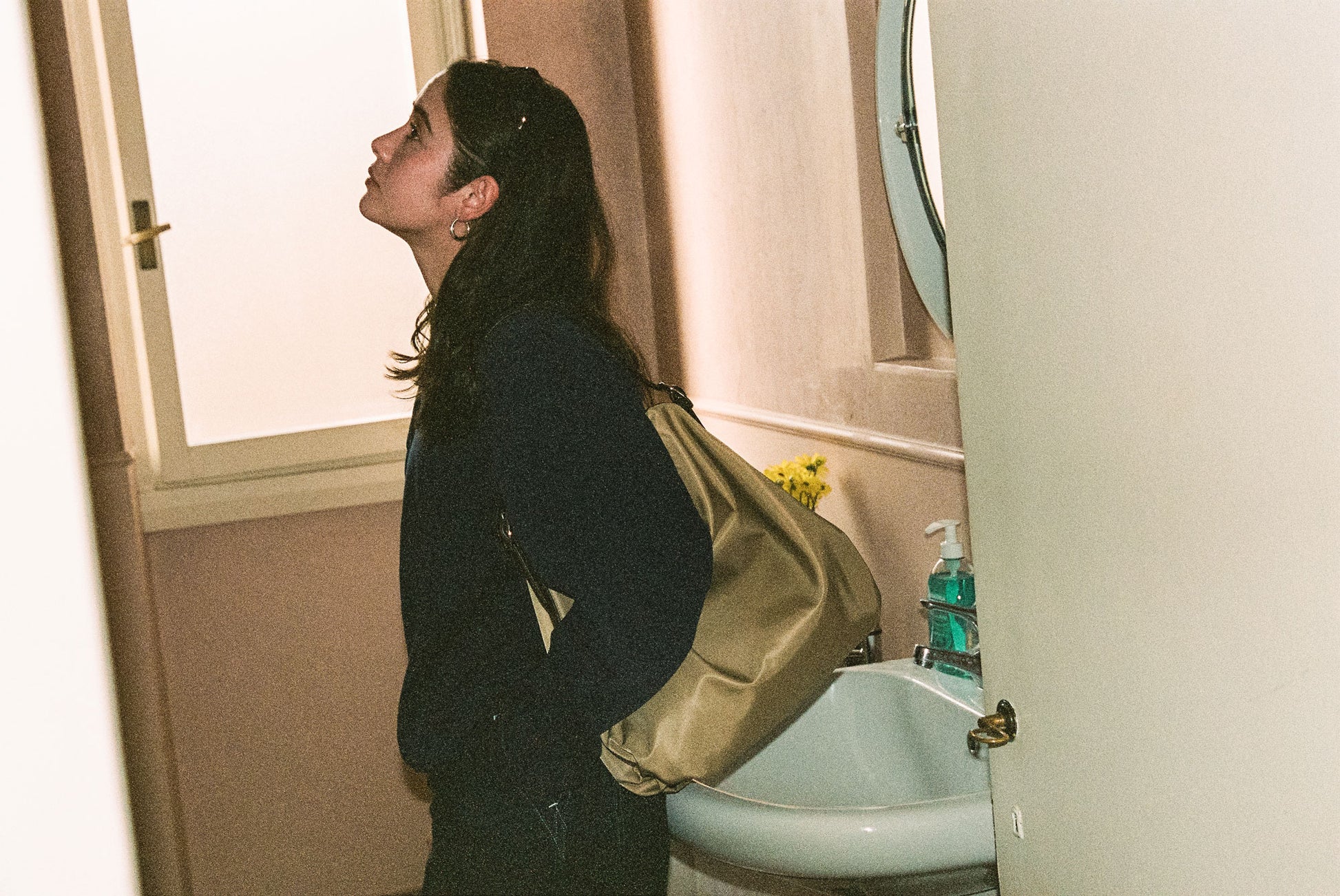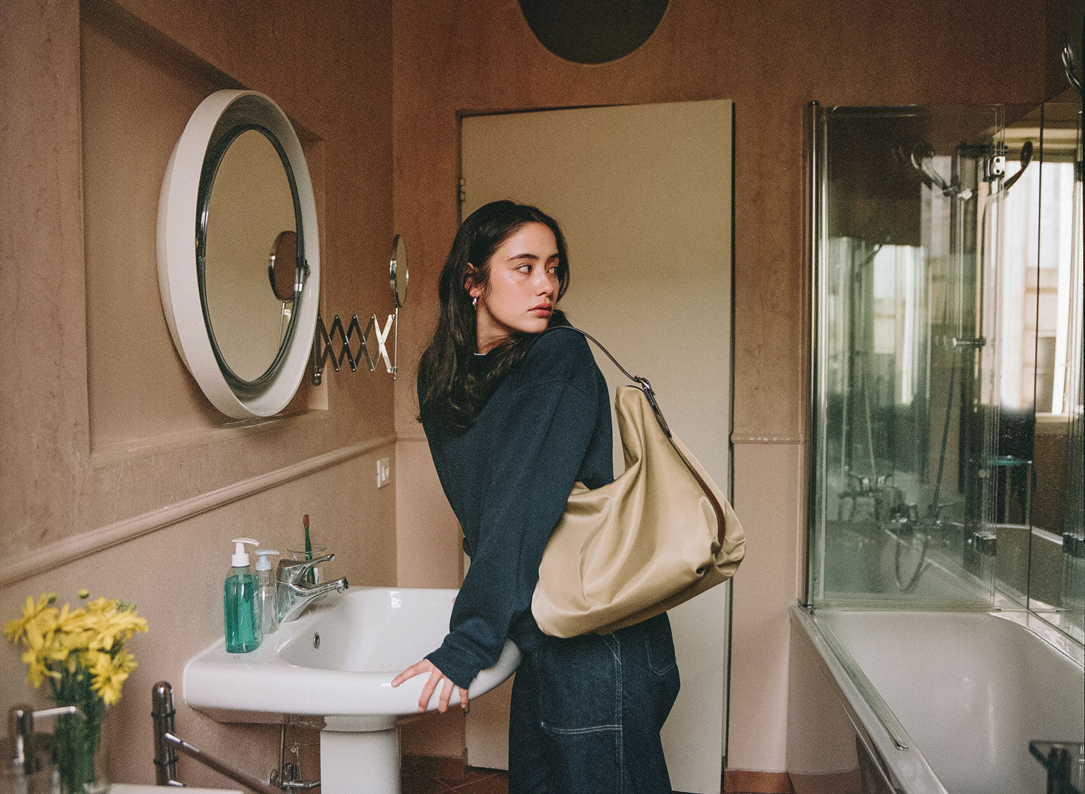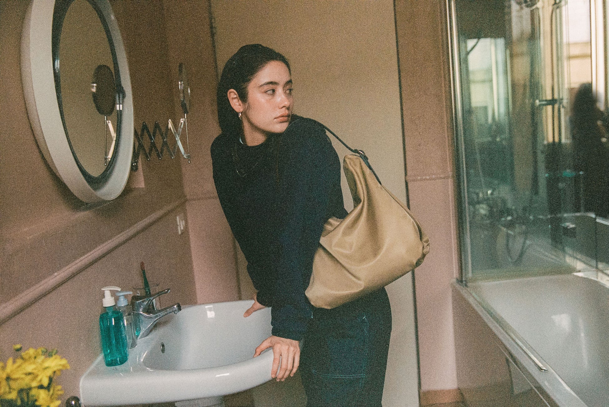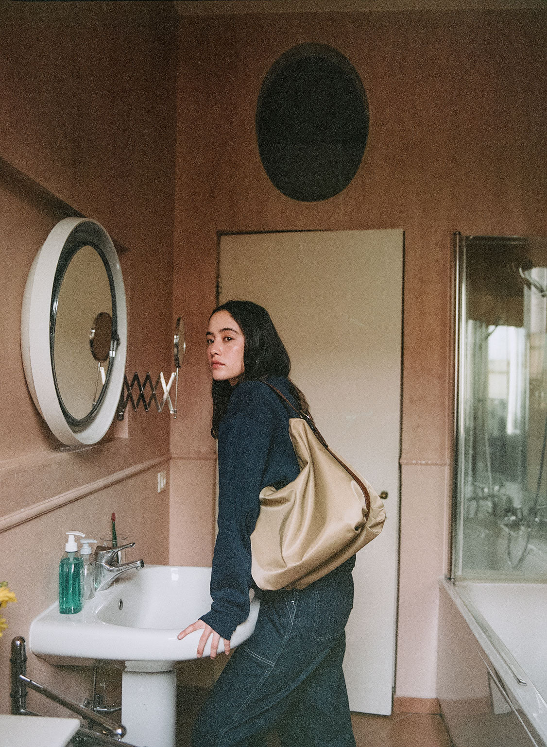The CANOT TOILE bag is crafted from a lightweight and durable material, featuring leather strap decoration and signature buckles. The nickel-plated brass buckle has an engraved logo, and the hem is pleated to give the bag a natural shape even with belongings inside. The outer fabric is water-resistant, making it suitable for use in any season. The leather decorations around the bag support its shape and are finished with the embossed logo. Inside, there is a small pocket with zipper closure, and the length of strap can be adjusted with a belt buckle. The original size can accomodate a 13-inch laptop, and it can be flexibly shaped depending on your belongings, making it easy to wear anywhere.