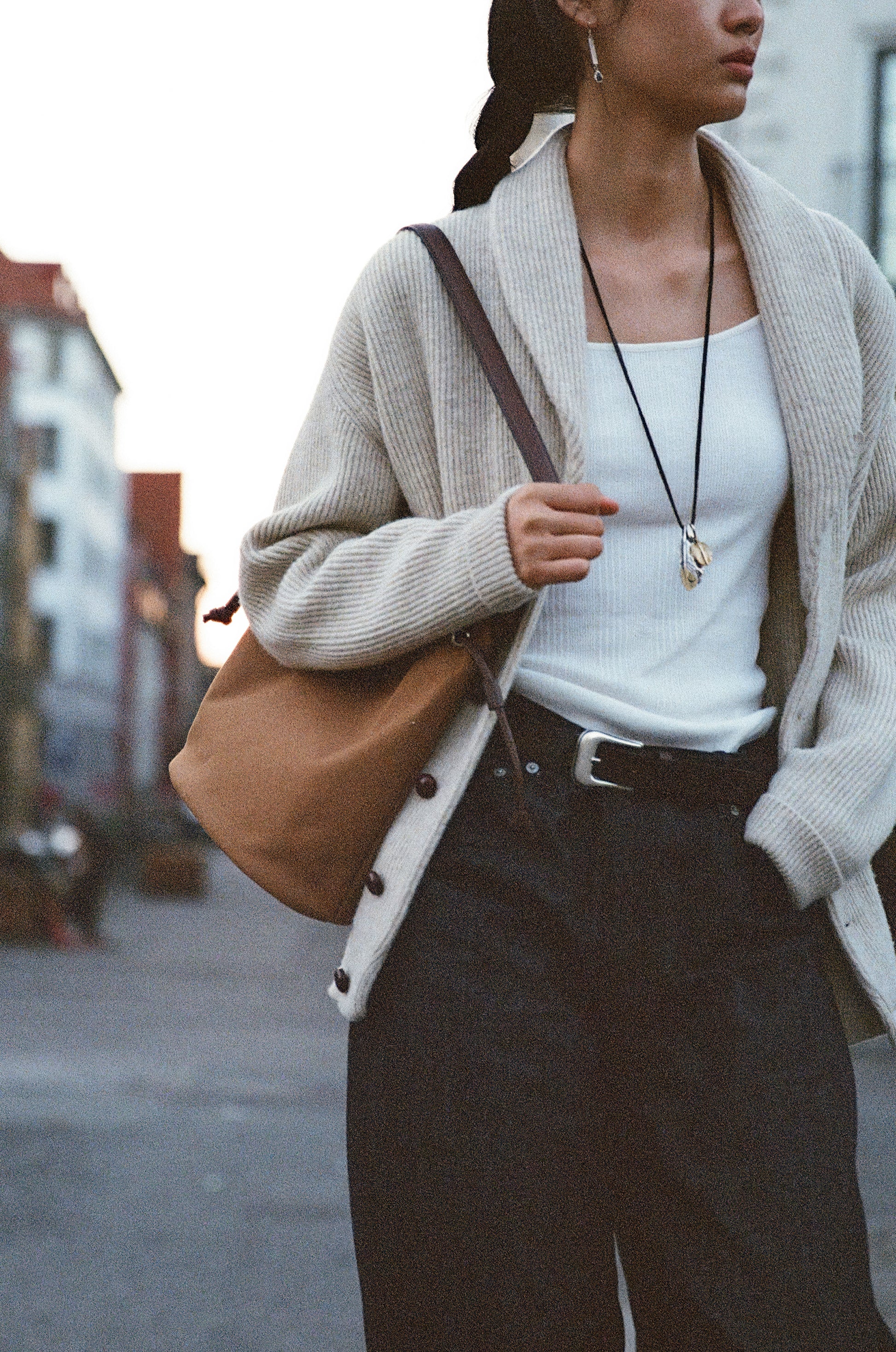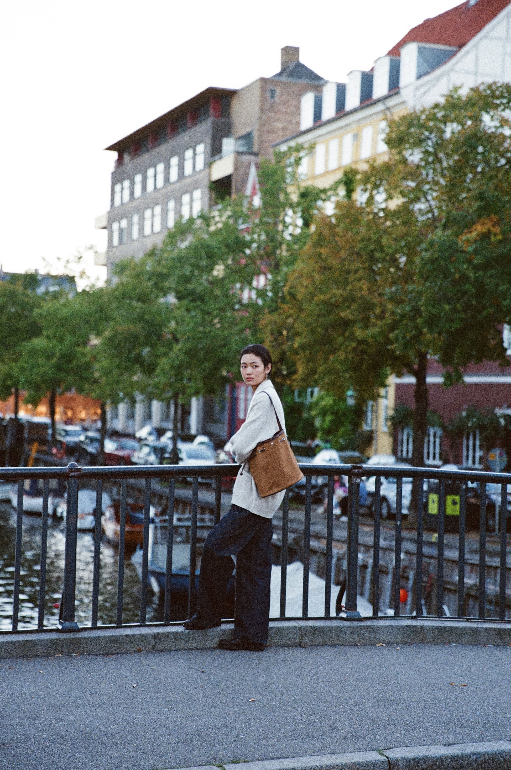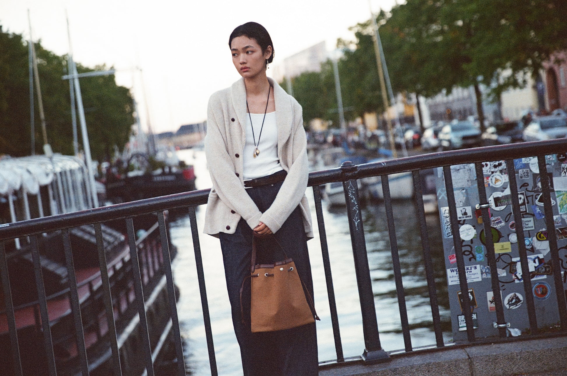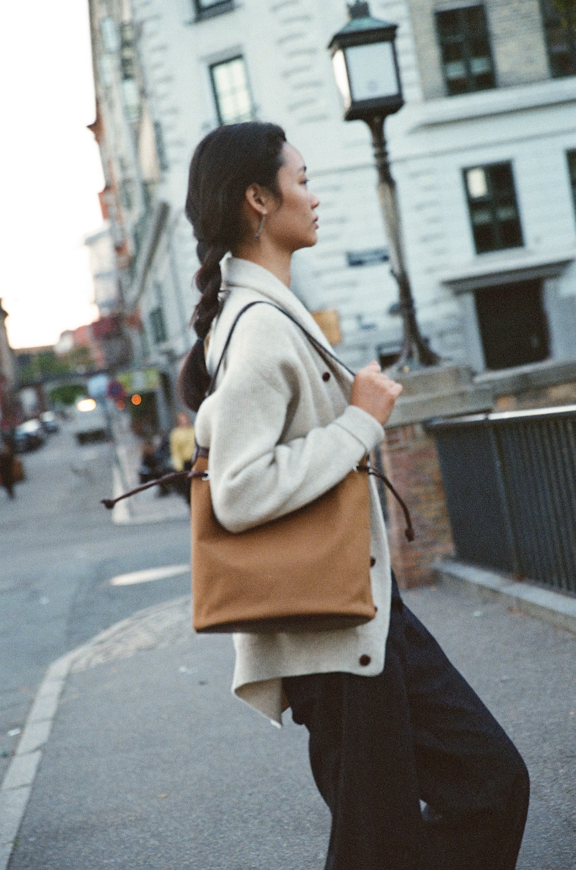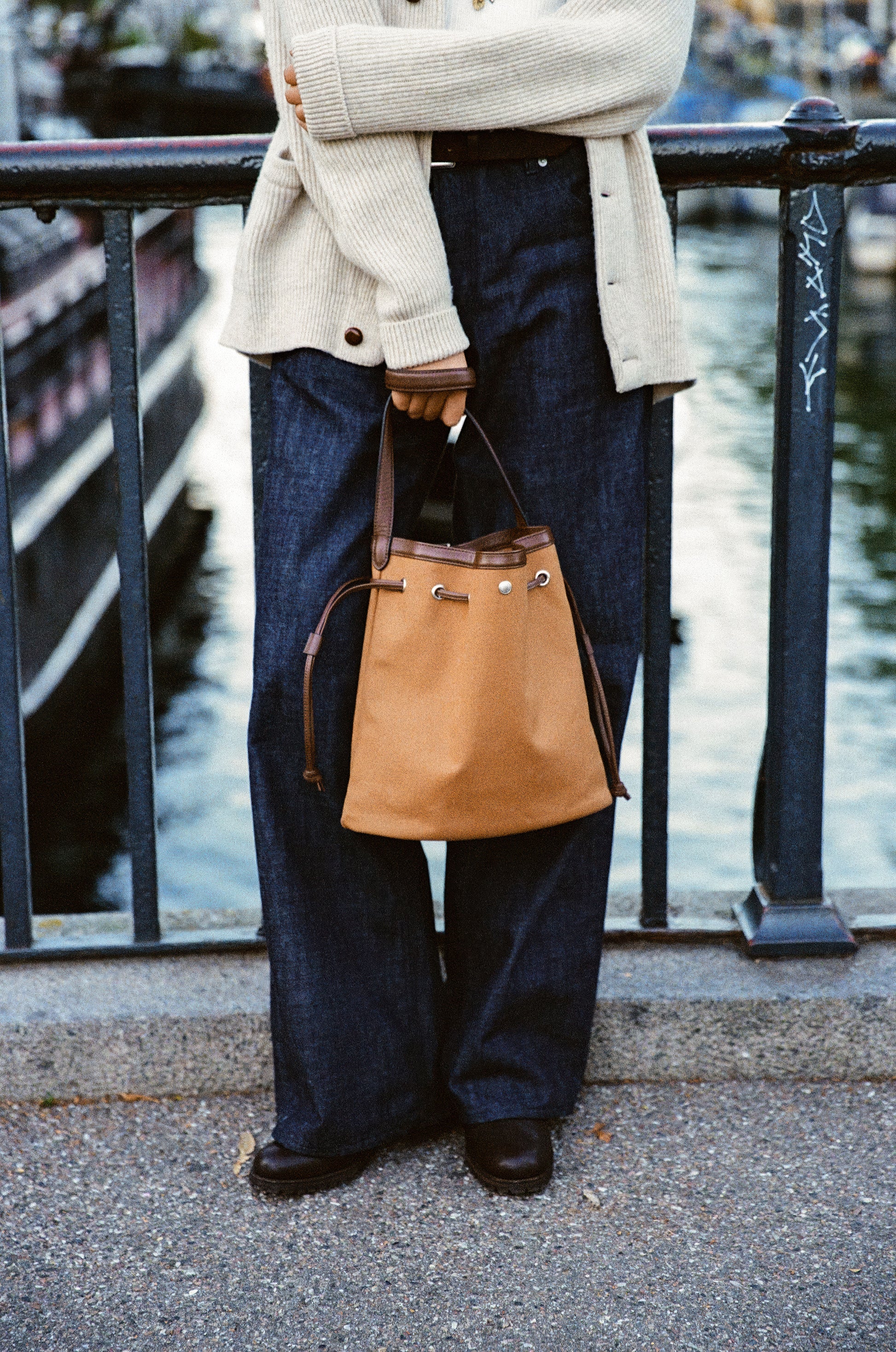 SAC COQUILLE BUCKET is crafted from cotton canvas and soft lambskin, giving it a refined, tactile finish. The name “Coquille”—French for “shell”—reflects the bag’s versatile design, which can be adjusted freely with the leather drawstring at the top. Its bucket silhouette provides ample storage, while tightening the drawstring creates a sculptural, voluminous shape. A central logo-engraved snap ensures secure closure, and a detachable pouch keeps everyday essentials neatly organized. The supple lambskin strap rests comfortably on the shoulder, and the reinforced base helps the bag maintain its structure.