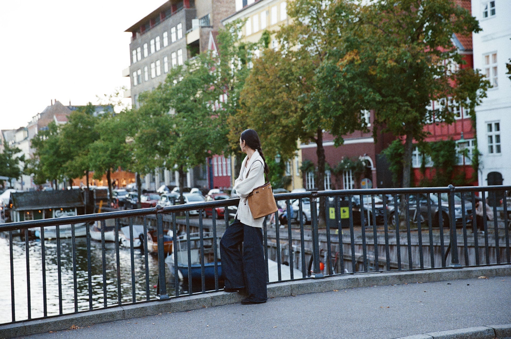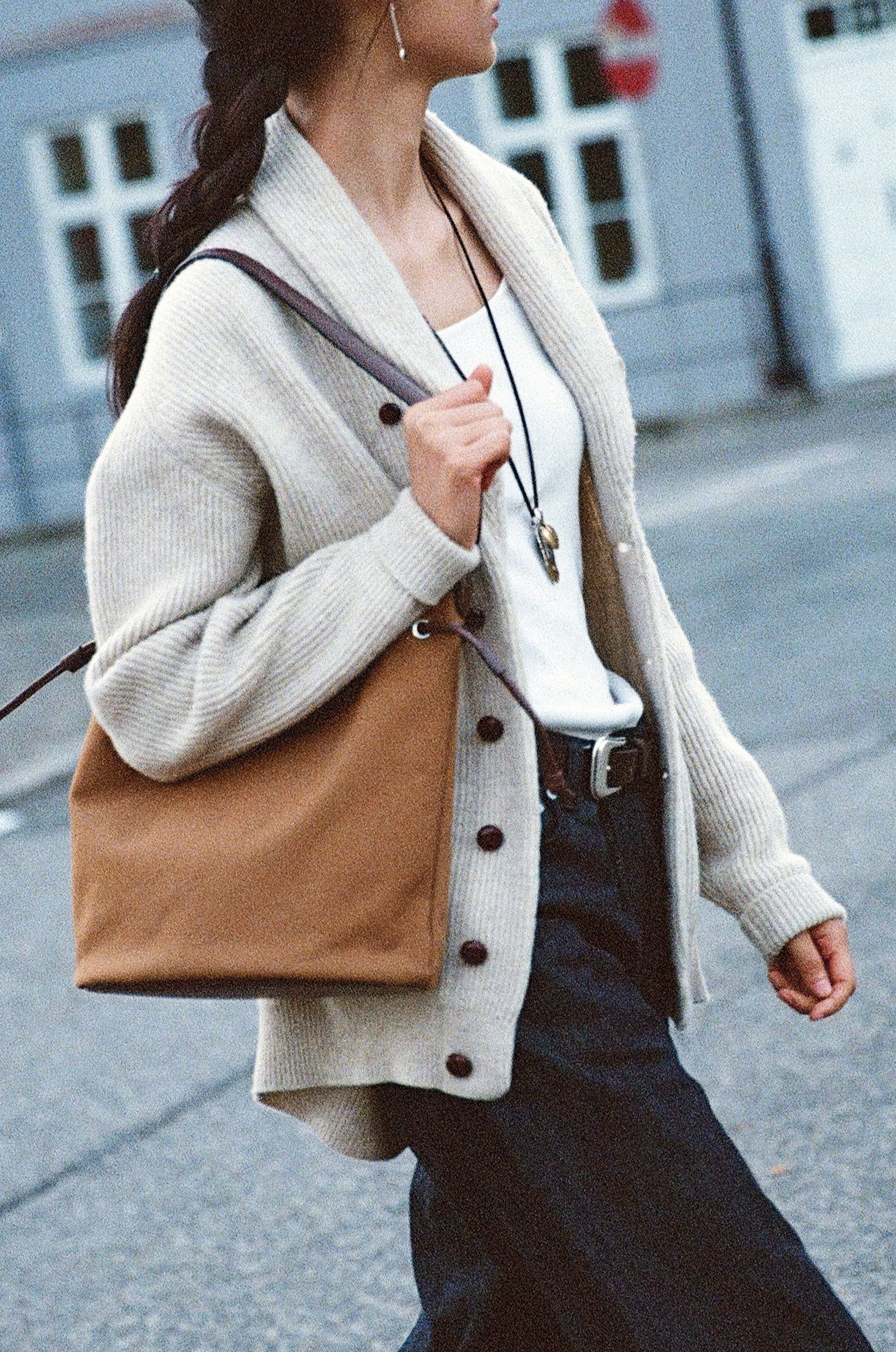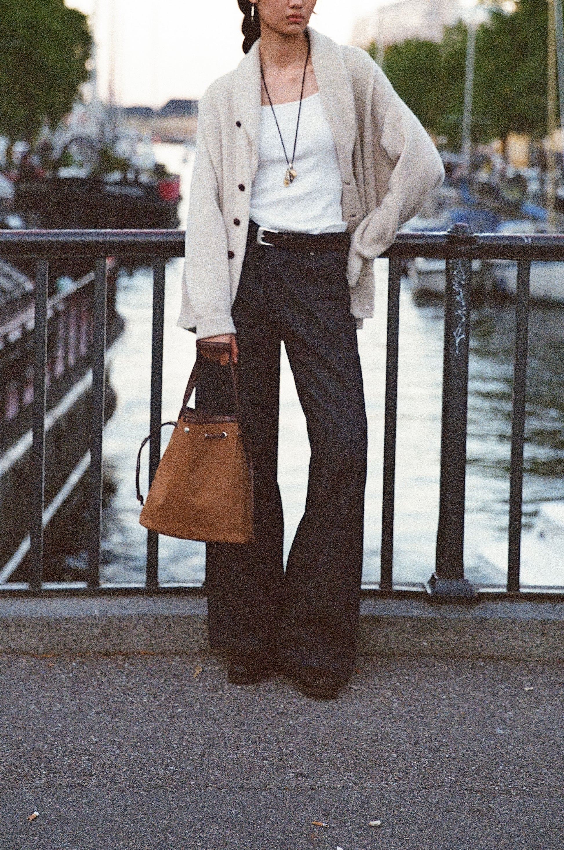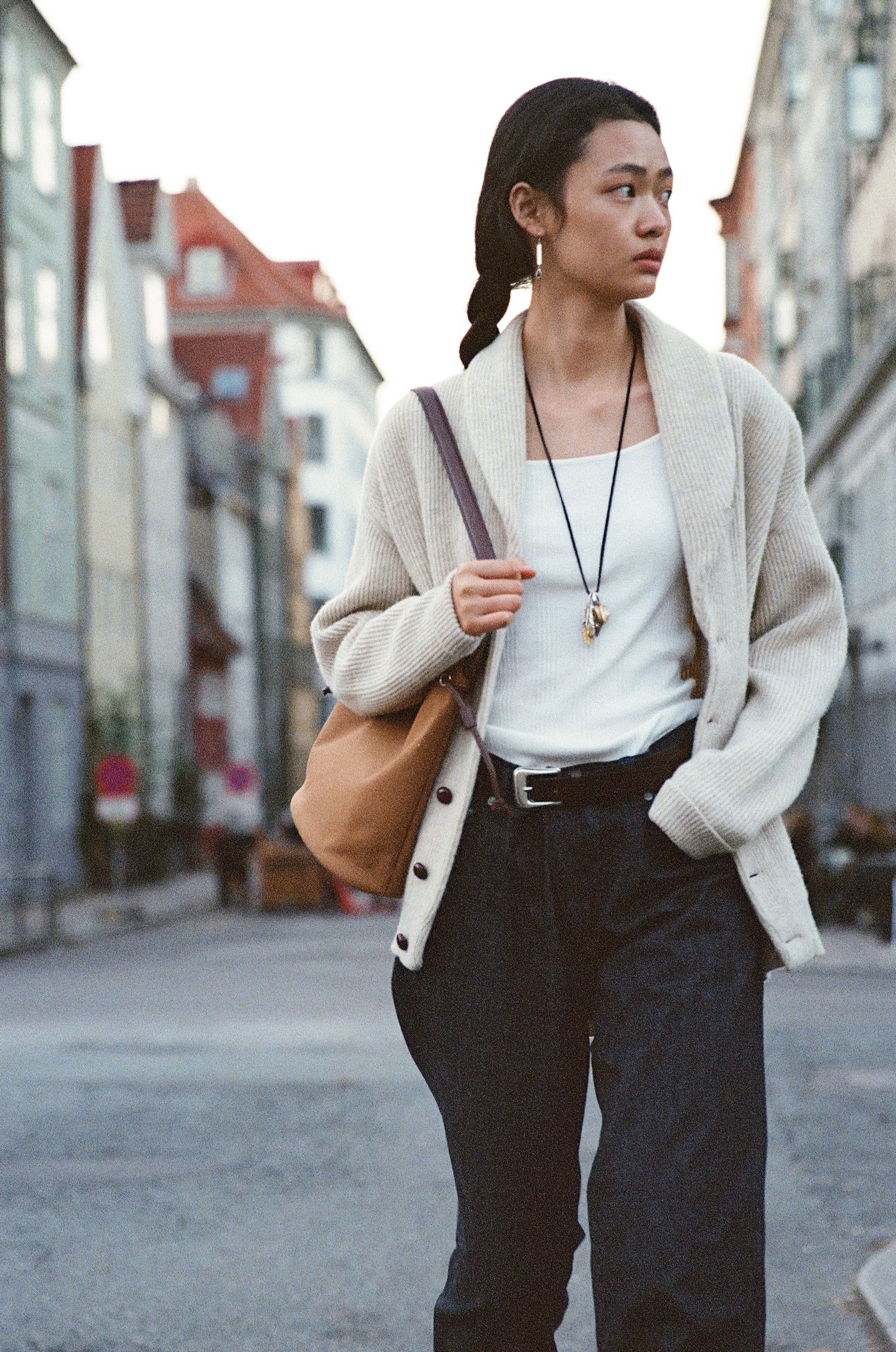 SAC COQUILLE BUCKET is crafted from cotton canvas and soft lambskin, giving it a refined, tactile finish. The name “Coquille”—French for “shell”—reflects the bag’s versatile design, which can be adjusted freely with the leather drawstring at the top. Its bucket silhouette provides ample storage, while tightening the drawstring creates a sculptural, voluminous shape. A central logo-engraved snap ensures secure closure, and a detachable pouch keeps everyday essentials neatly organized. The supple lambskin strap rests comfortably on the shoulder, and the reinforced base helps the bag maintain its structure.