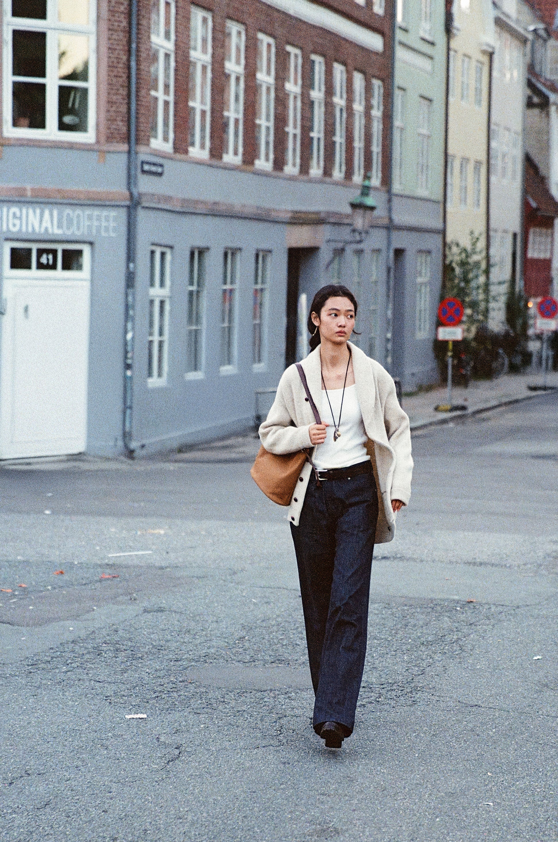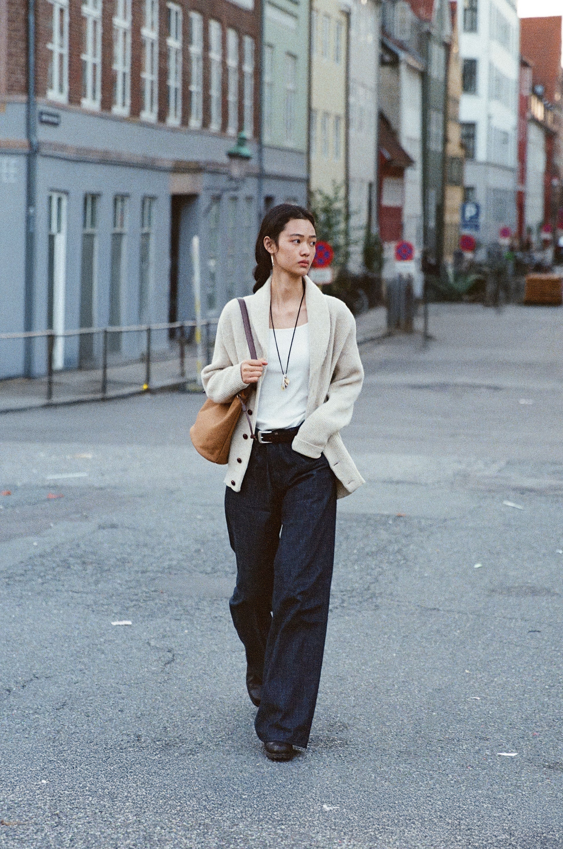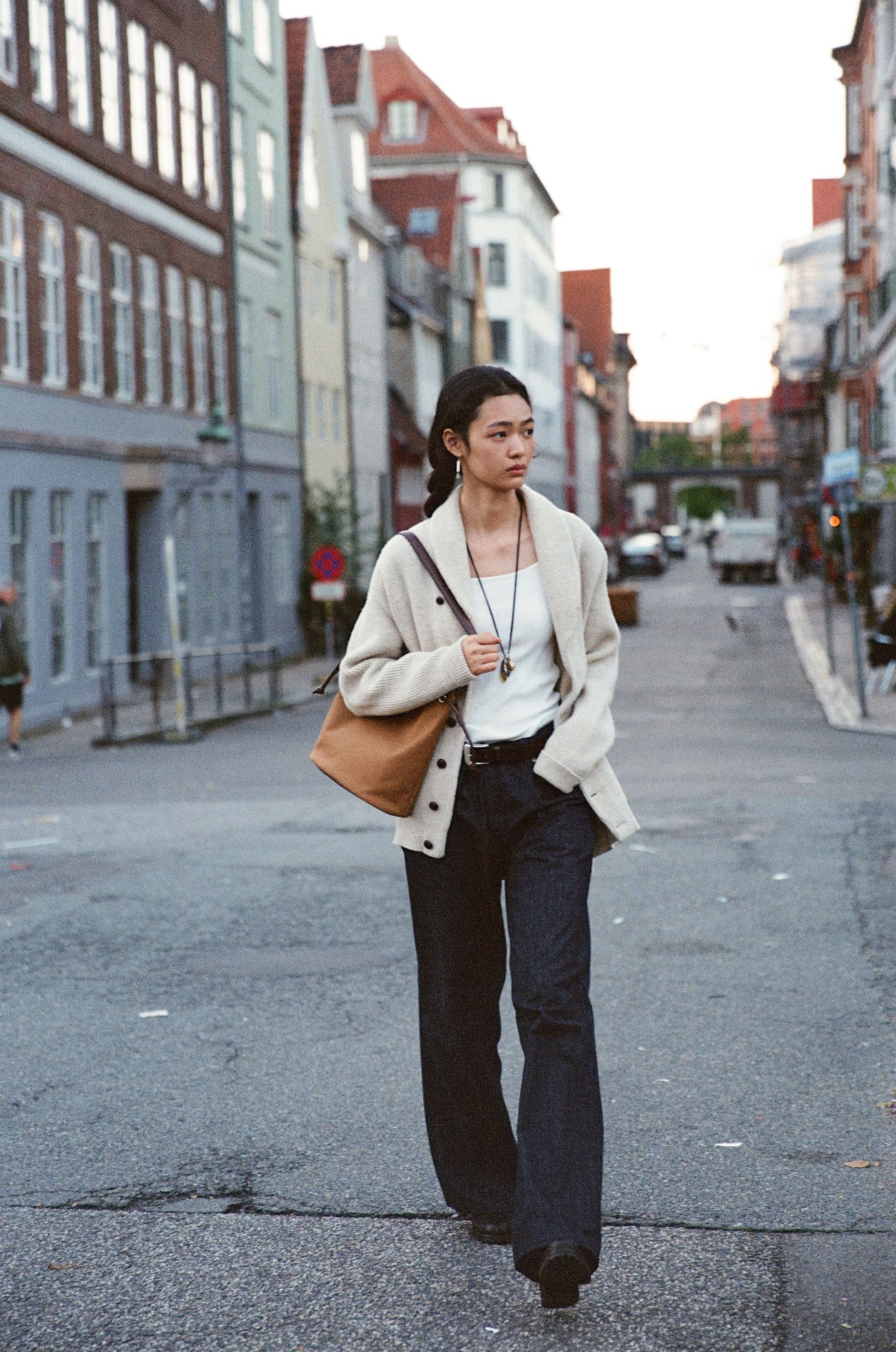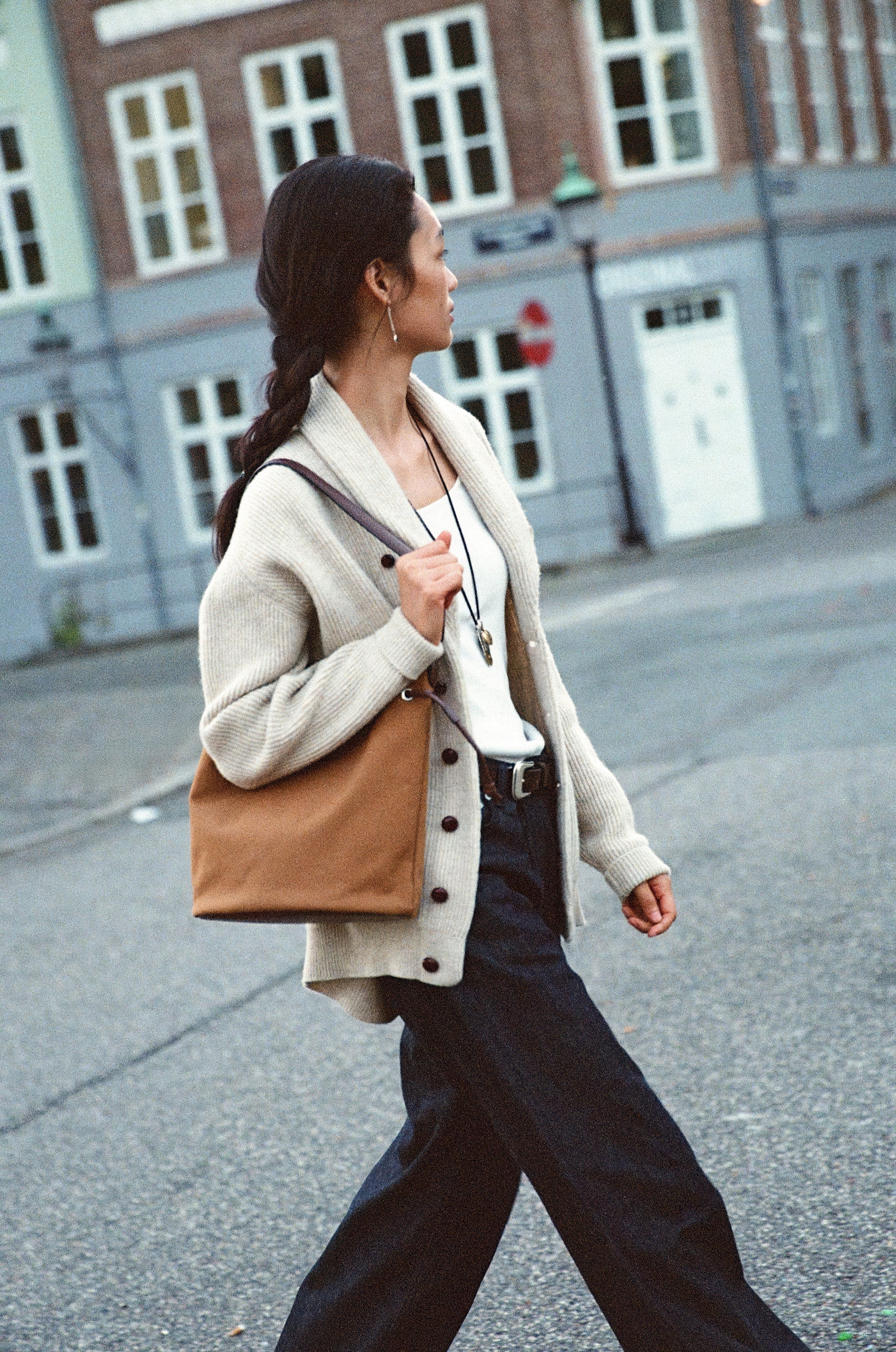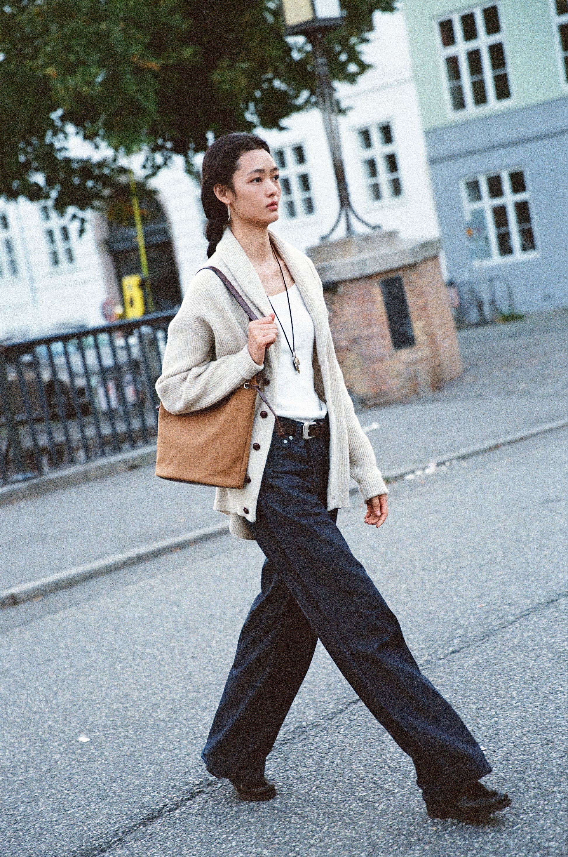 SAC COQUILLE BUCKET is crafted from cotton canvas and soft lambskin, giving it a refined, tactile finish. The name “Coquille”—French for “shell”—reflects the bag’s versatile design, which can be adjusted freely with the leather drawstring at the top. Its bucket silhouette provides ample storage, while tightening the drawstring creates a sculptural, voluminous shape. A central logo-engraved snap ensures secure closure, and a detachable pouch keeps everyday essentials neatly organized. The supple lambskin strap rests comfortably on the shoulder, and the reinforced base helps the bag maintain its structure.