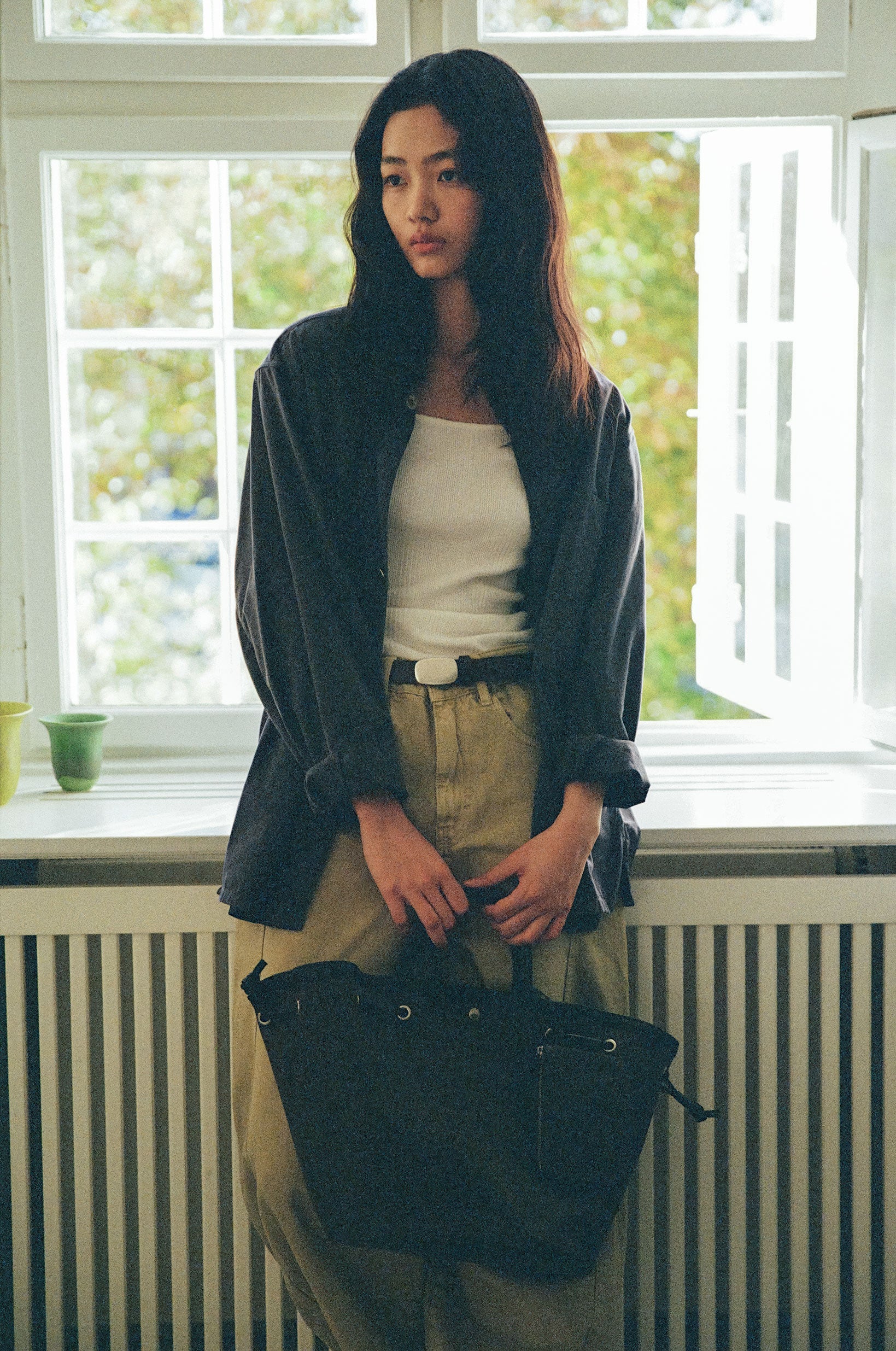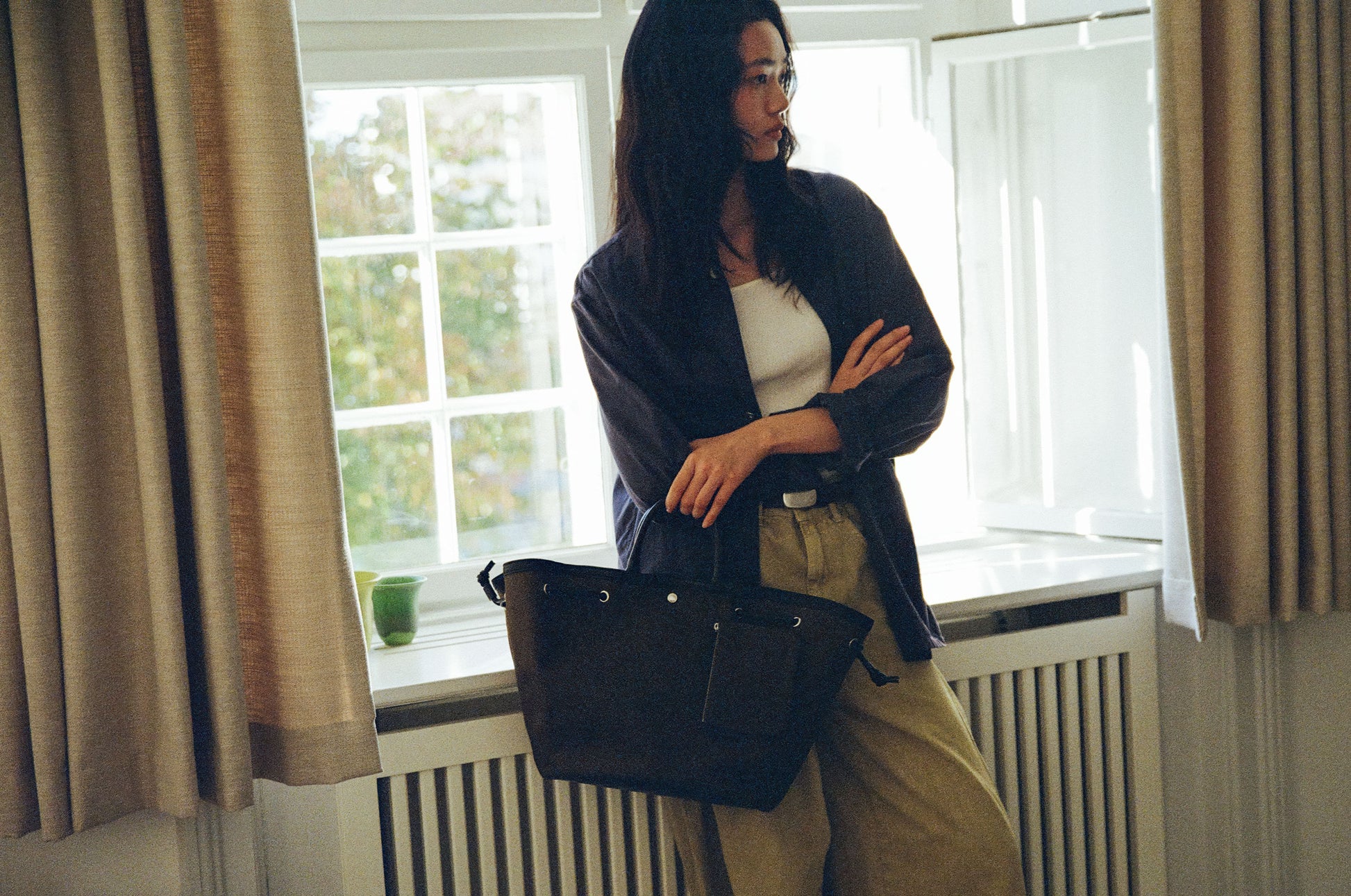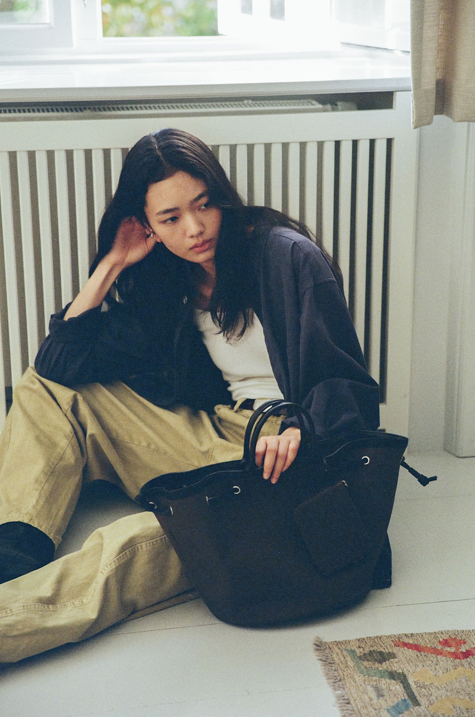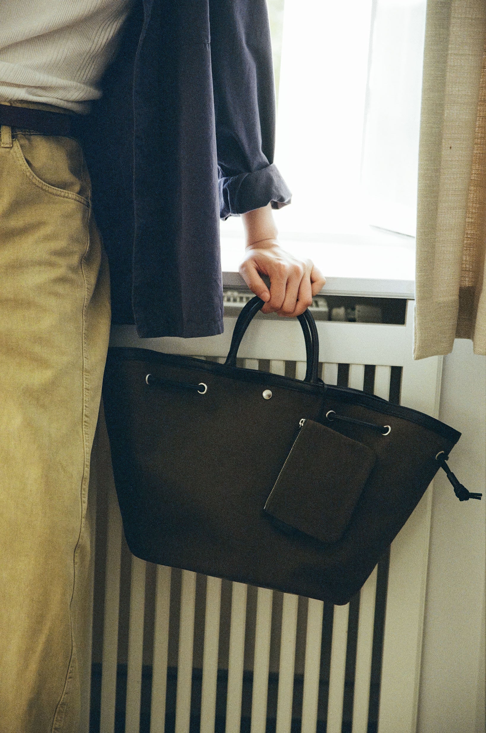 This shopper bag is crafted by combining soft sheepskin with cotton canvas material. Named "COQUILLE," which means "shell" in French, it embodies the feature of a bag that can be freely shaped using the leather string at the top. When carrying many belongings, you can spread it wide to form the shape of a shopper bag, or you can tighten the string to use it as a bucket bag. There's a snap in the center with the logo embossed, allowing for secure closure. Additionally, it comes with a detachable pouch, making it convenient to store small essentials that are frequently needed. The soft and round strap provides a comfortable grip even when the bag is filled with many items, while the sturdy sheepskin bottom provides stability to the bag.