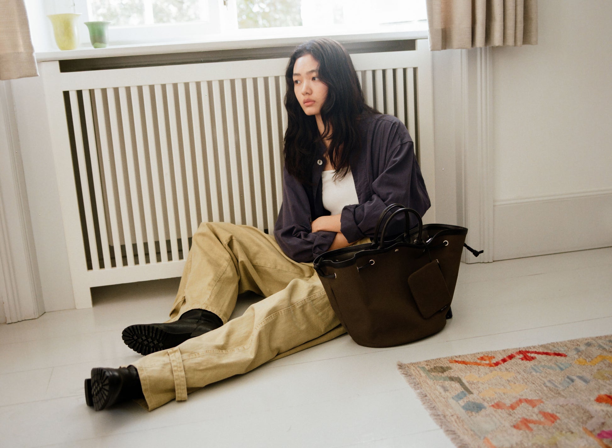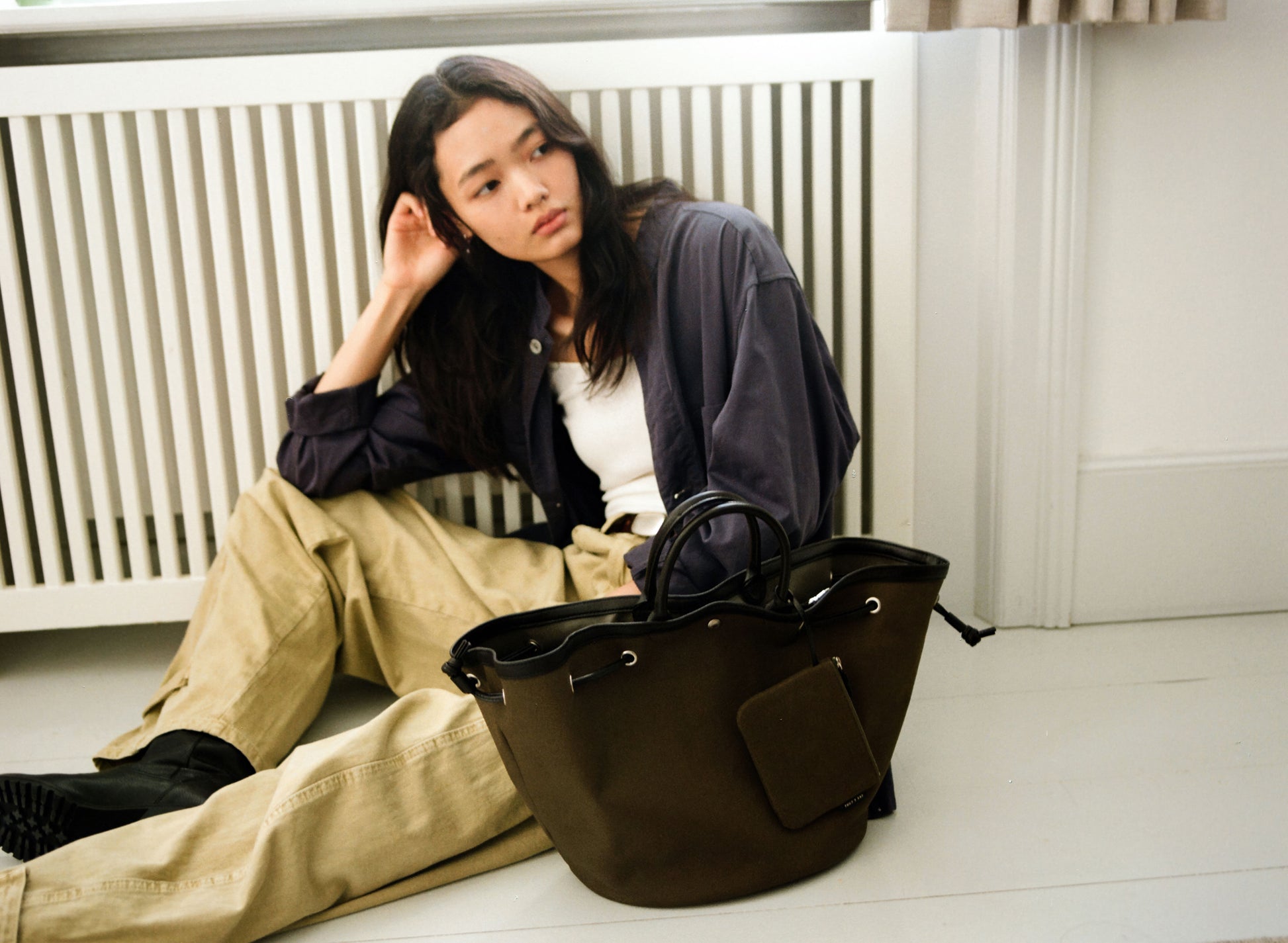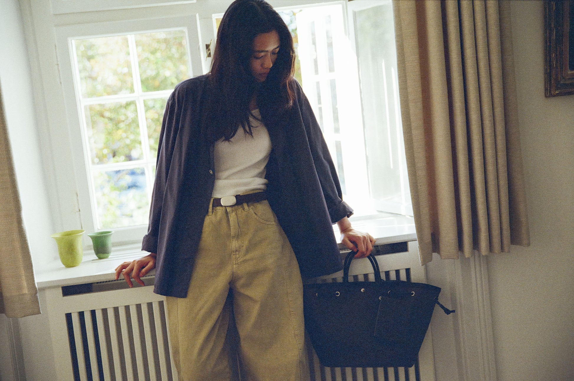 This shopper bag is crafted by combining soft sheepskin with cotton canvas material. Named "COQUILLE," which means "shell" in French, it embodies the feature of a bag that can be freely shaped using the leather string at the top. When carrying many belongings, you can spread it wide to form the shape of a shopper bag, or you can tighten the string to use it as a bucket bag. There's a snap in the center with the logo embossed, allowing for secure closure. Additionally, it comes with a detachable pouch, making it convenient to store small essentials that are frequently needed. The soft and round strap provides a comfortable grip even when the bag is filled with many items, while the sturdy sheepskin bottom provides stability to the bag.