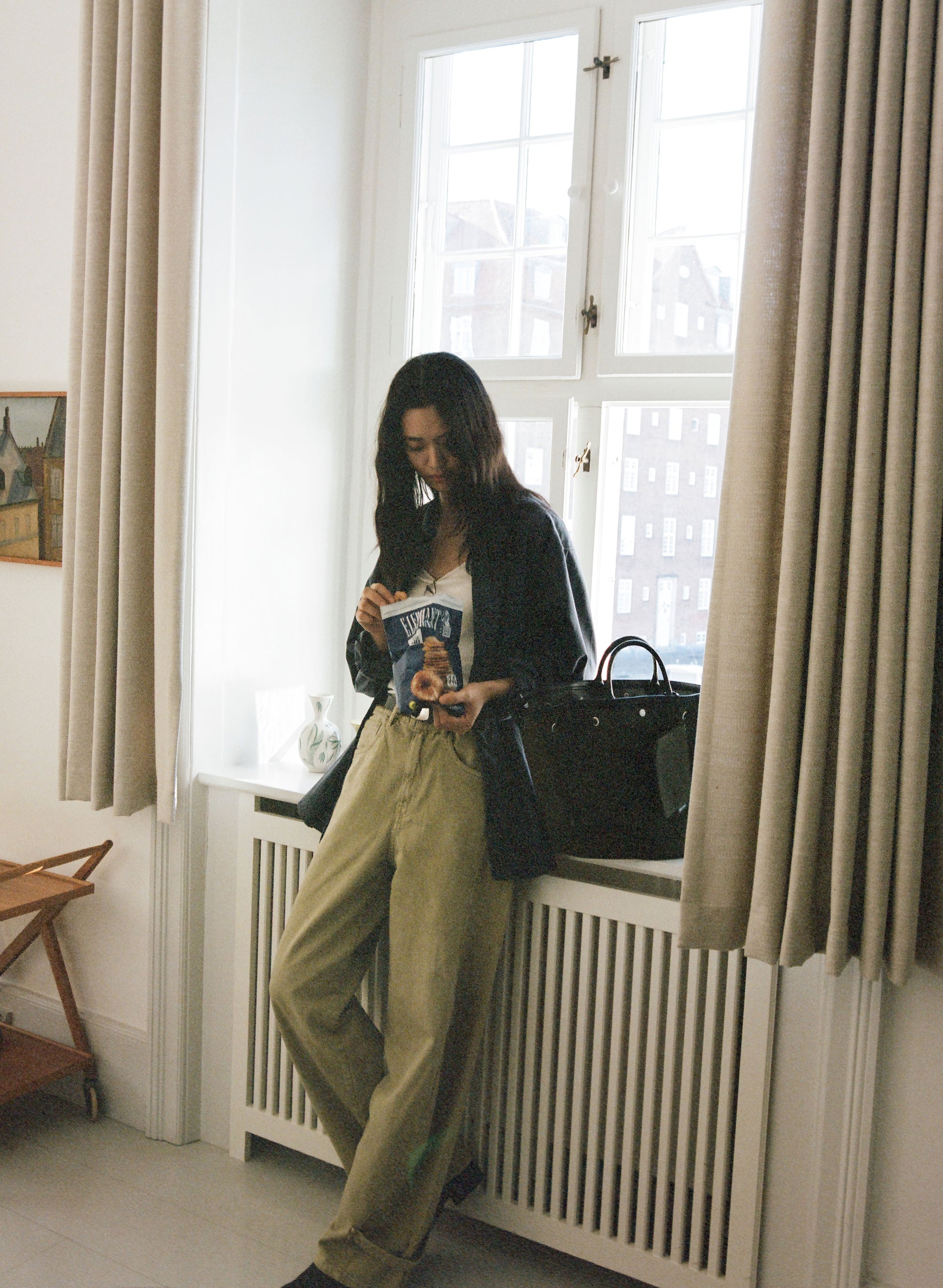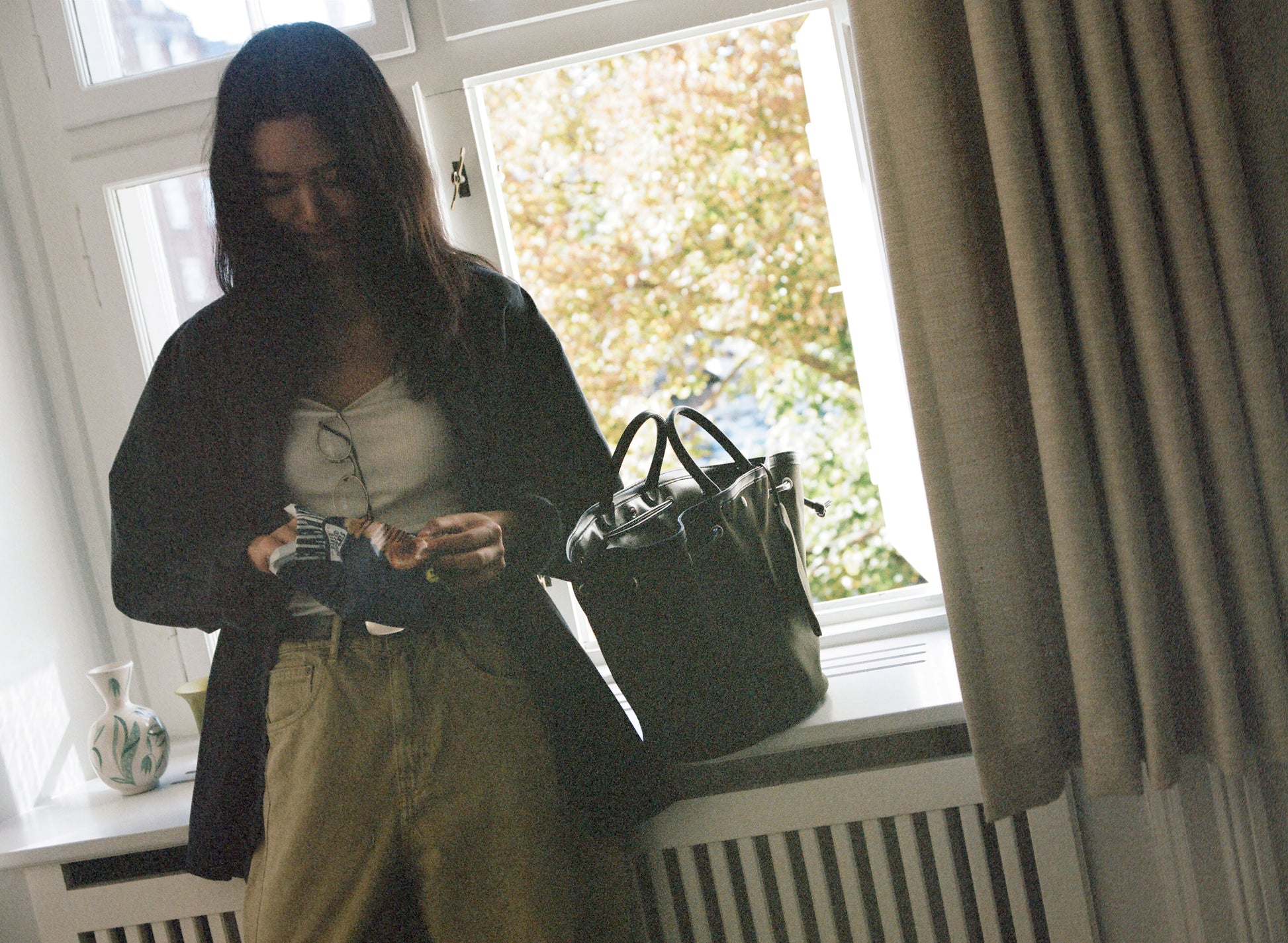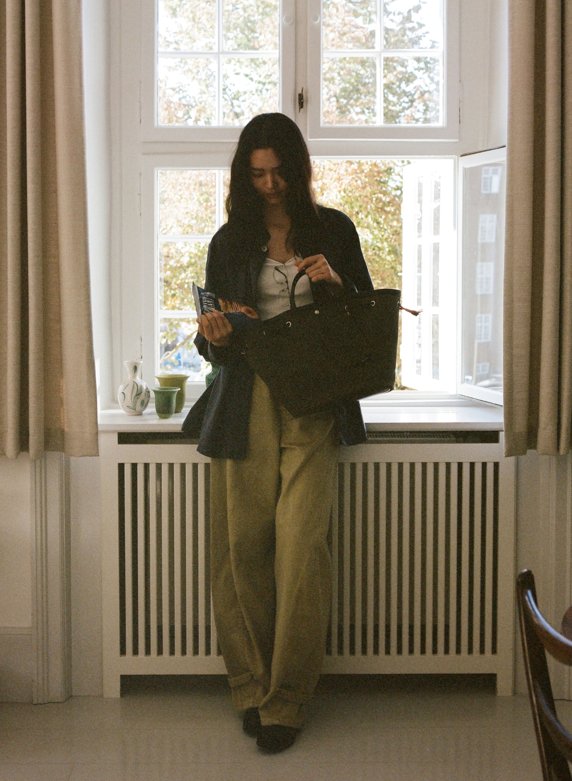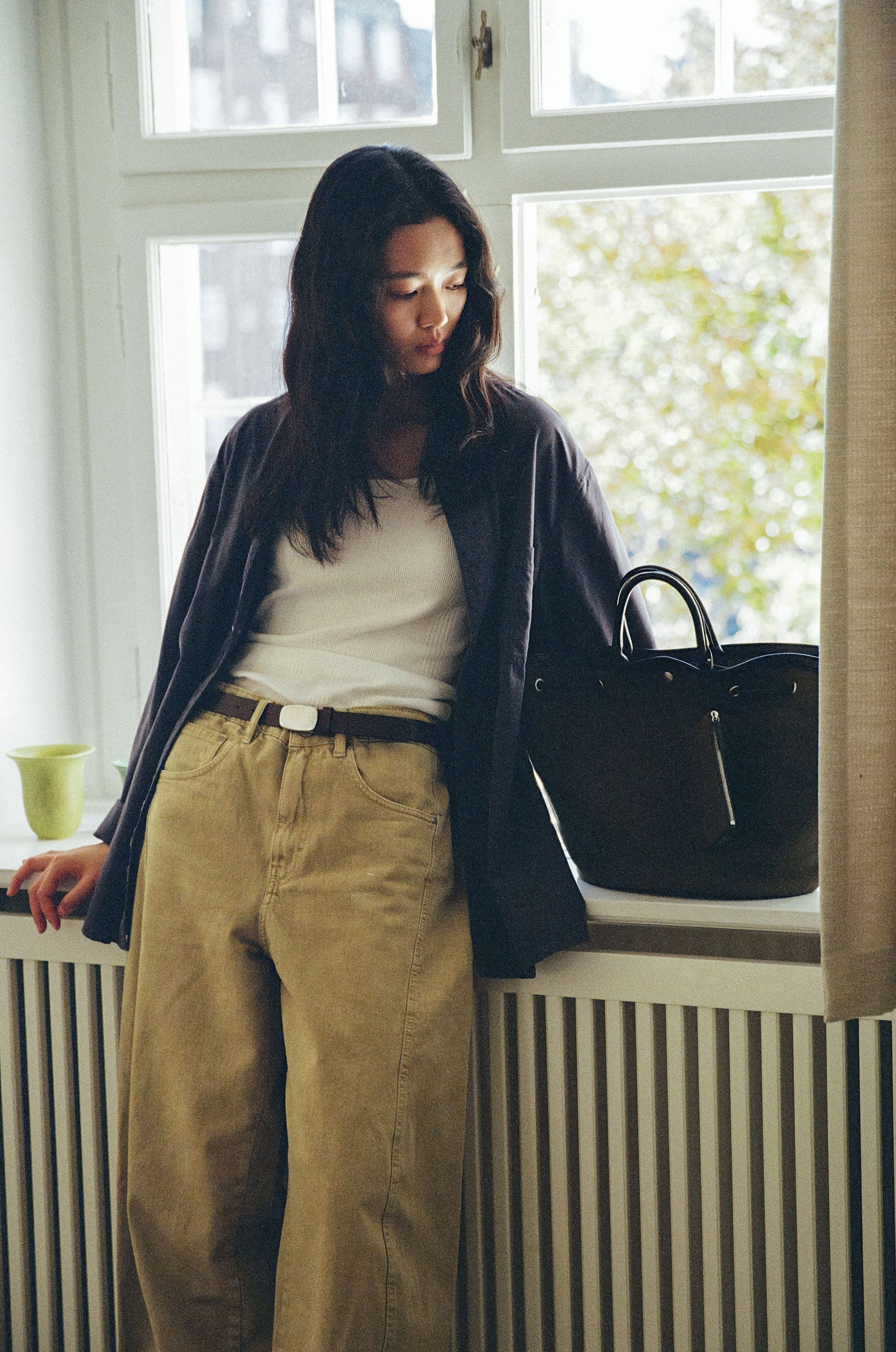 This shopper bag is crafted by combining soft sheepskin with cotton canvas material. Named "COQUILLE," which means "shell" in French, it embodies the feature of a bag that can be freely shaped using the leather string at the top. When carrying many belongings, you can spread it wide to form the shape of a shopper bag, or you can tighten the string to use it as a bucket bag. There's a snap in the center with the logo embossed, allowing for secure closure. Additionally, it comes with a detachable pouch, making it convenient to store small essentials that are frequently needed. The soft and round strap provides a comfortable grip even when the bag is filled with many items, while the sturdy sheepskin bottom provides stability to the bag.