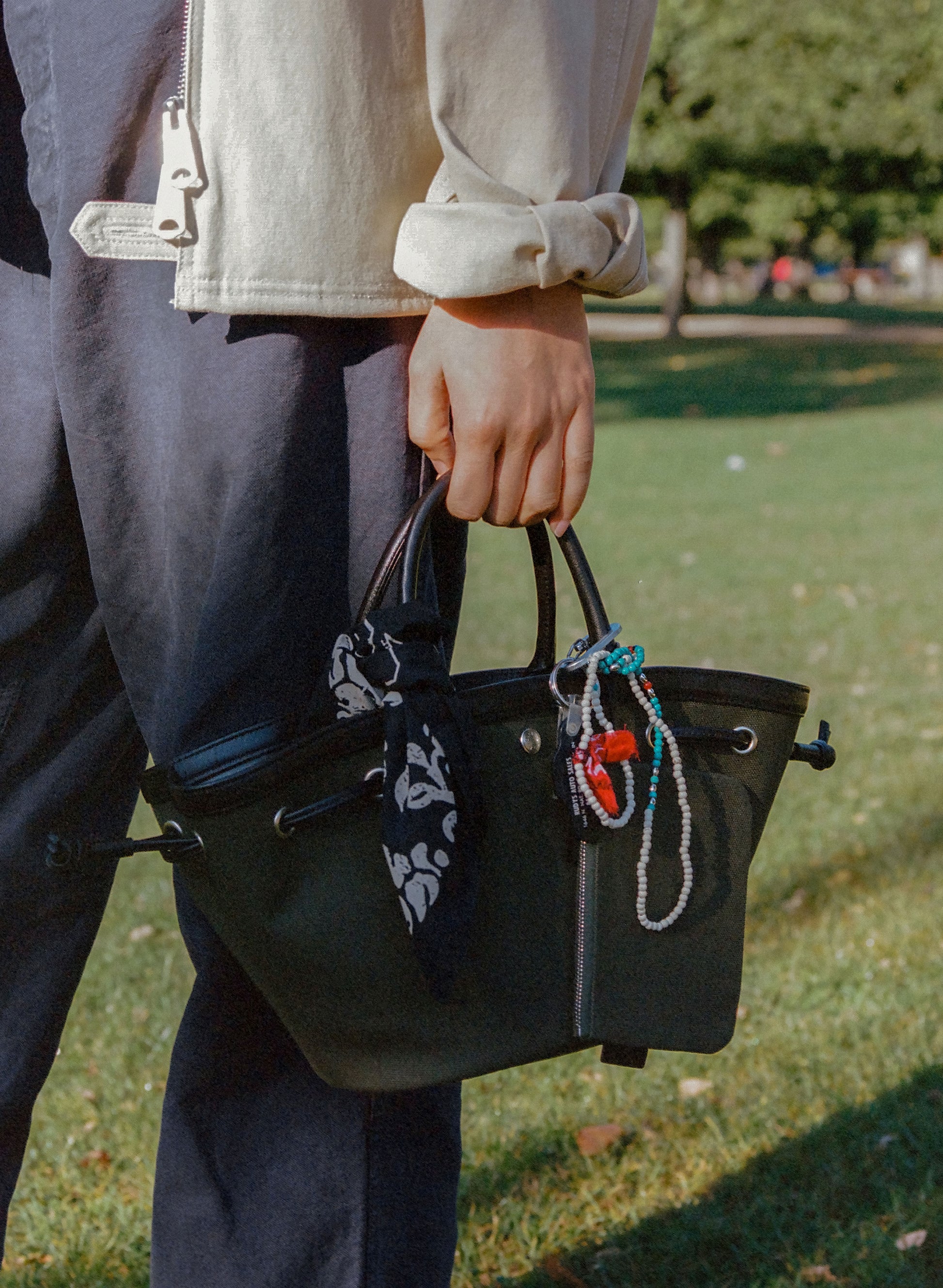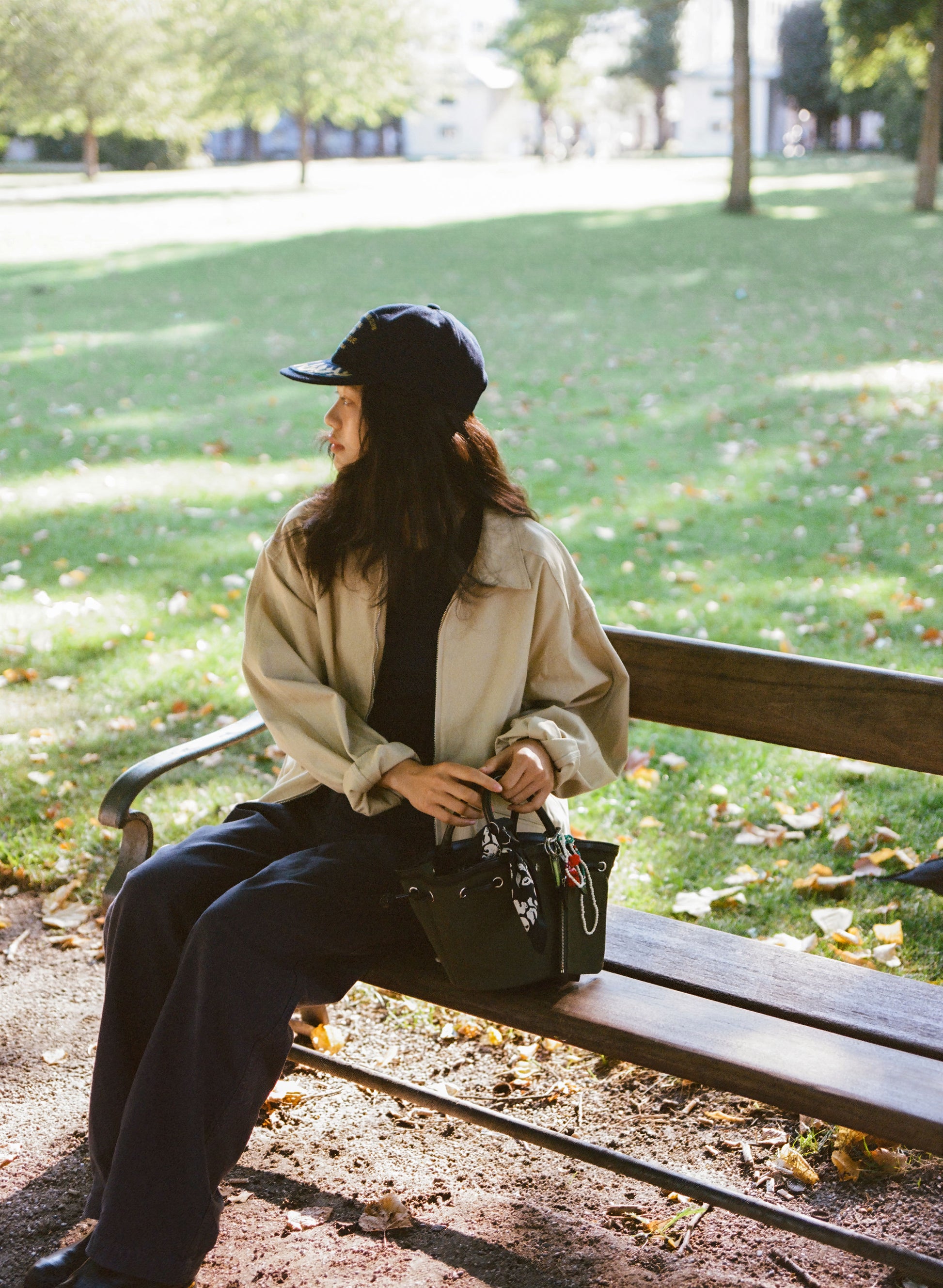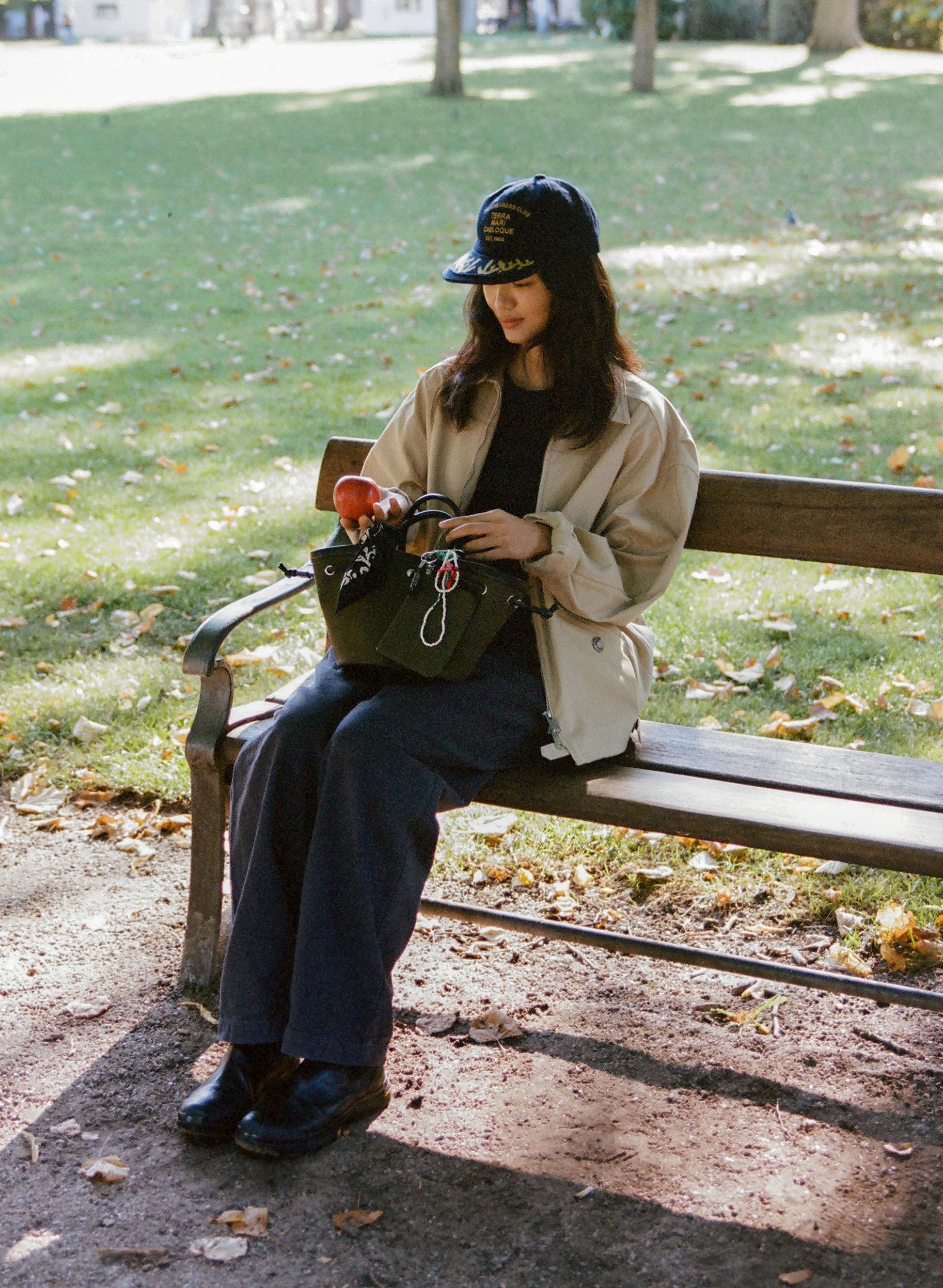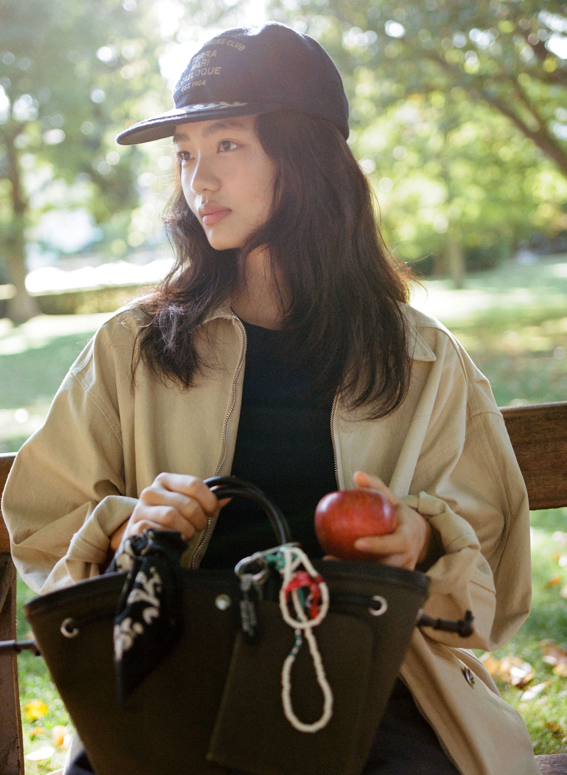 This shopper bag is crafted by combining soft sheepskin with cotton canvas material. Named "COQUILLE," which means "shell" in French, it embodies the feature of a bag that can be freely shaped using the leather string at the top. When carrying many belongings, you can spread it wide to form the shape of a shopper bag, or you can tighten the string to use it as a bucket bag. There's a snap in the center with the logo embossed, allowing for secure closure. Additionally, it comes with a detachable pouch, making it convenient to store small essentials that are frequently needed. The soft and round strap provides a comfortable grip even when the bag is filled with many items, while the sturdy sheepskin bottom provides stability to the bag.