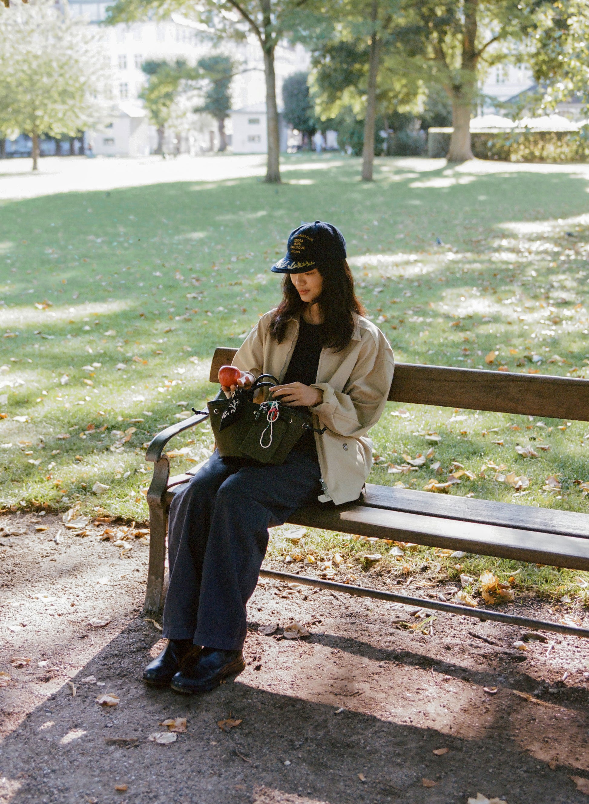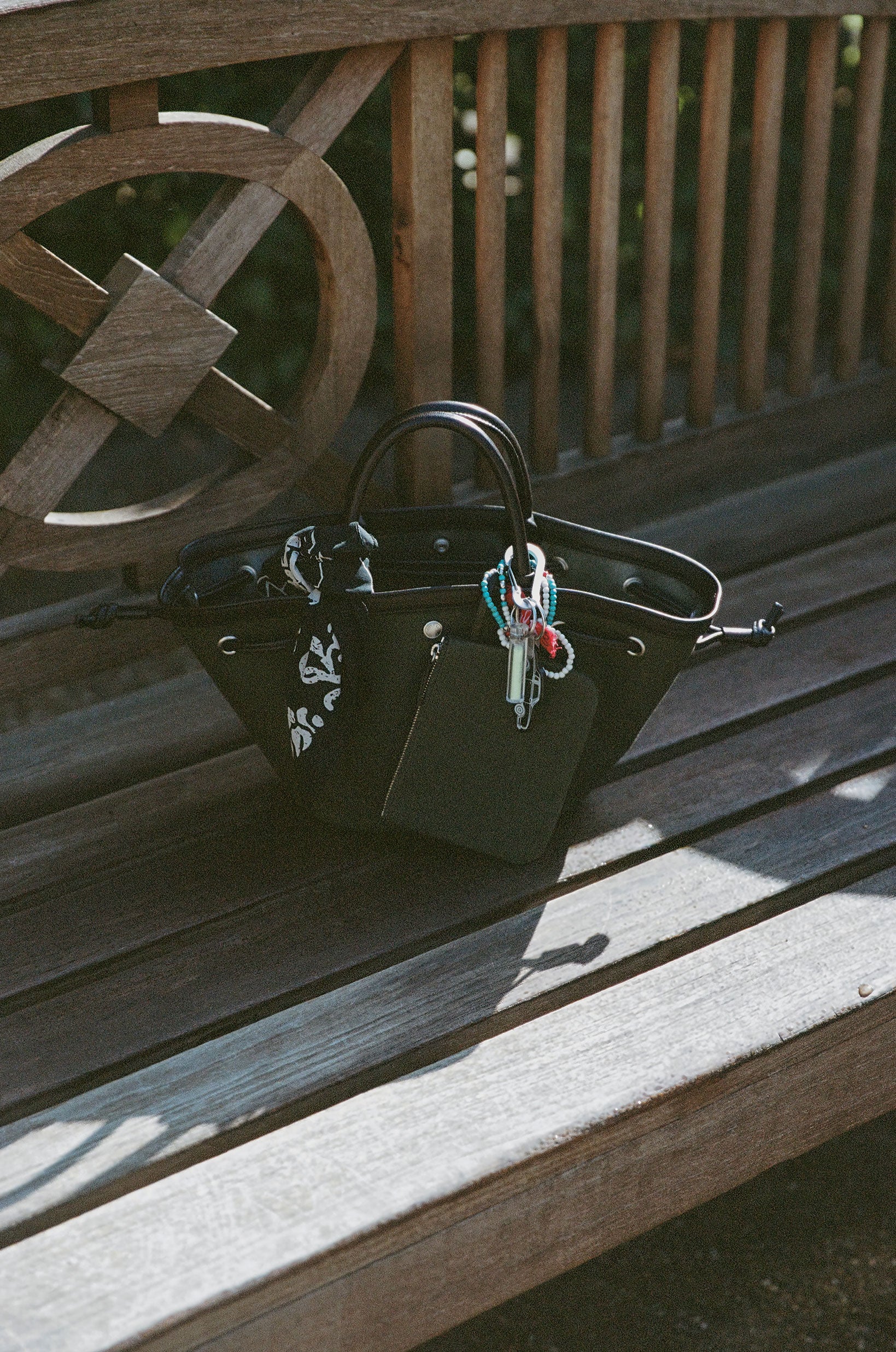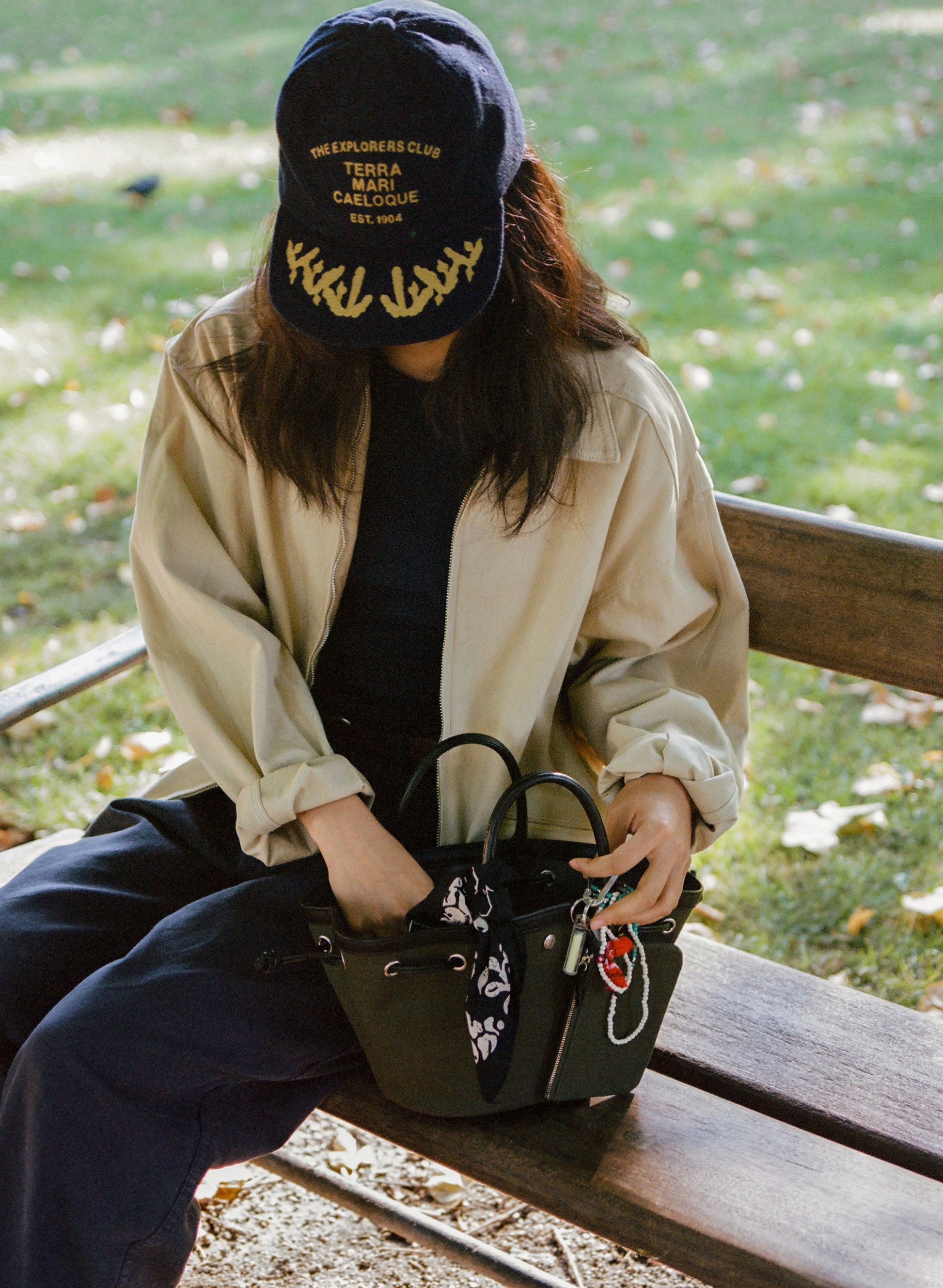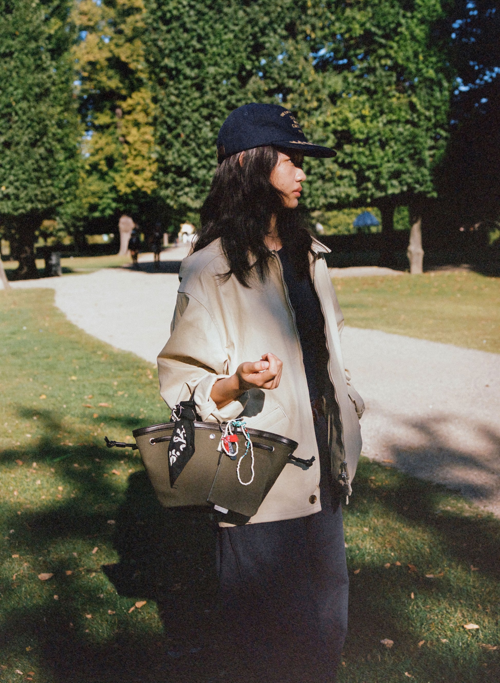 This shopper bag is crafted by combining soft sheepskin with cotton canvas material. Named "COQUILLE," which means "shell" in French, it embodies the feature of a bag that can be freely shaped using the leather string at the top. When carrying many belongings, you can spread it wide to form the shape of a shopper bag, or you can tighten the string to use it as a bucket bag. There's a snap in the center with the logo embossed, allowing for secure closure. Additionally, it comes with a detachable pouch, making it convenient to store small essentials that are frequently needed. The soft and round strap provides a comfortable grip even when the bag is filled with many items, while the sturdy sheepskin bottom provides stability to the bag.