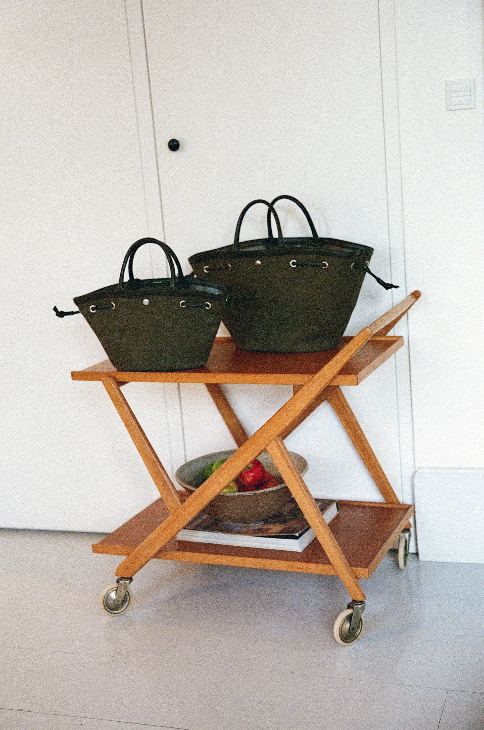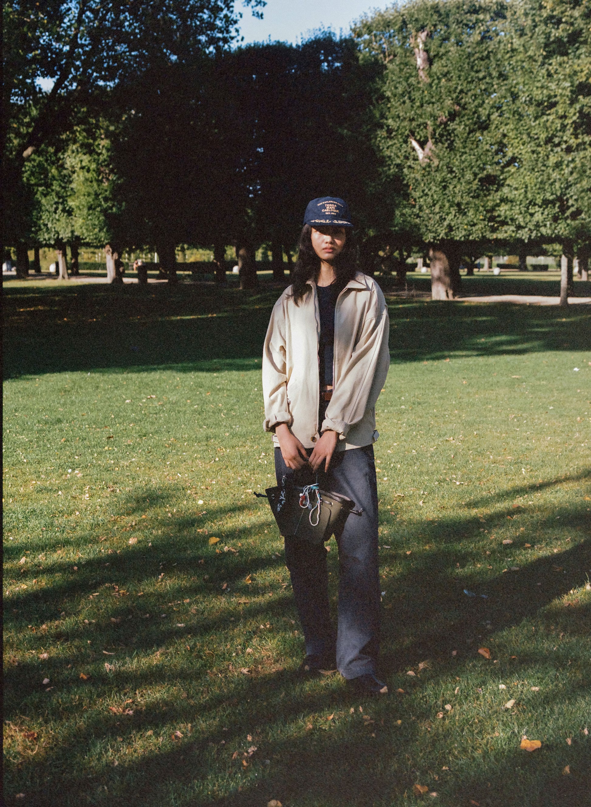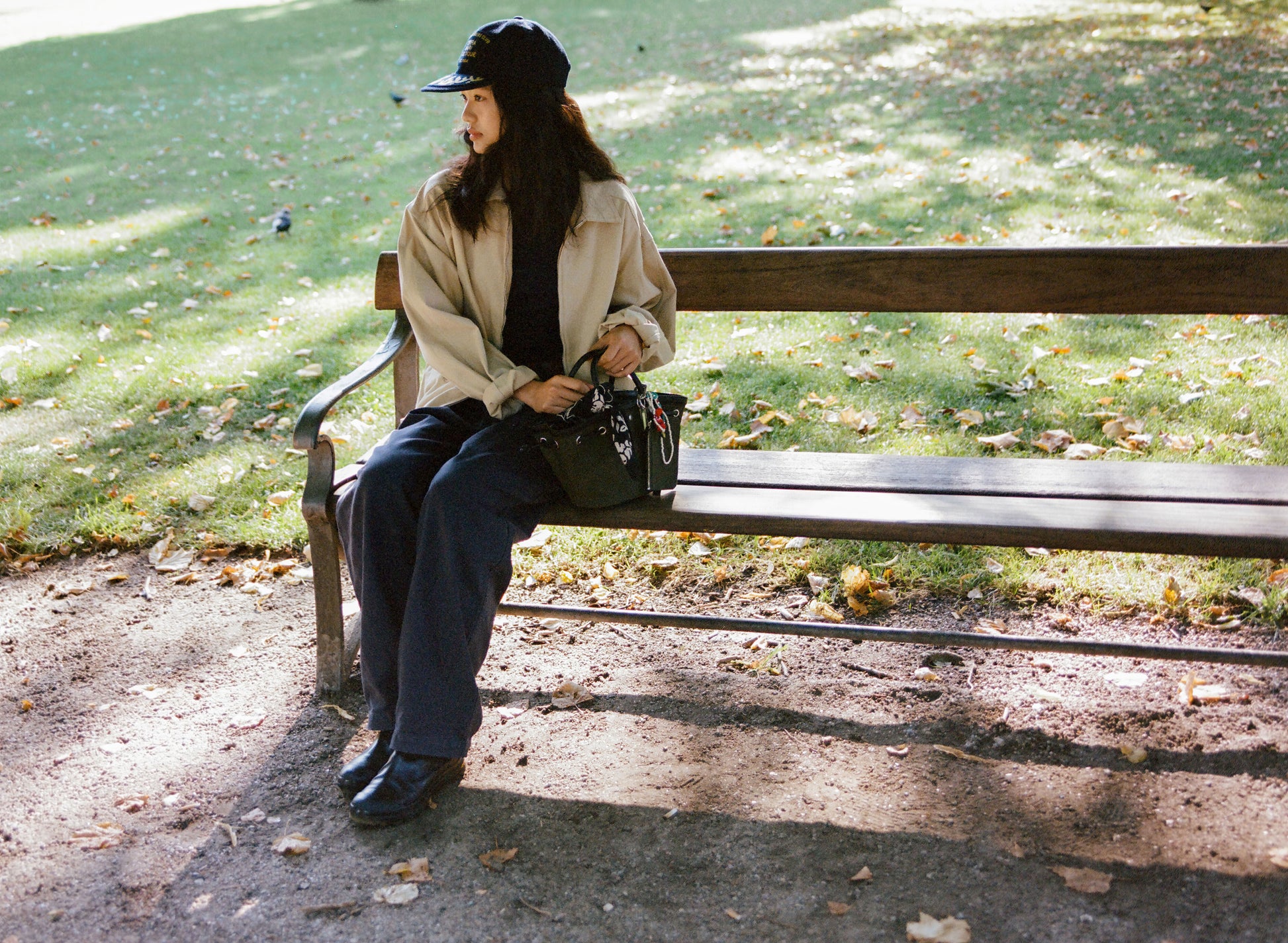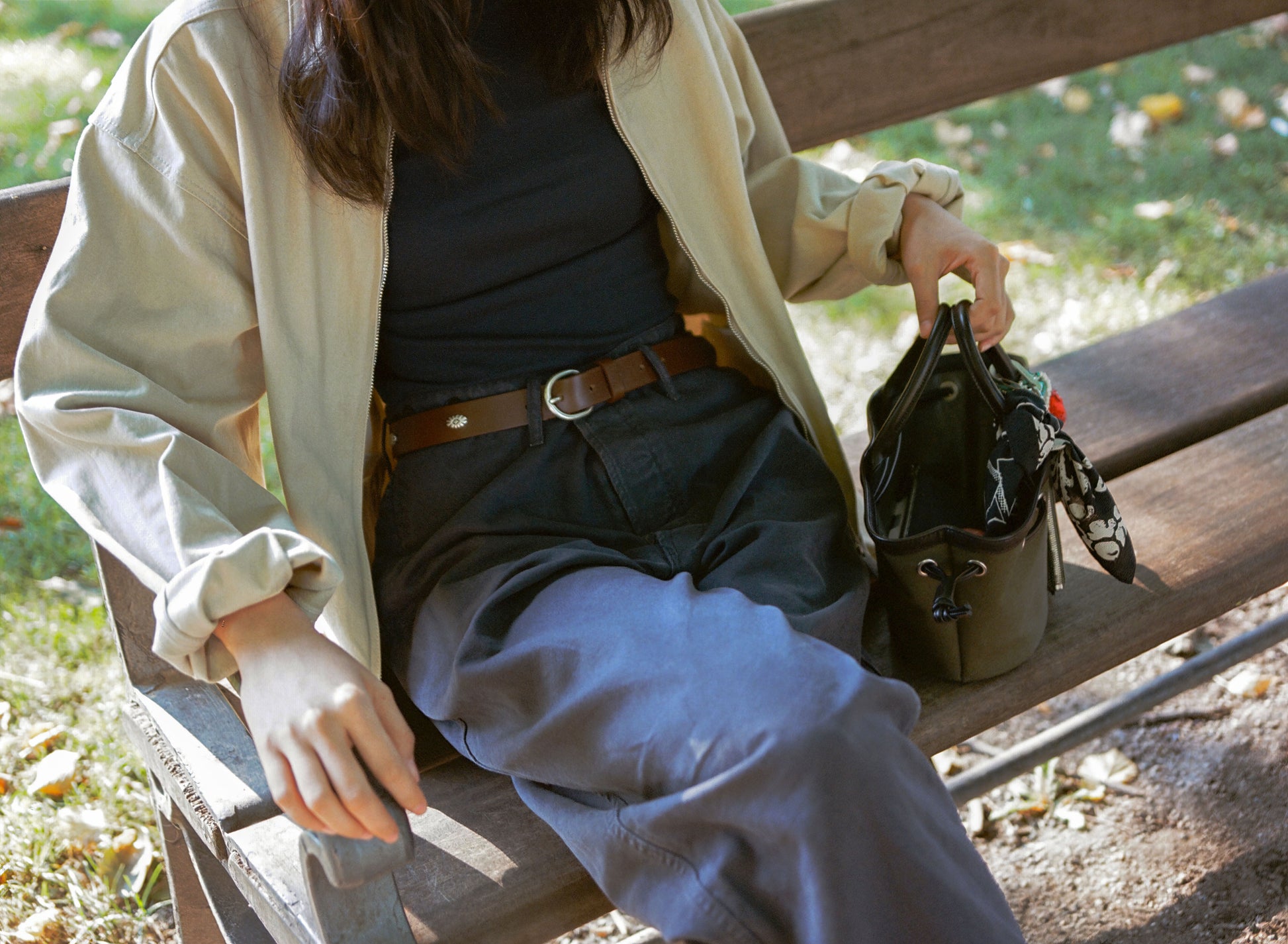 This shopper bag is crafted by combining soft sheepskin with cotton canvas material. Named "COQUILLE," which means "shell" in French, it embodies the feature of a bag that can be freely shaped using the leather string at the top. When carrying many belongings, you can spread it wide to form the shape of a shopper bag, or you can tighten the string to use it as a bucket bag. There's a snap in the center with the logo embossed, allowing for secure closure. Additionally, it comes with a detachable pouch, making it convenient to store small essentials that are frequently needed. The soft and round strap provides a comfortable grip even when the bag is filled with many items, while the sturdy sheepskin bottom provides stability to the bag.