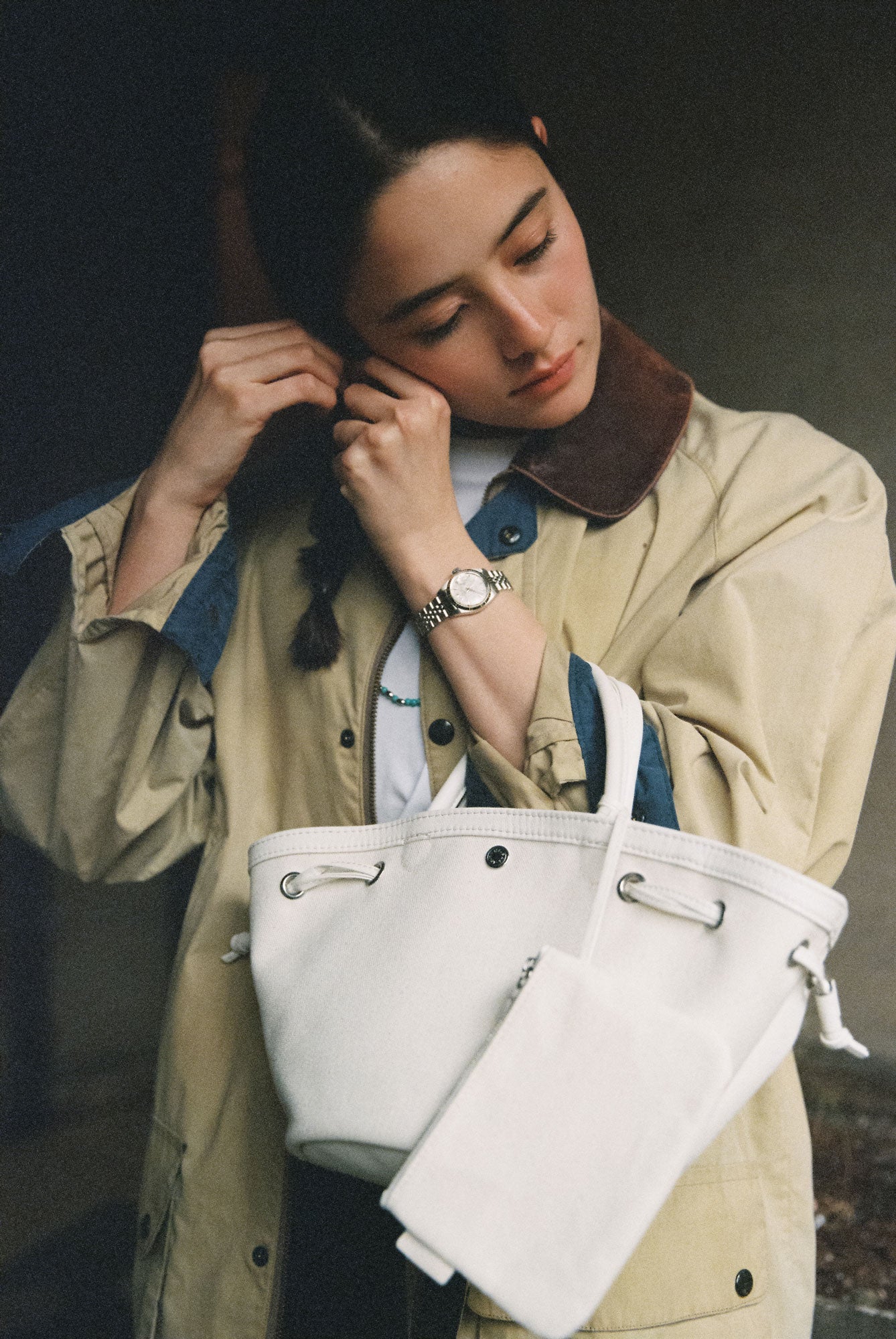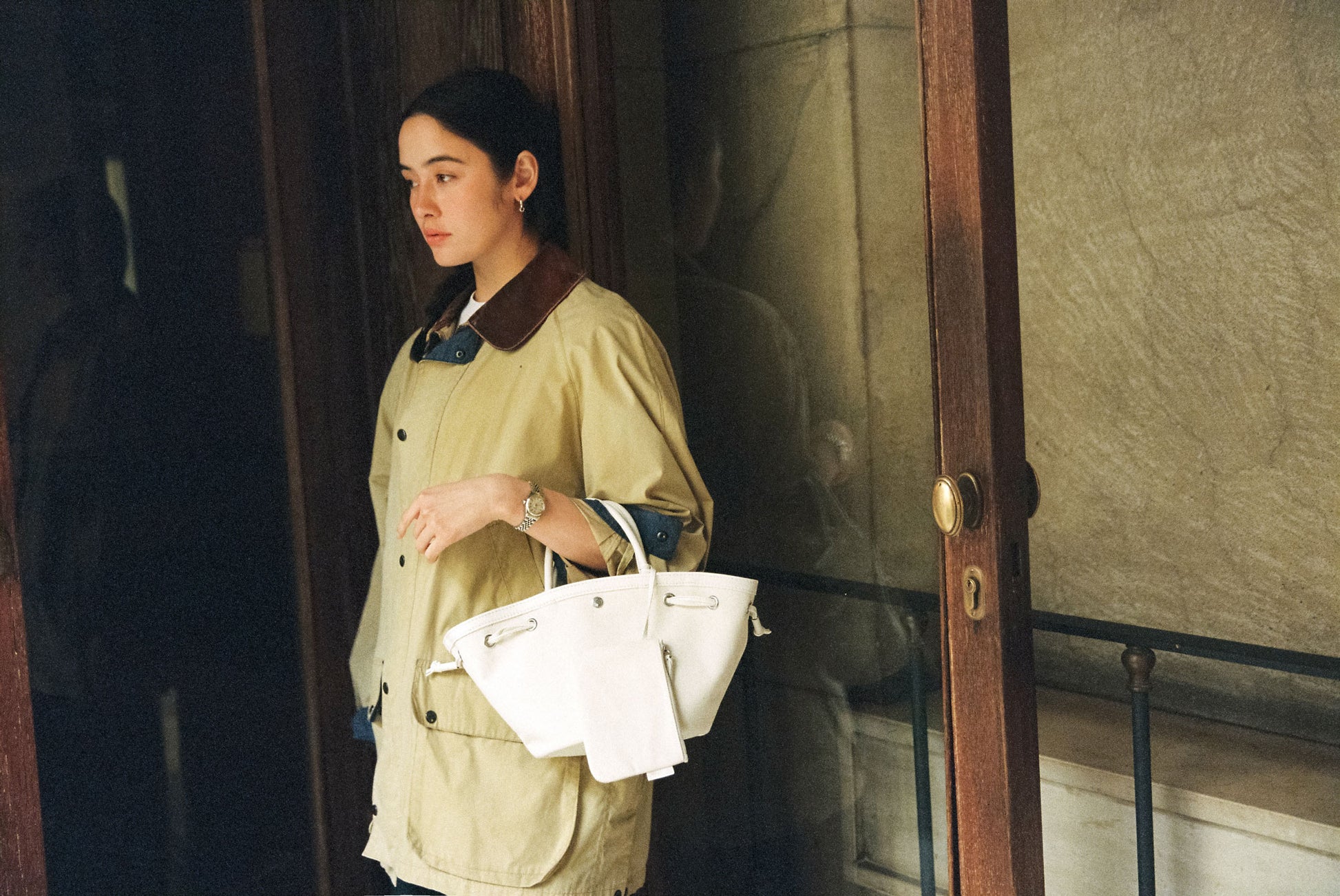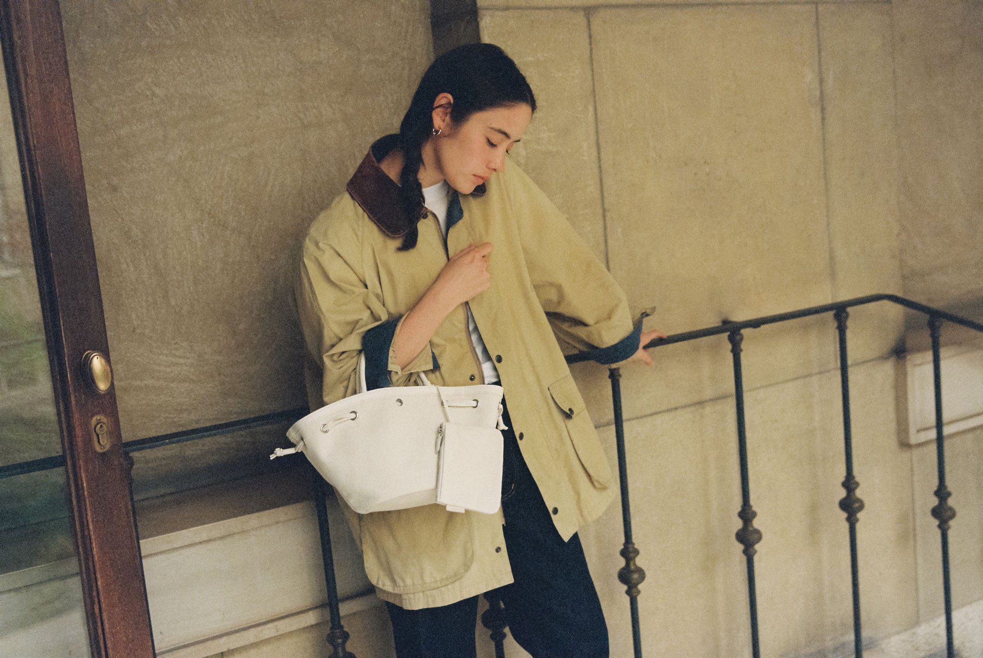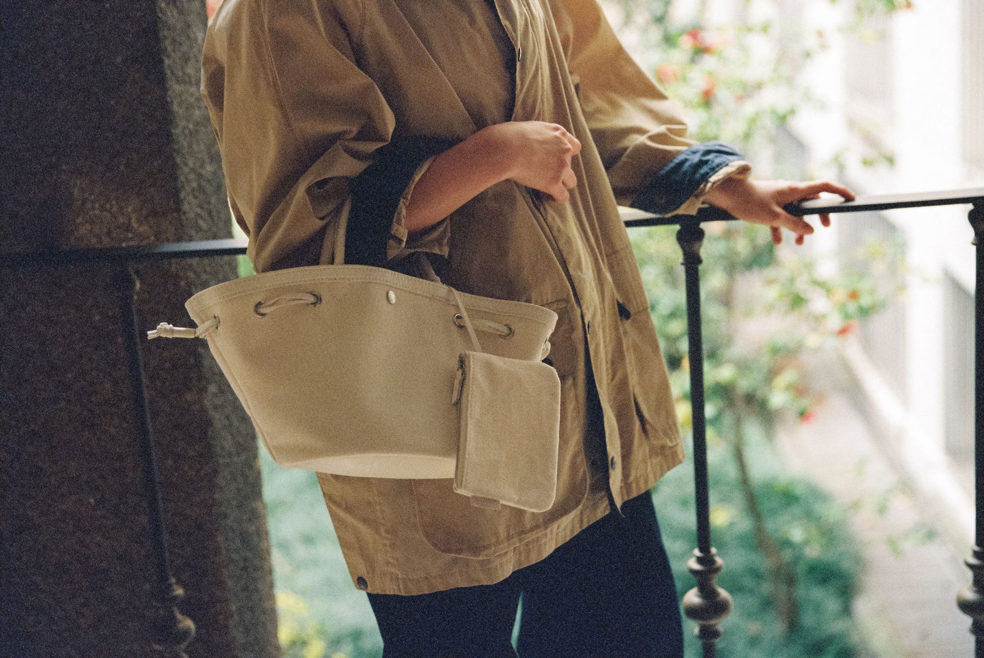 This shopper bag is crafted by combining soft sheepskin with cotton canvas material. Named "COQUILLE," which means "shell" in French, it embodies the feature of a bag that can be freely shaped using the leather string at the top. When carrying many belongings, you can spread it wide to form the shape of a shopper bag, or you can tighten the string to use it as a bucket bag. There's a snap in the center with the logo embossed, allowing for secure closure. Additionally, it comes with a detachable pouch, making it convenient to store small essentials that are frequently needed. The soft and round strap provides a comfortable grip even when the bag is filled with many items, while the sturdy sheepskin bottom provides stability to the bag.