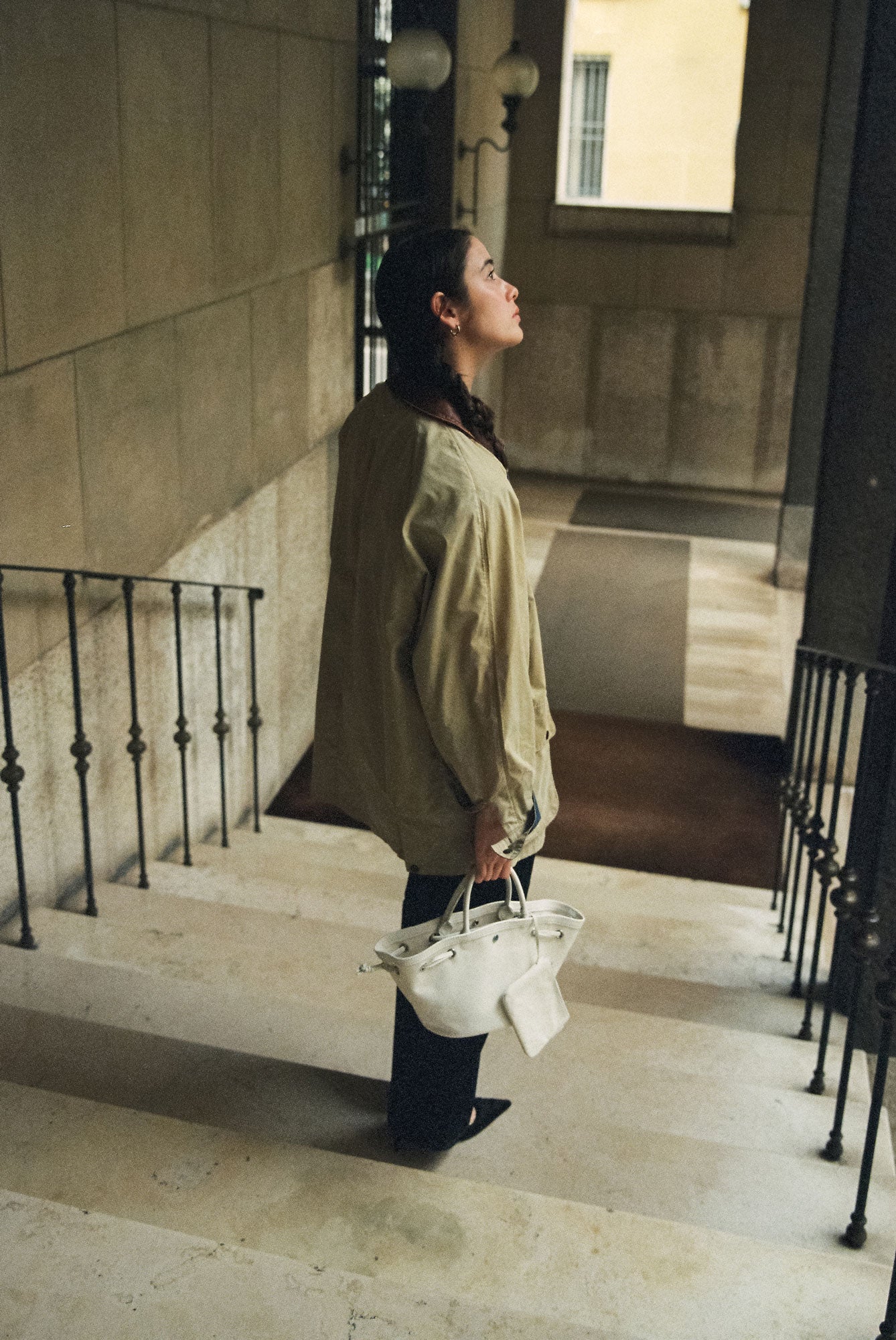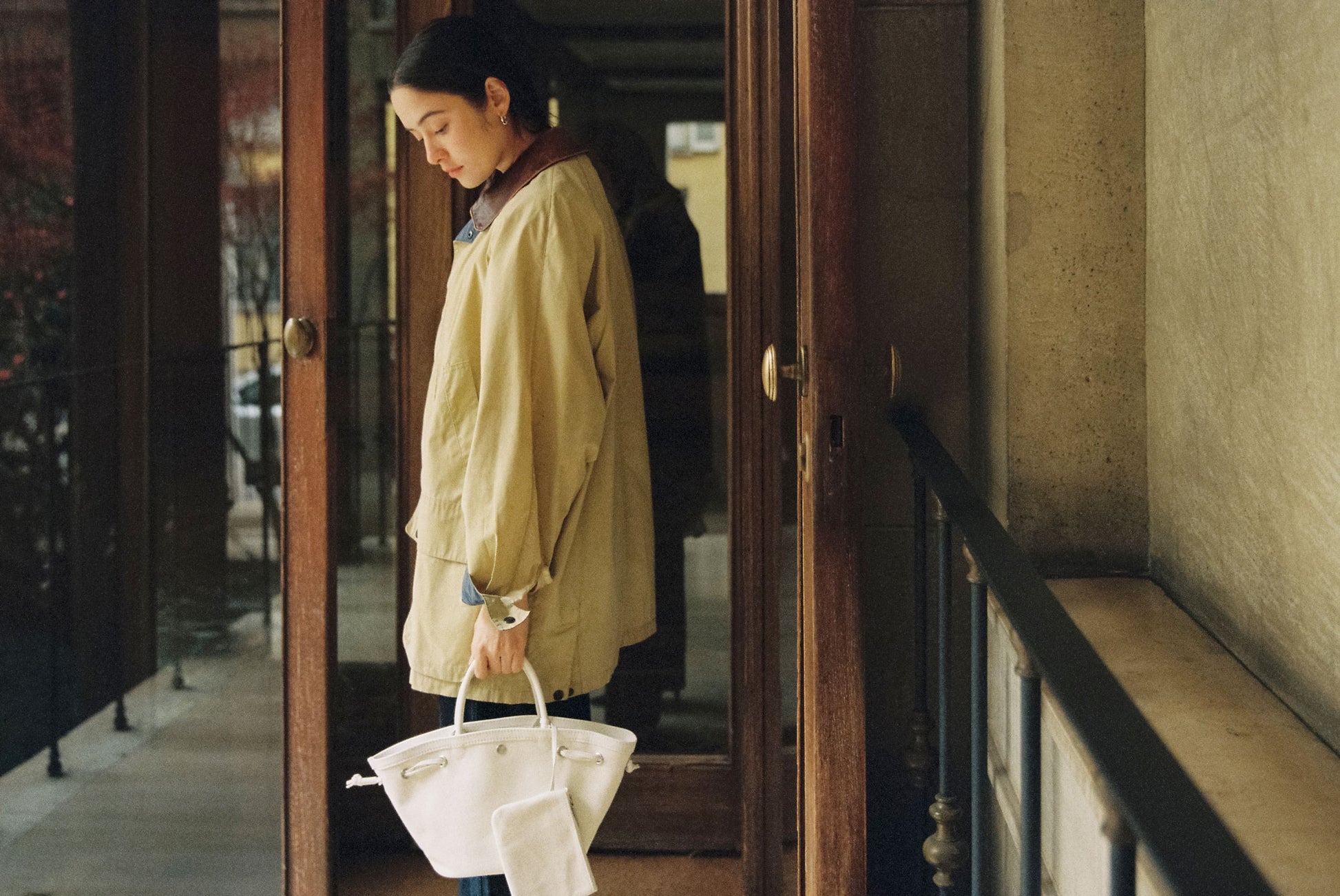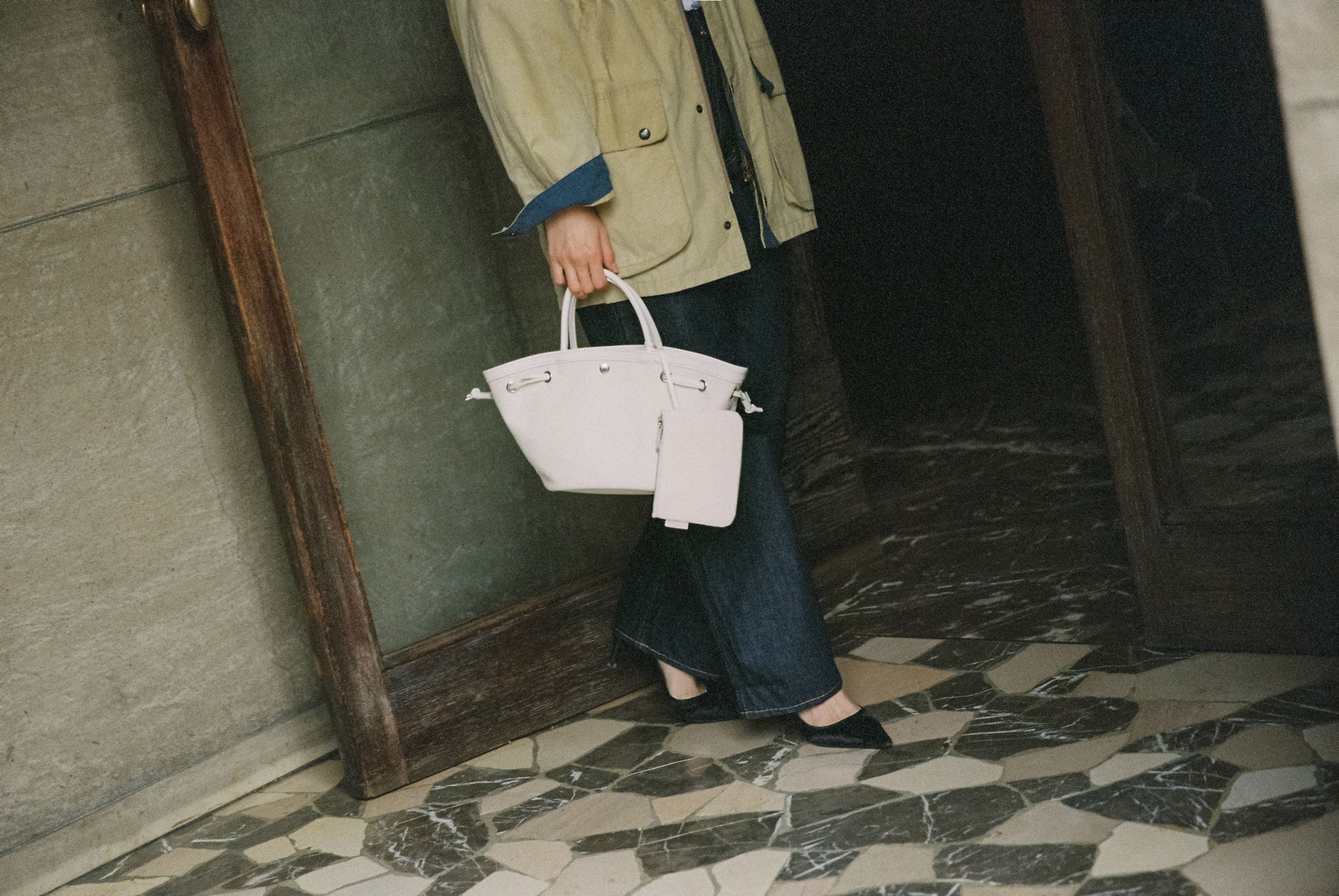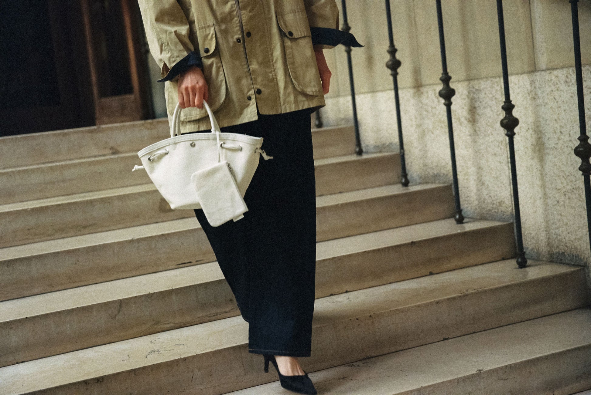 This shopper bag is crafted by combining soft sheepskin with cotton canvas material. Named "COQUILLE," which means "shell" in French, it embodies the feature of a bag that can be freely shaped using the leather string at the top. When carrying many belongings, you can spread it wide to form the shape of a shopper bag, or you can tighten the string to use it as a bucket bag. There's a snap in the center with the logo embossed, allowing for secure closure. Additionally, it comes with a detachable pouch, making it convenient to store small essentials that are frequently needed. The soft and round strap provides a comfortable grip even when the bag is filled with many items, while the sturdy sheepskin bottom provides stability to the bag.