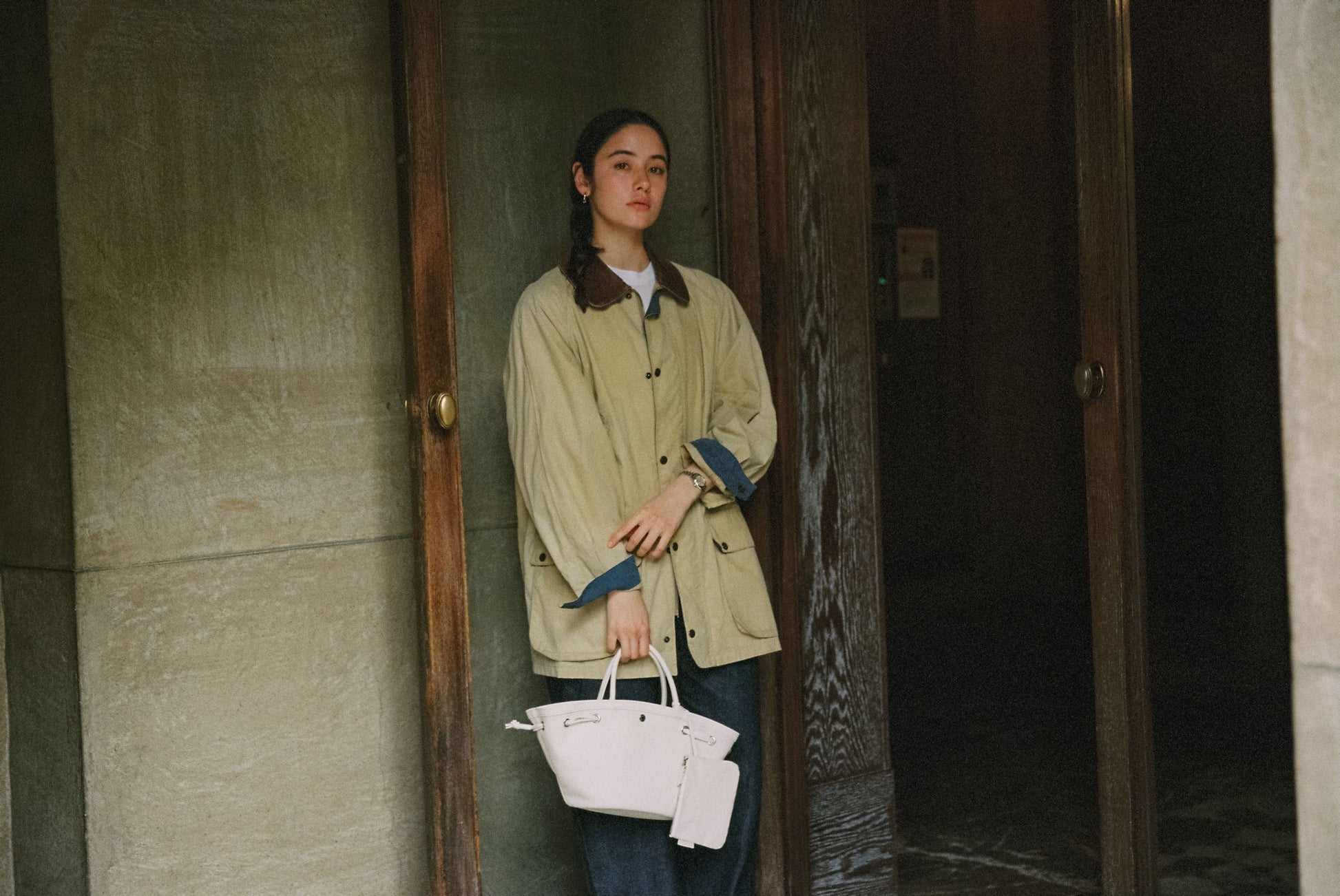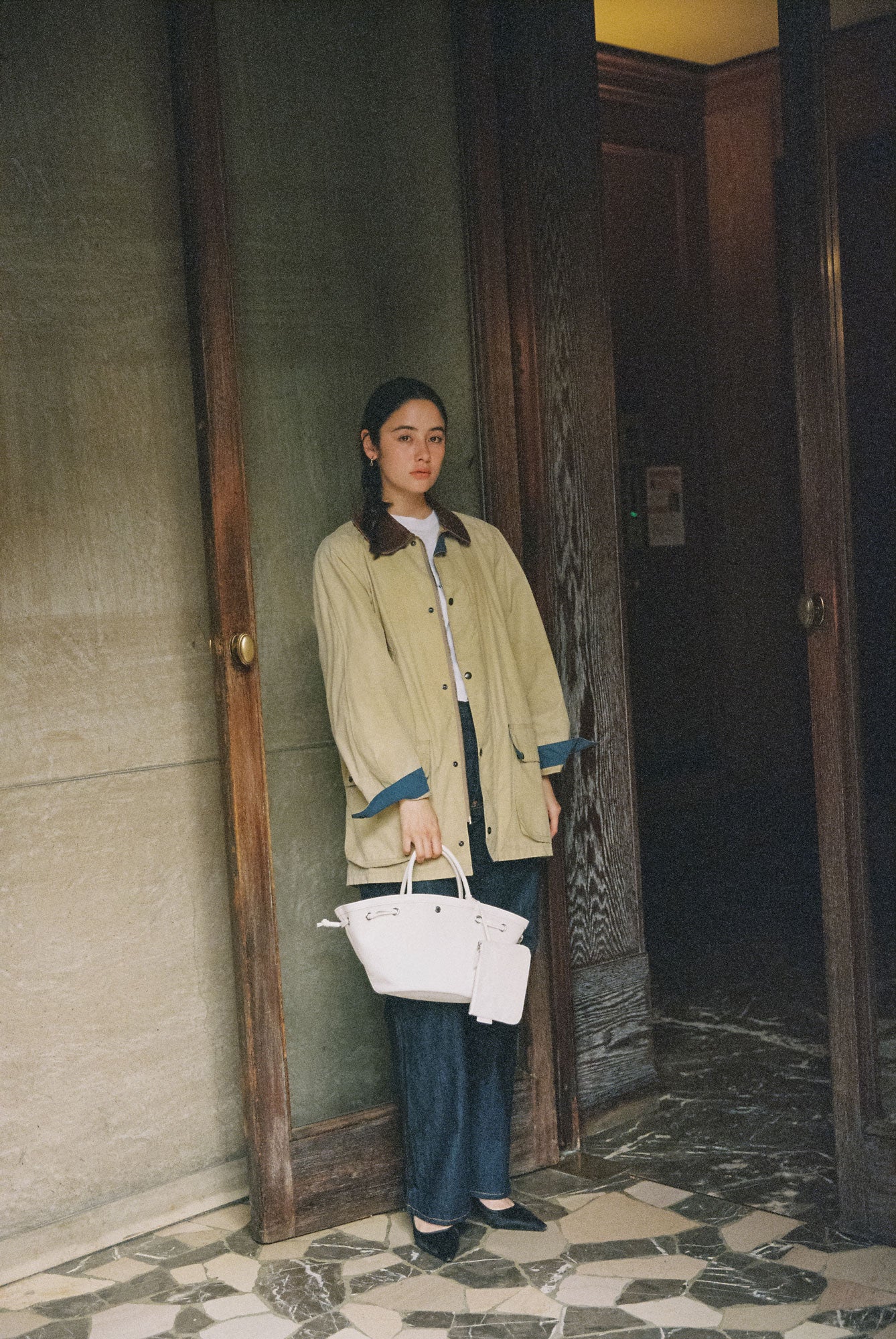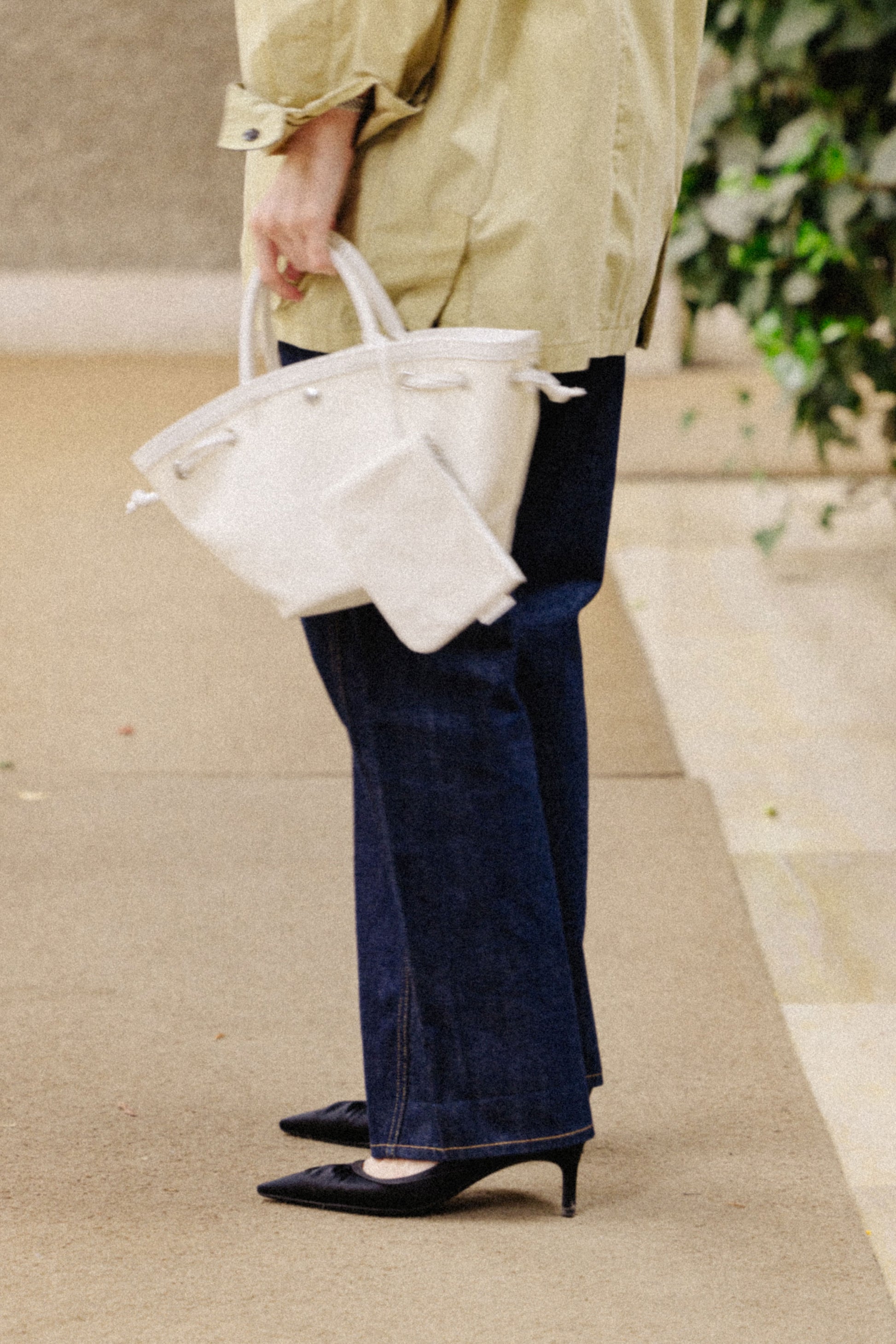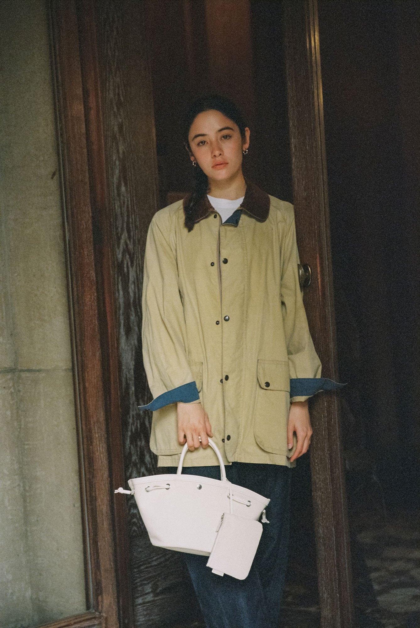 This shopper bag is crafted by combining soft sheepskin with cotton canvas material. Named "COQUILLE," which means "shell" in French, it embodies the feature of a bag that can be freely shaped using the leather string at the top. When carrying many belongings, you can spread it wide to form the shape of a shopper bag, or you can tighten the string to use it as a bucket bag. There's a snap in the center with the logo embossed, allowing for secure closure. Additionally, it comes with a detachable pouch, making it convenient to store small essentials that are frequently needed. The soft and round strap provides a comfortable grip even when the bag is filled with many items, while the sturdy sheepskin bottom provides stability to the bag.