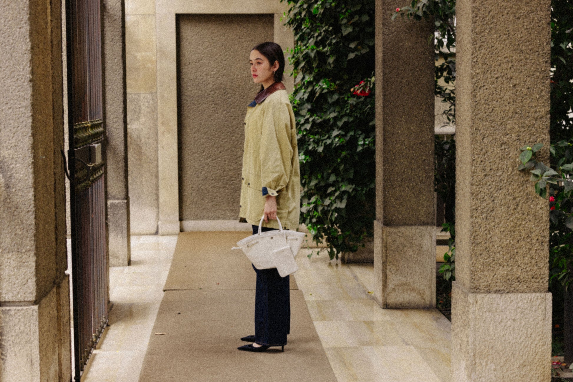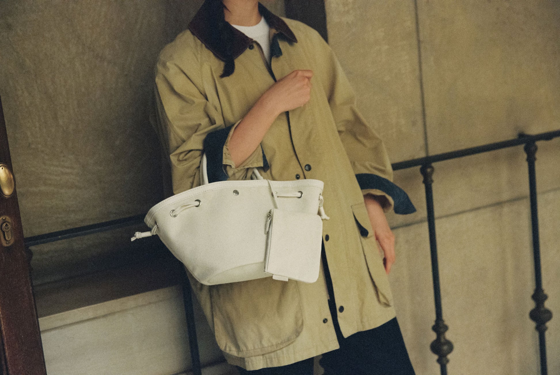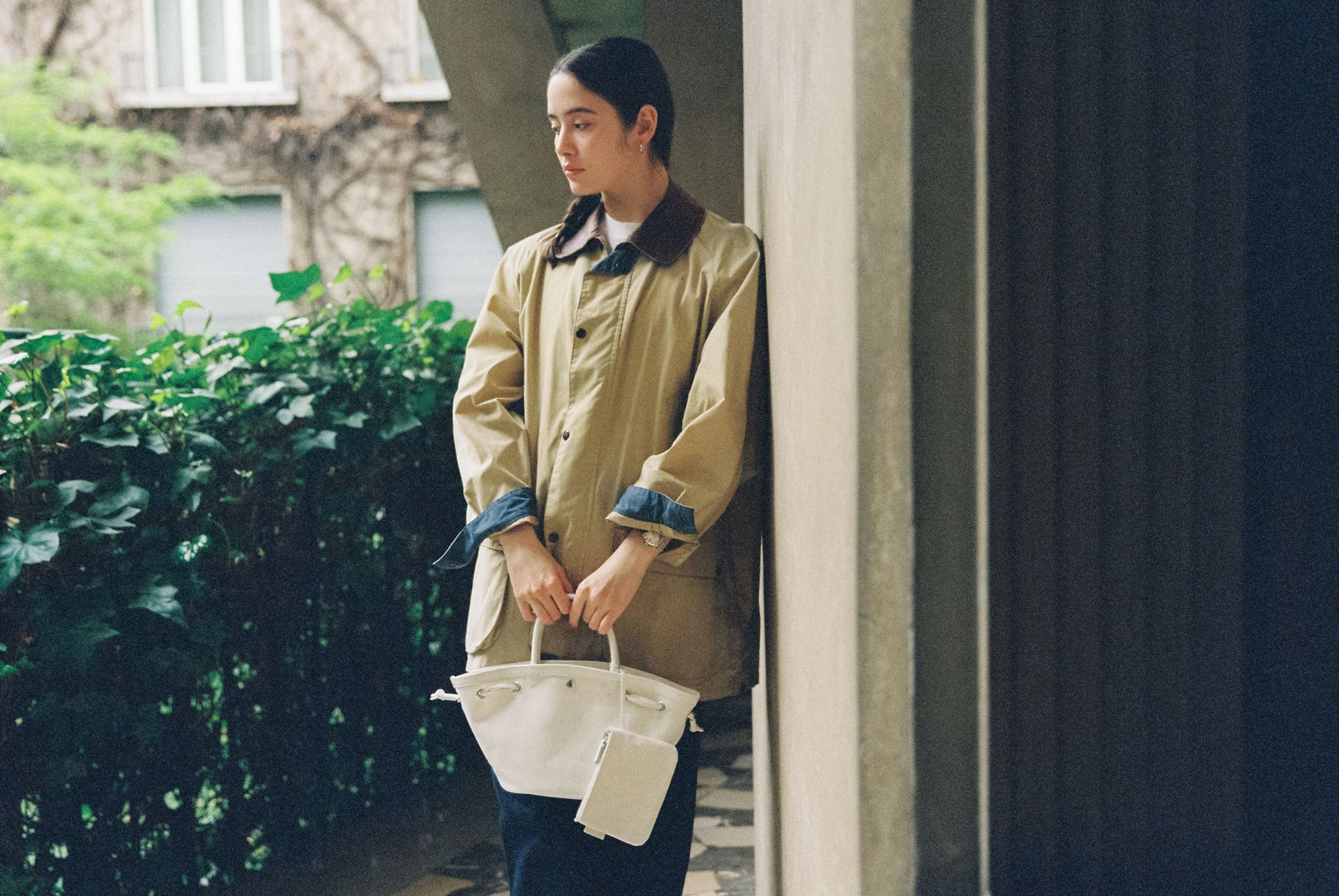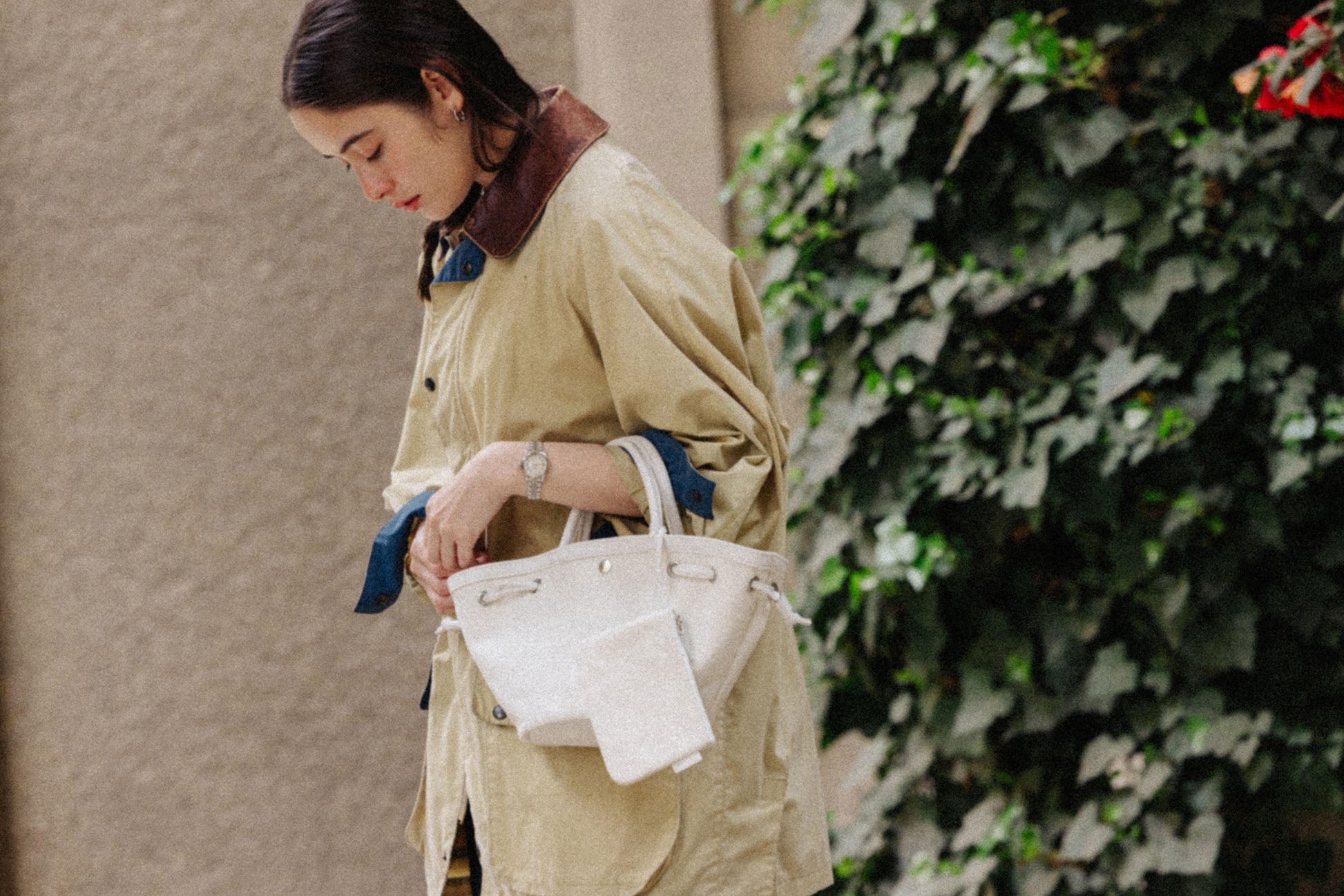This shopper bag is crafted by combining soft sheepskin with cotton canvas material. Named "COQUILLE," which means "shell" in French, it embodies the feature of a bag that can be freely shaped using the leather string at the top. When carrying many belongings, you can spread it wide to form the shape of a shopper bag, or you can tighten the string to use it as a bucket bag. There's a snap in the center with the logo embossed, allowing for secure closure. Additionally, it comes with a detachable pouch, making it convenient to store small essentials that are frequently needed. The soft and round strap provides a comfortable grip even when the bag is filled with many items, while the sturdy sheepskin bottom provides stability to the bag.