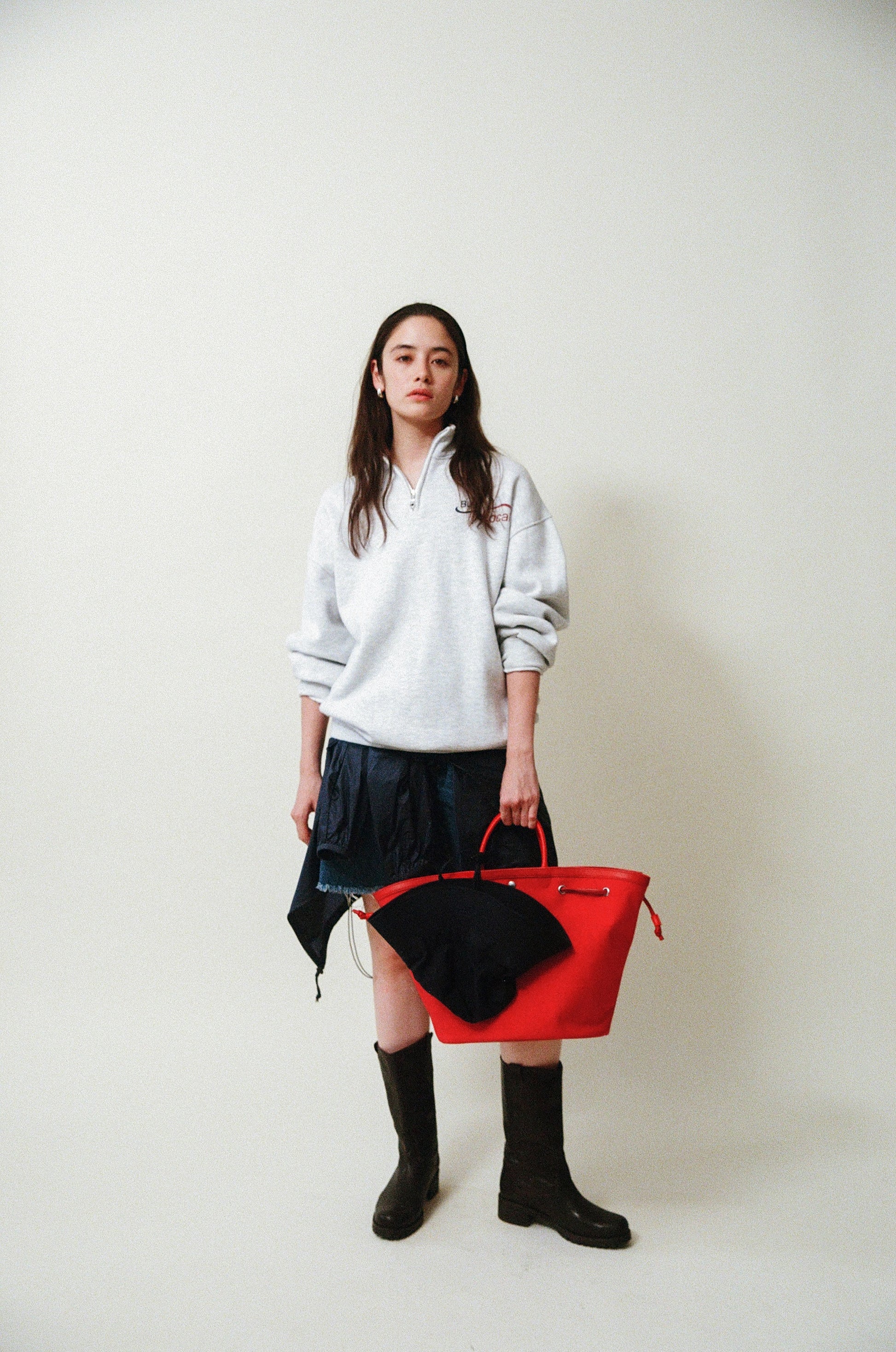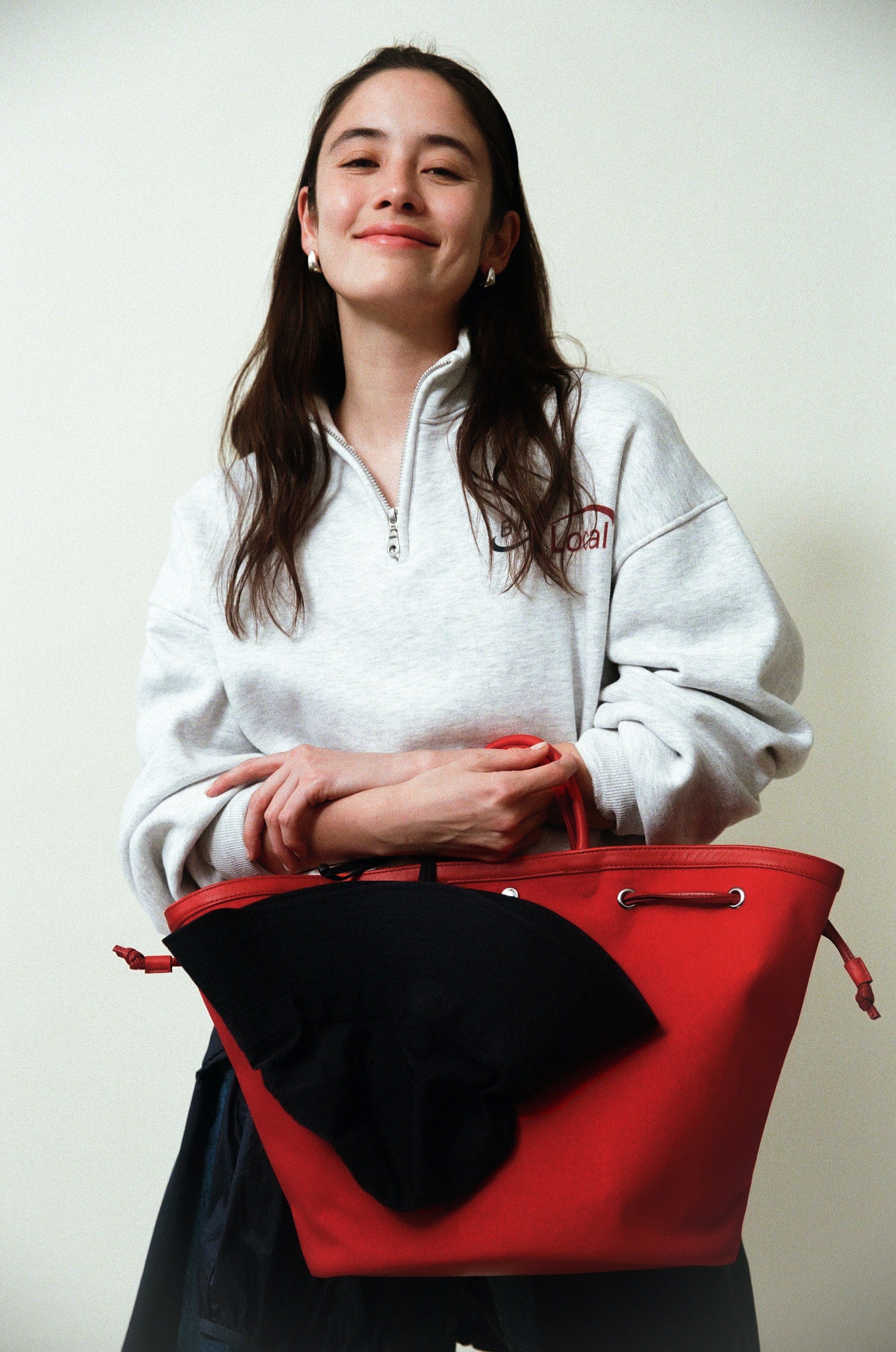 This shopper bag is crafted by combining soft sheepskin with cotton canvas material. Named "COQUILLE," which means "shell" in French, it embodies the feature of a bag that can be freely shaped using the leather string at the top. When carrying many belongings, you can spread it wide to form the shape of a shopper bag, or you can tighten the string to use it as a bucket bag. There's a snap in the center with the logo embossed, allowing for secure closure. Additionally, it comes with a detachable pouch, making it convenient to store small essentials that are frequently needed. The soft and round strap provides a comfortable grip even when the bag is filled with many items, while the sturdy sheepskin bottom provides stability to the bag.