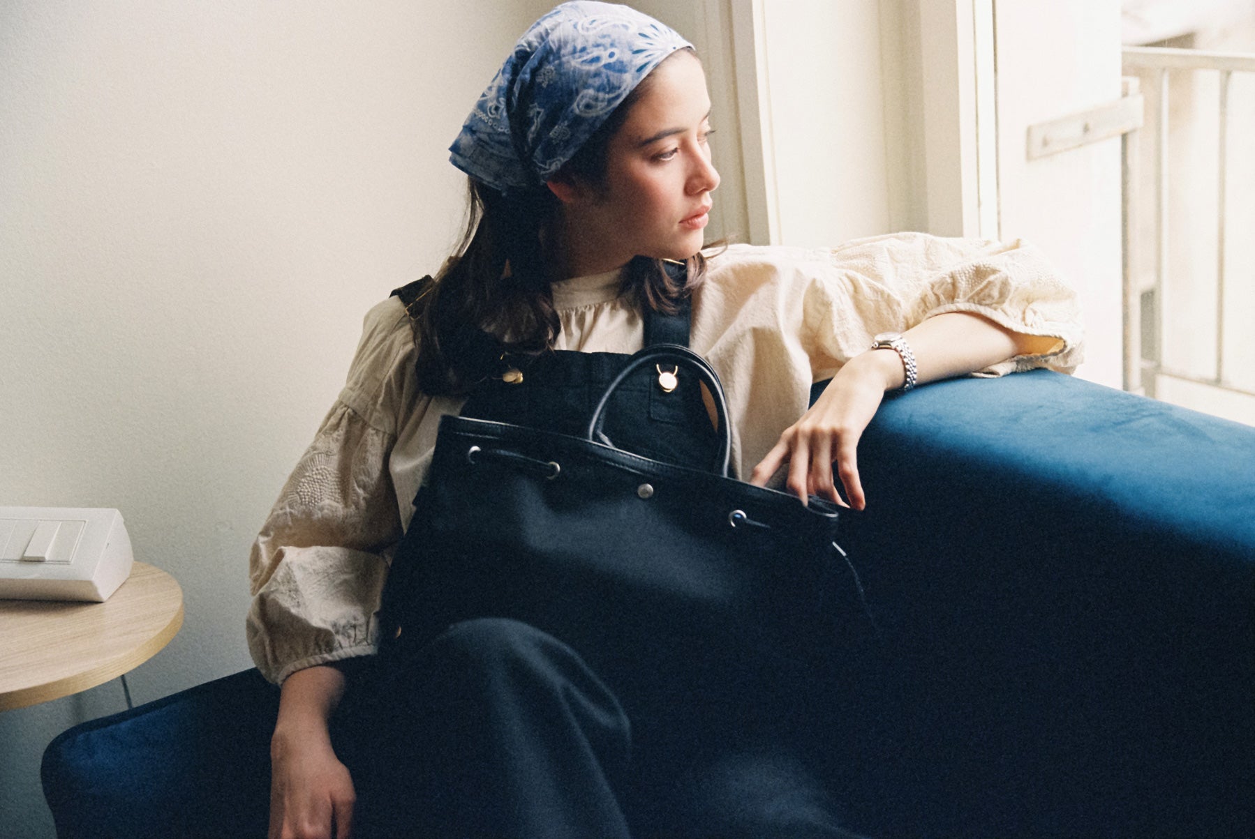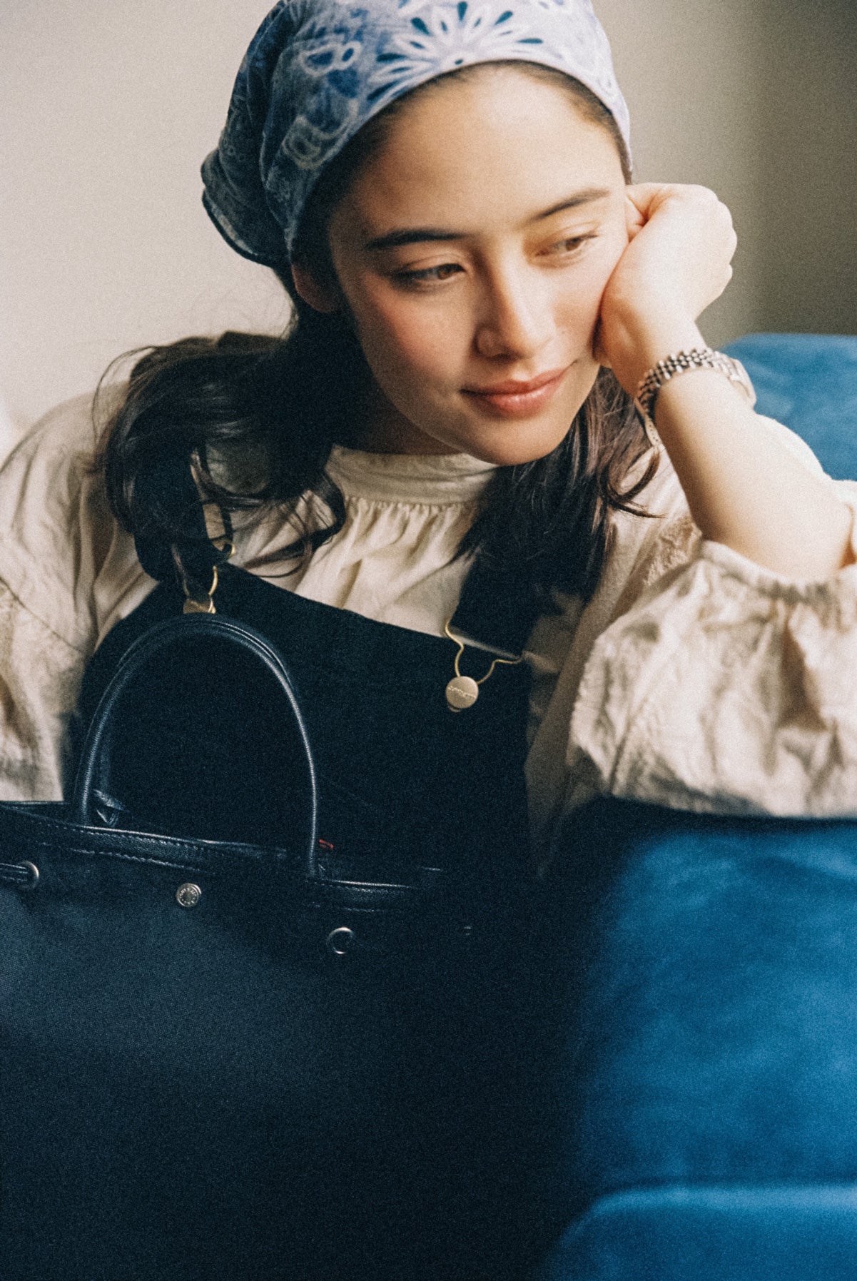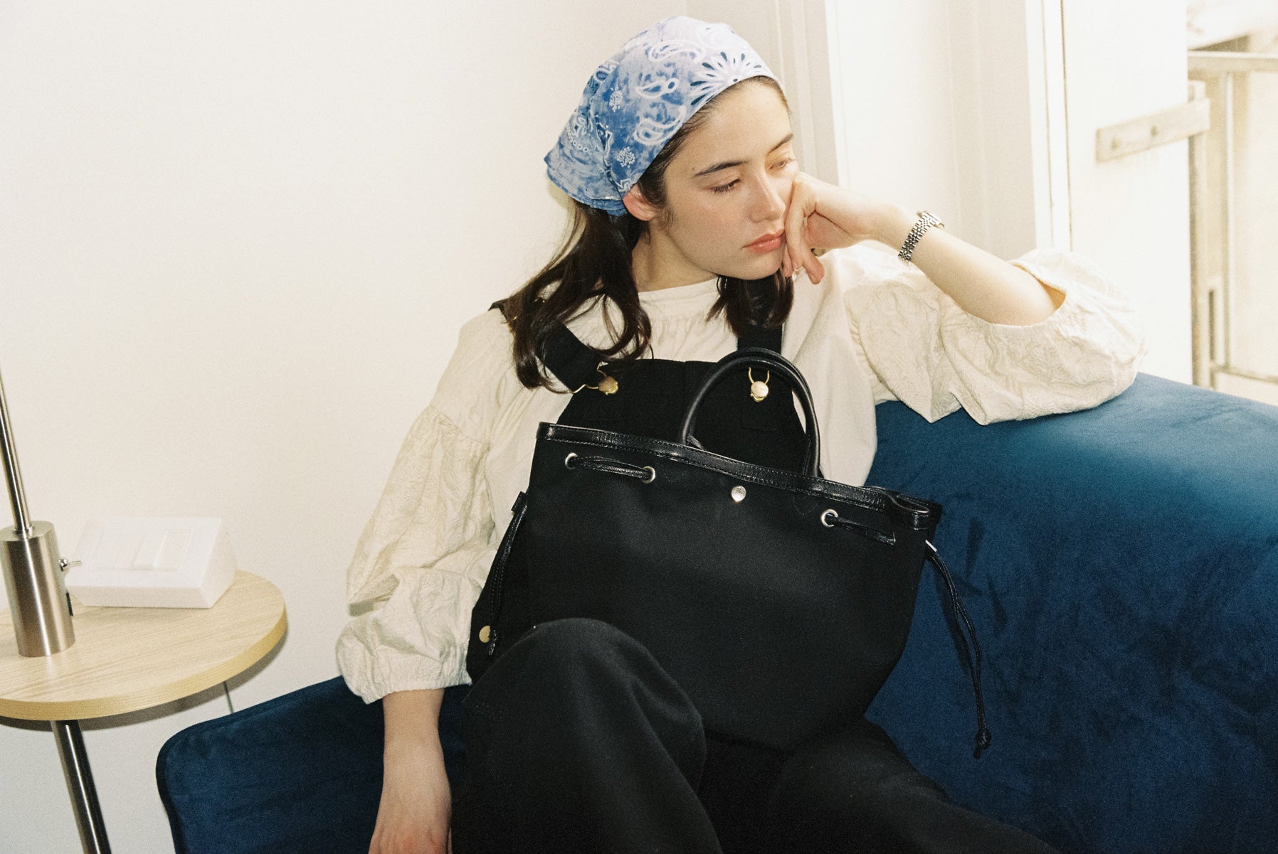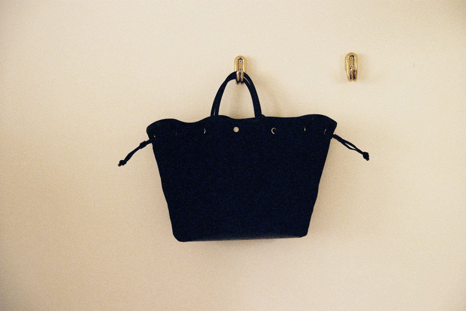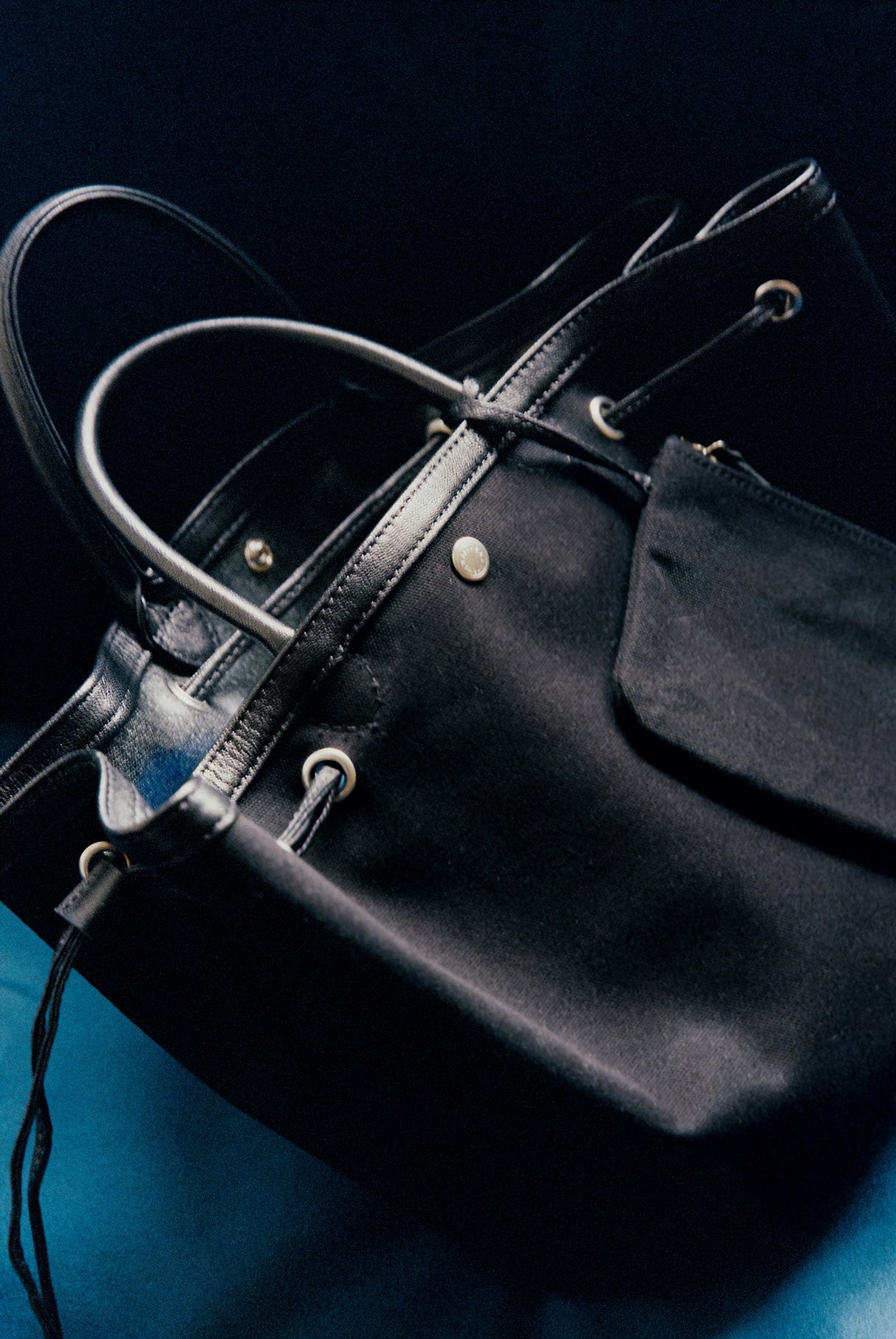 This shopper bag is crafted by combining soft sheepskin with cotton canvas material. Named "COQUILLE," which means "shell" in French, it embodies the feature of a bag that can be freely shaped using the leather string at the top. When carrying many belongings, you can spread it wide to form the shape of a shopper bag, or you can tighten the string to use it as a bucket bag. There's a snap in the center with the logo embossed, allowing for secure closure. Additionally, it comes with a detachable pouch, making it convenient to store small essentials that are frequently needed. The soft and round strap provides a comfortable grip even when the bag is filled with many items, while the sturdy sheepskin bottom provides stability to the bag.