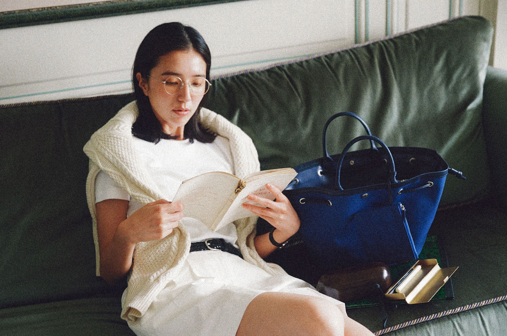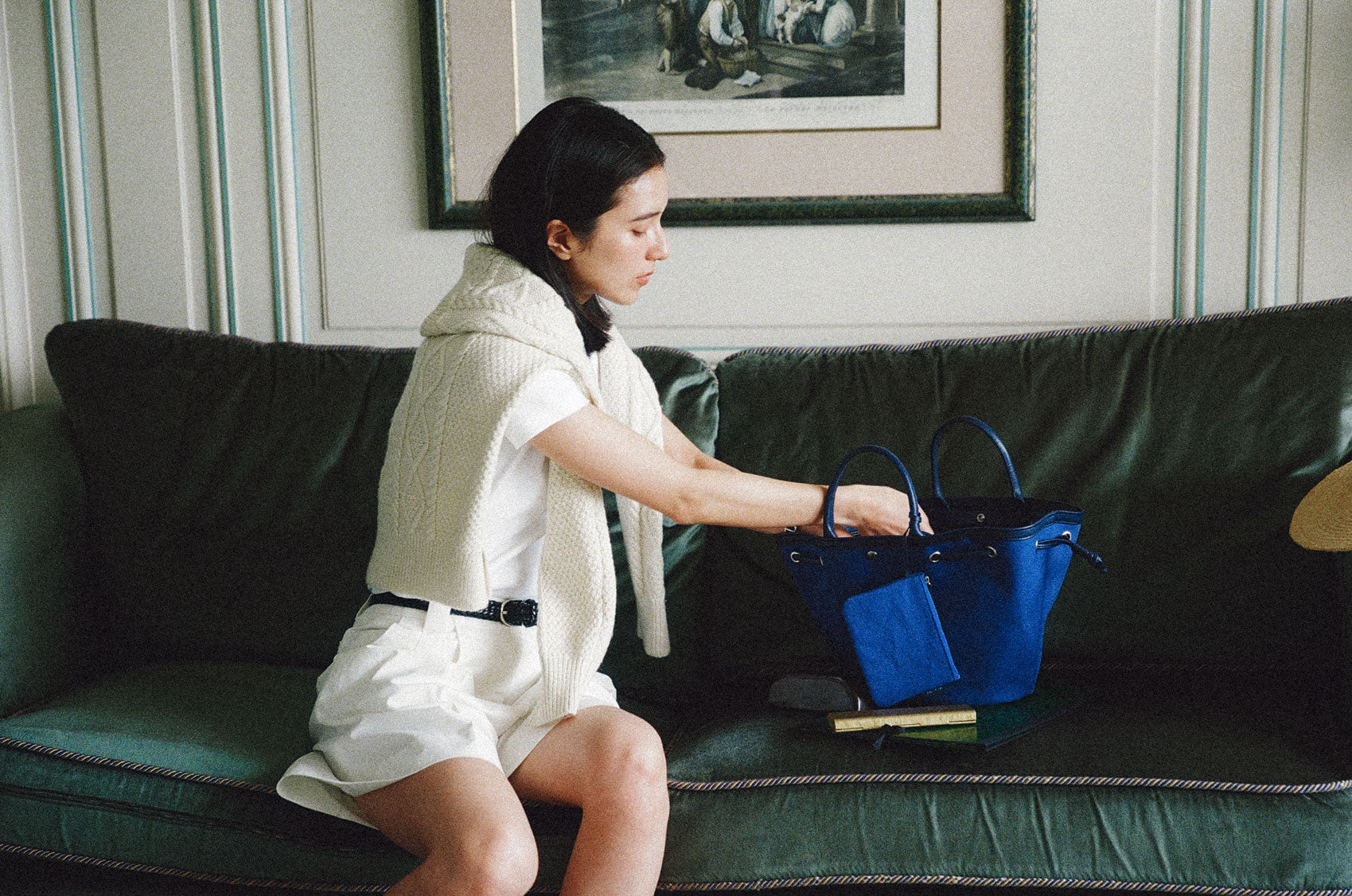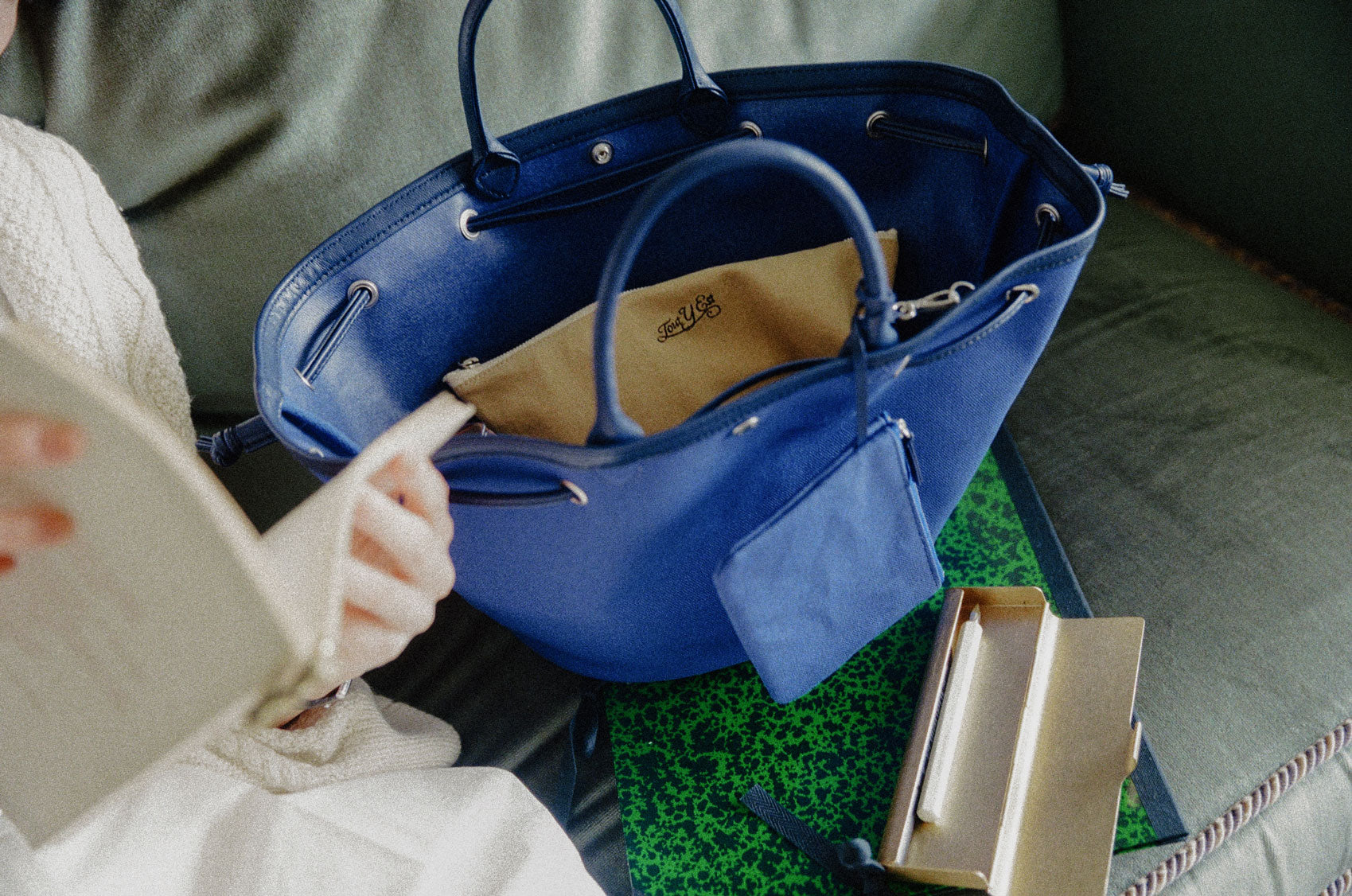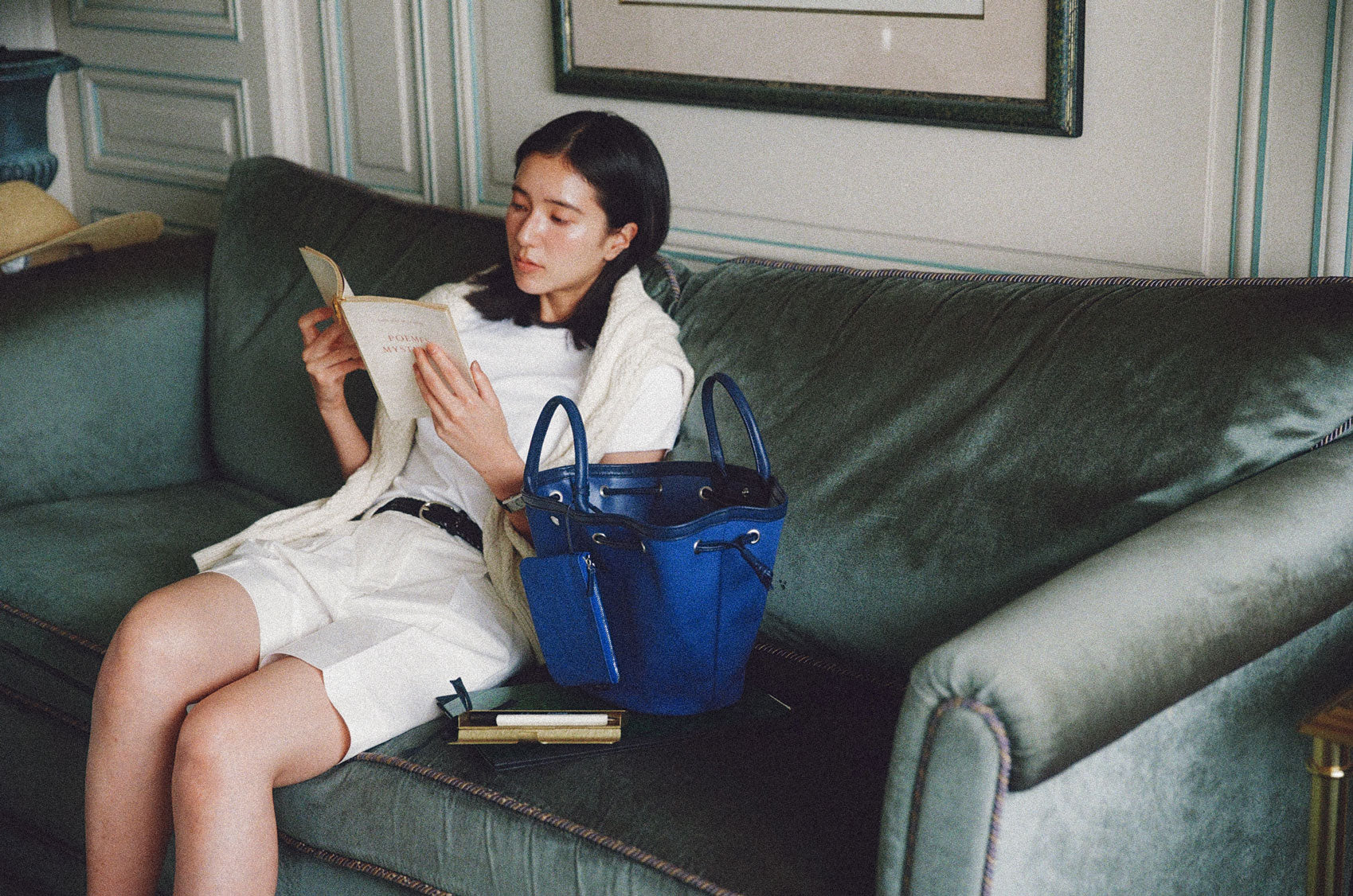 This shopper bag is crafted by combining soft sheepskin with cotton canvas material. Named "COQUILLE," which means "shell" in French, it embodies the feature of a bag that can be freely shaped using the leather string at the top. When carrying many belongings, you can spread it wide to form the shape of a shopper bag, or you can tighten the string to use it as a bucket bag. There's a snap in the center with the logo embossed, allowing for secure closure. Additionally, it comes with a detachable pouch, making it convenient to store small essentials that are frequently needed. The soft and round strap provides a comfortable grip even when the bag is filled with many items, while the sturdy sheepskin bottom provides stability to the bag.
