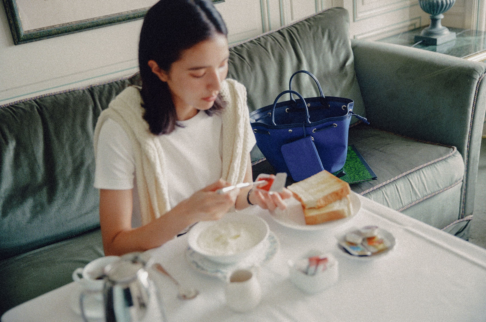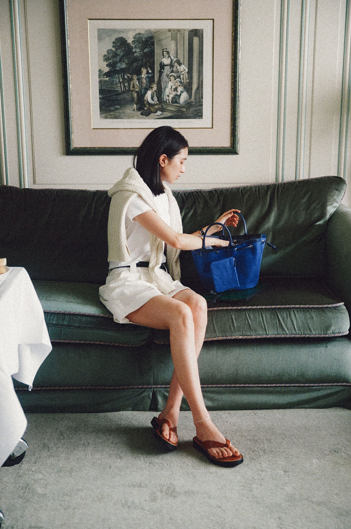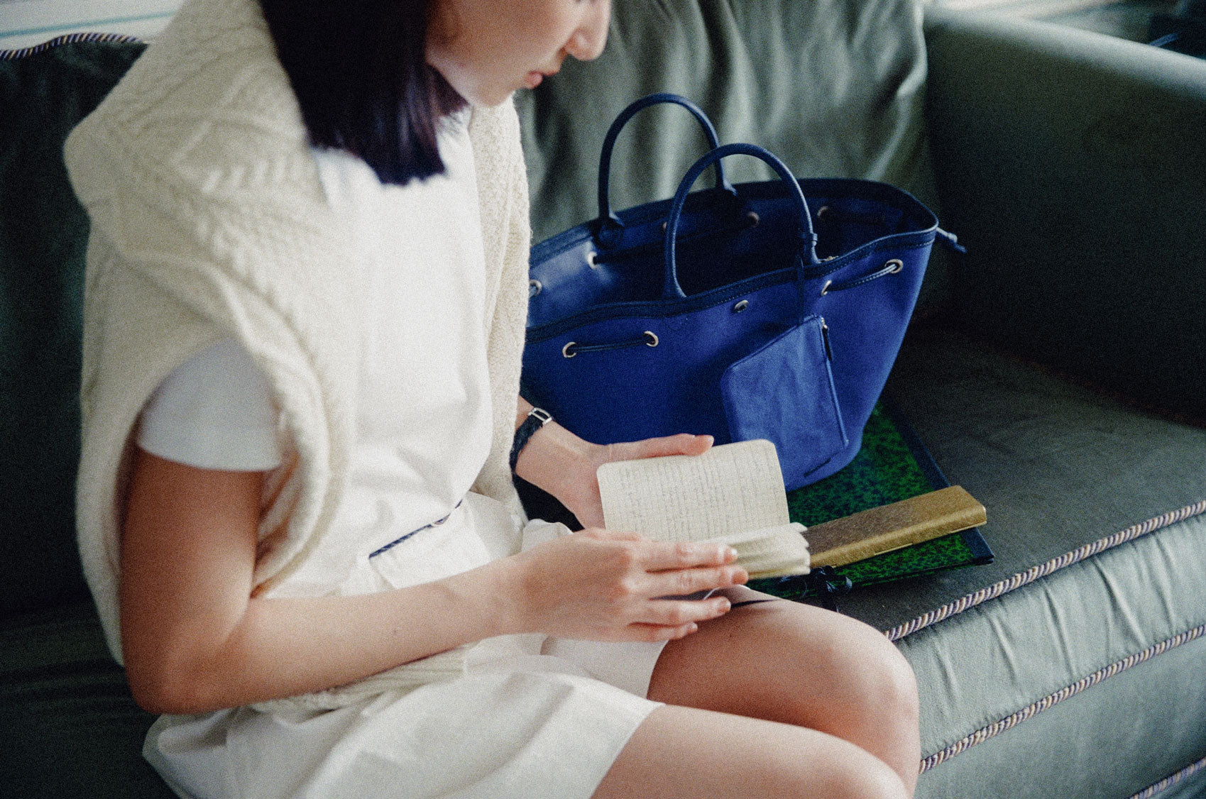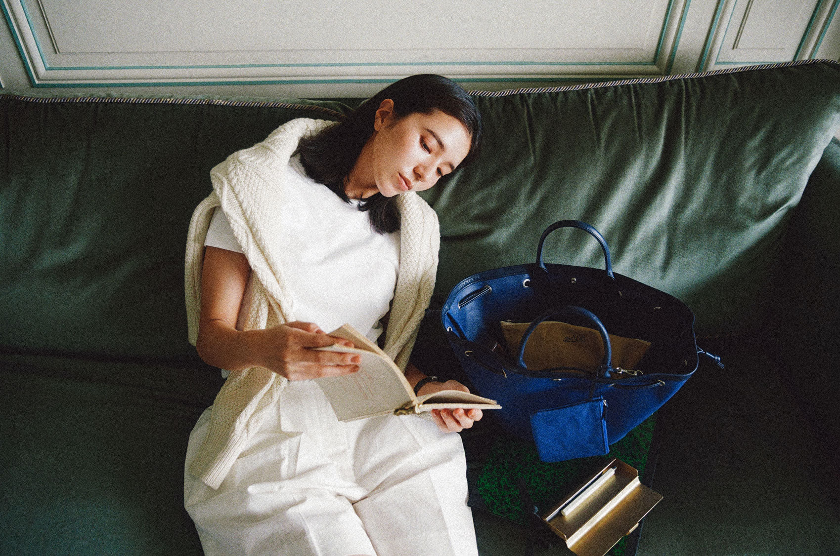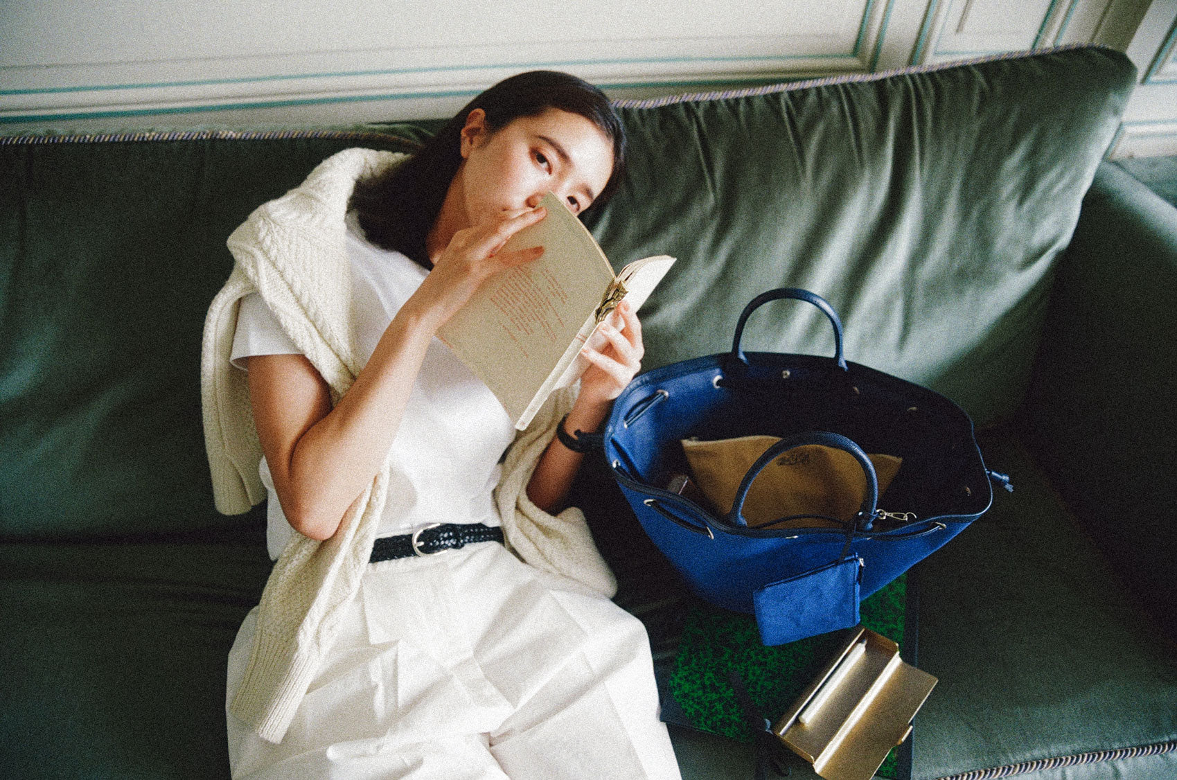 This shopper bag is crafted by combining soft sheepskin with cotton canvas material. Named "COQUILLE," which means "shell" in French, it embodies the feature of a bag that can be freely shaped using the leather string at the top. When carrying many belongings, you can spread it wide to form the shape of a shopper bag, or you can tighten the string to use it as a bucket bag. There's a snap in the center with the logo embossed, allowing for secure closure. Additionally, it comes with a detachable pouch, making it convenient to store small essentials that are frequently needed. The soft and round strap provides a comfortable grip even when the bag is filled with many items, while the sturdy sheepskin bottom provides stability to the bag.