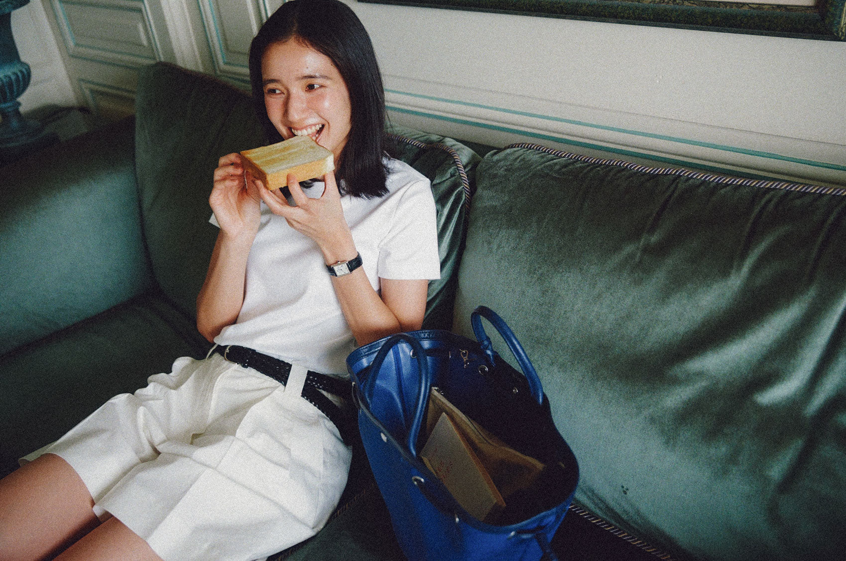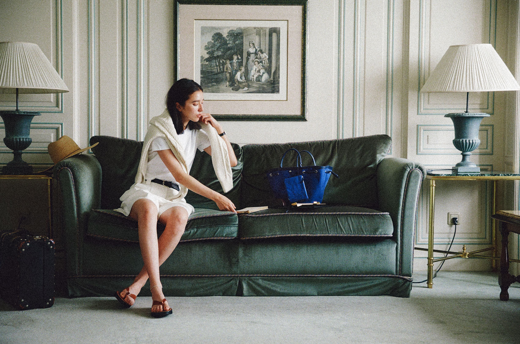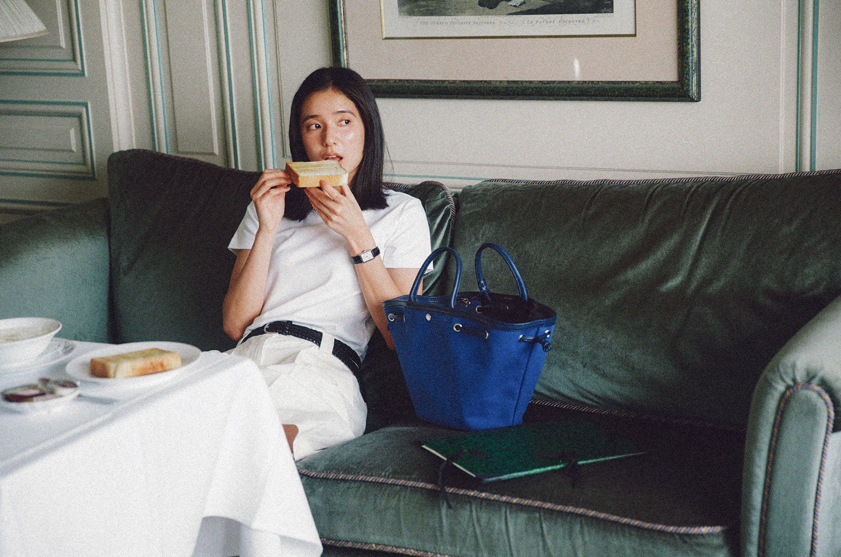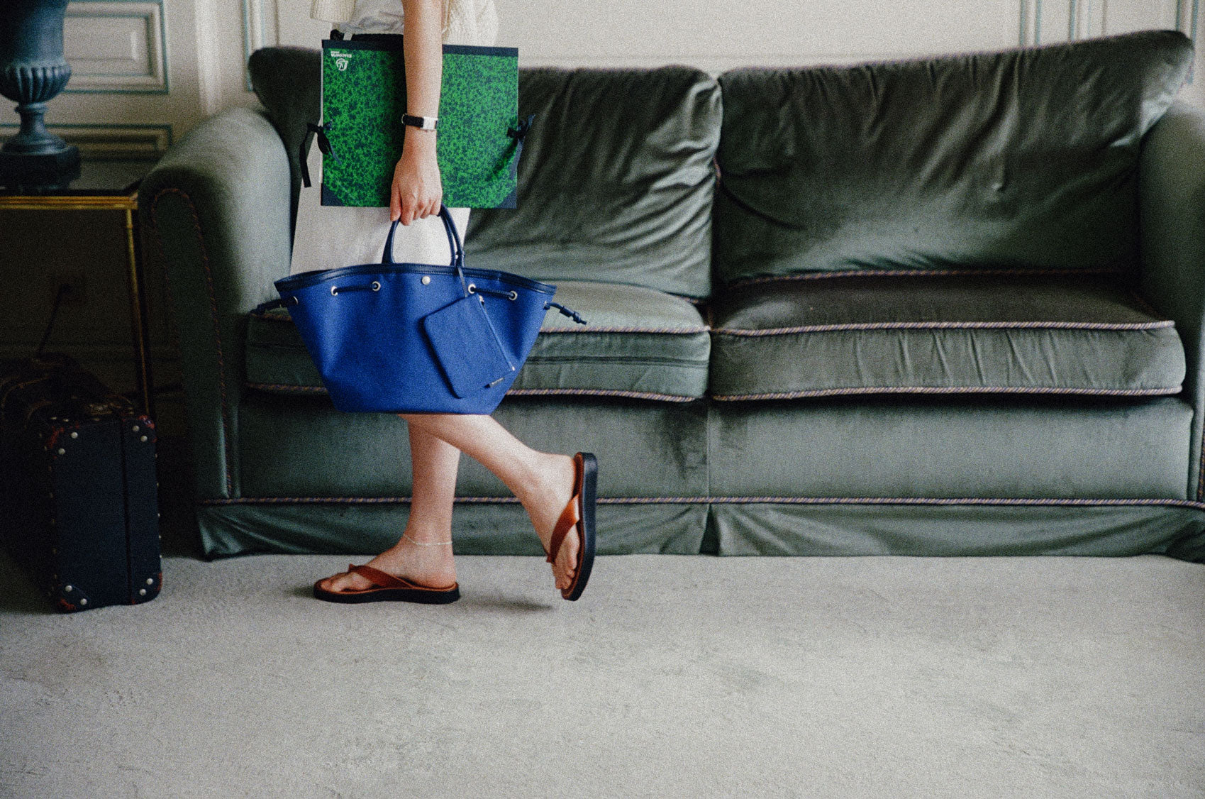 This shopper bag is crafted by combining soft sheepskin with cotton canvas material. Named "COQUILLE," which means "shell" in French, it embodies the feature of a bag that can be freely shaped using the leather string at the top. When carrying many belongings, you can spread it wide to form the shape of a shopper bag, or you can tighten the string to use it as a bucket bag. There's a snap in the center with the logo embossed, allowing for secure closure. Additionally, it comes with a detachable pouch, making it convenient to store small essentials that are frequently needed. The soft and round strap provides a comfortable grip even when the bag is filled with many items, while the sturdy sheepskin bottom provides stability to the bag.