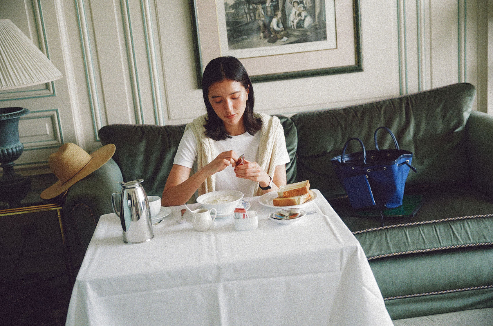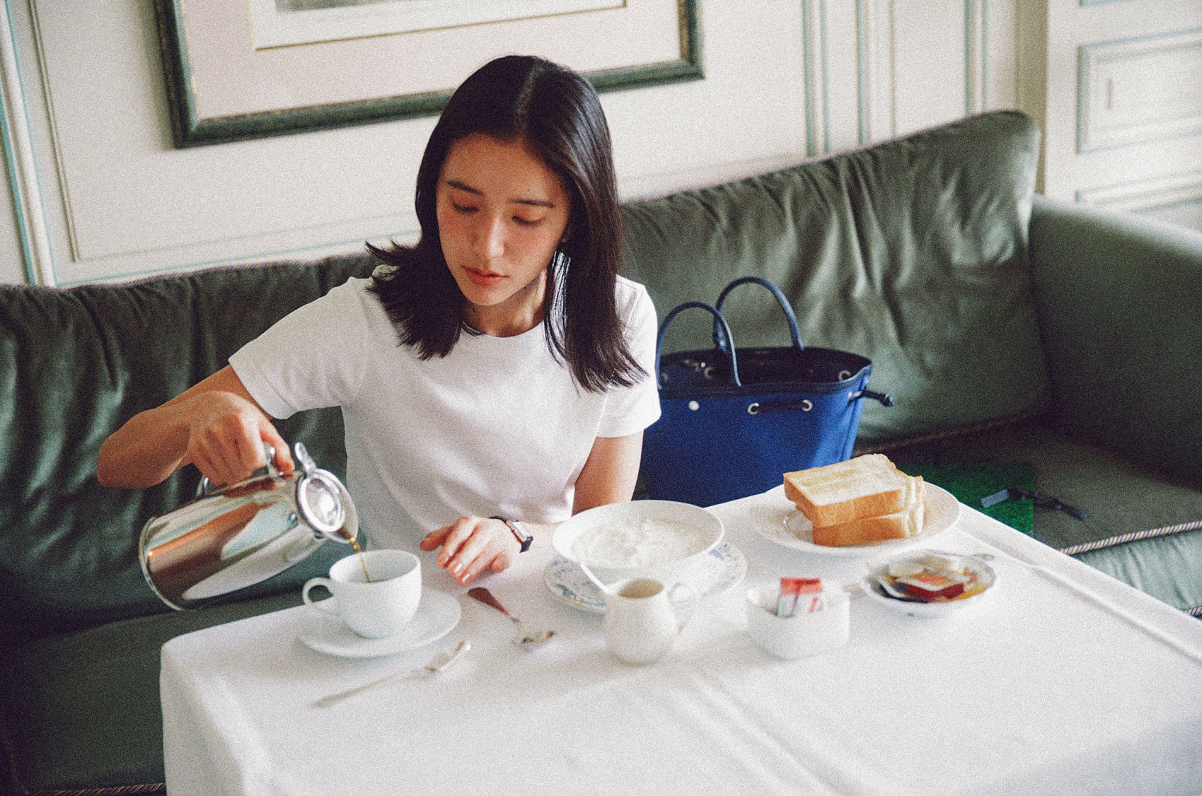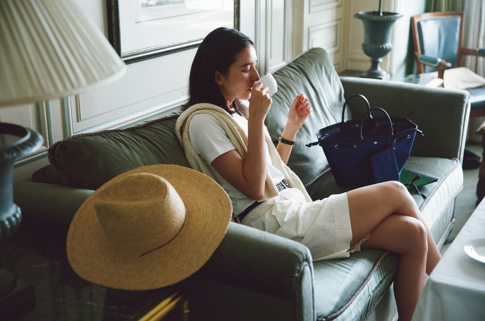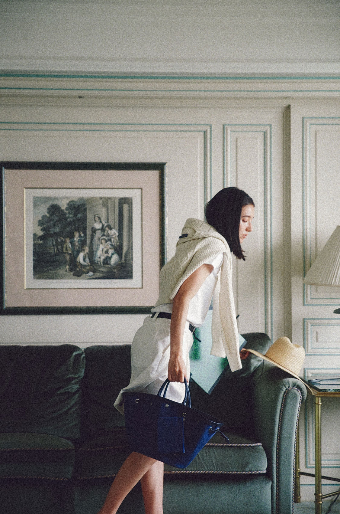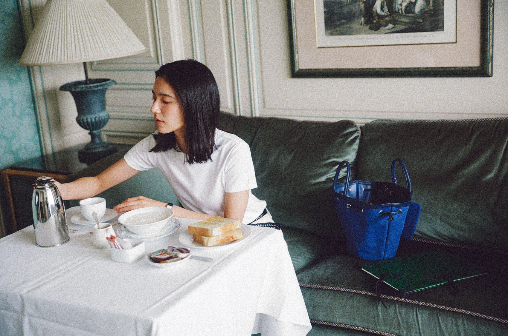 This shopper bag is crafted by combining soft sheepskin with cotton canvas material. Named "COQUILLE," which means "shell" in French, it embodies the feature of a bag that can be freely shaped using the leather string at the top. When carrying many belongings, you can spread it wide to form the shape of a shopper bag, or you can tighten the string to use it as a bucket bag. There's a snap in the center with the logo embossed, allowing for secure closure. Additionally, it comes with a detachable pouch, making it convenient to store small essentials that are frequently needed. The soft and round strap provides a comfortable grip even when the bag is filled with many items, while the sturdy sheepskin bottom provides stability to the bag.