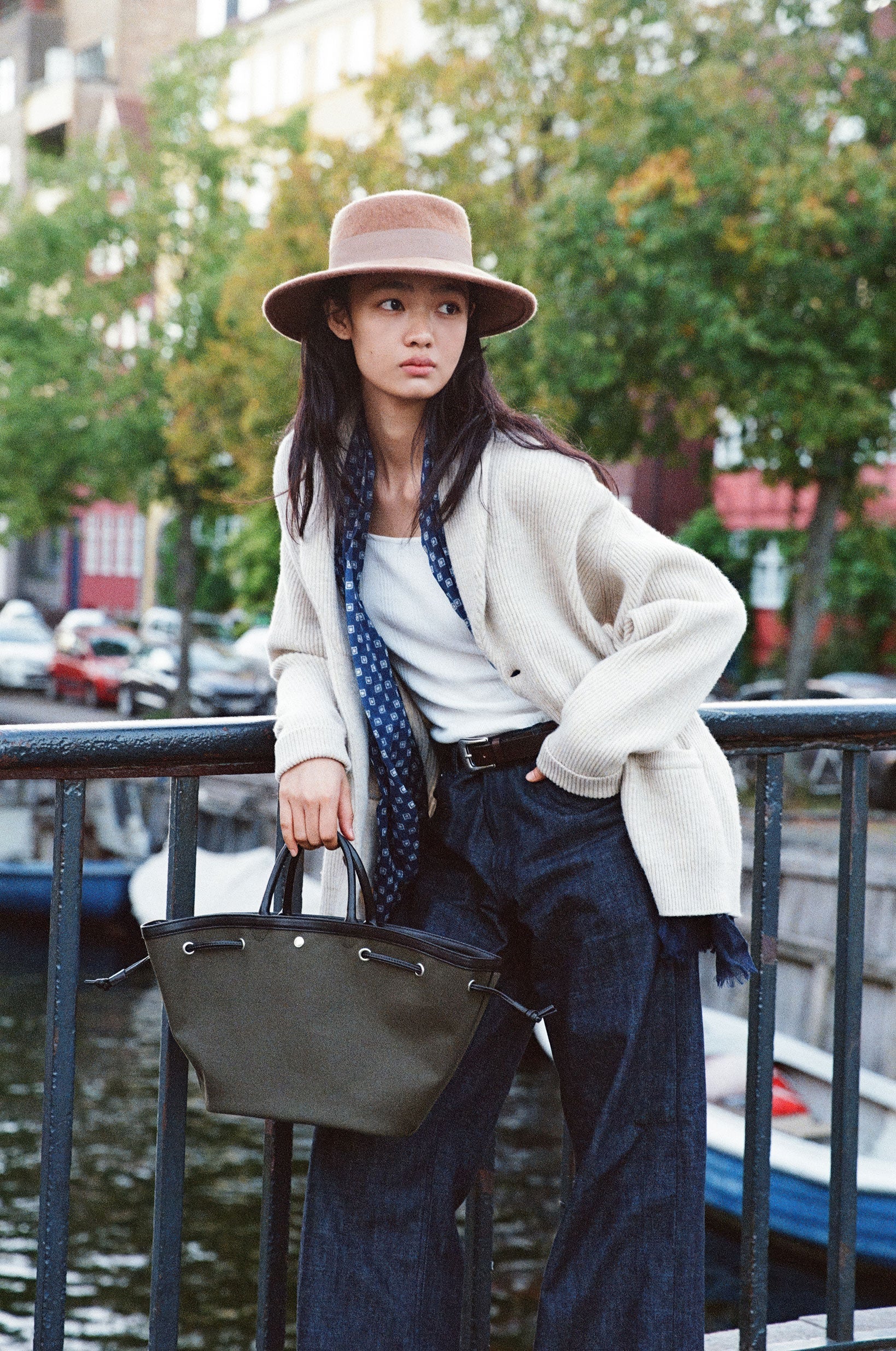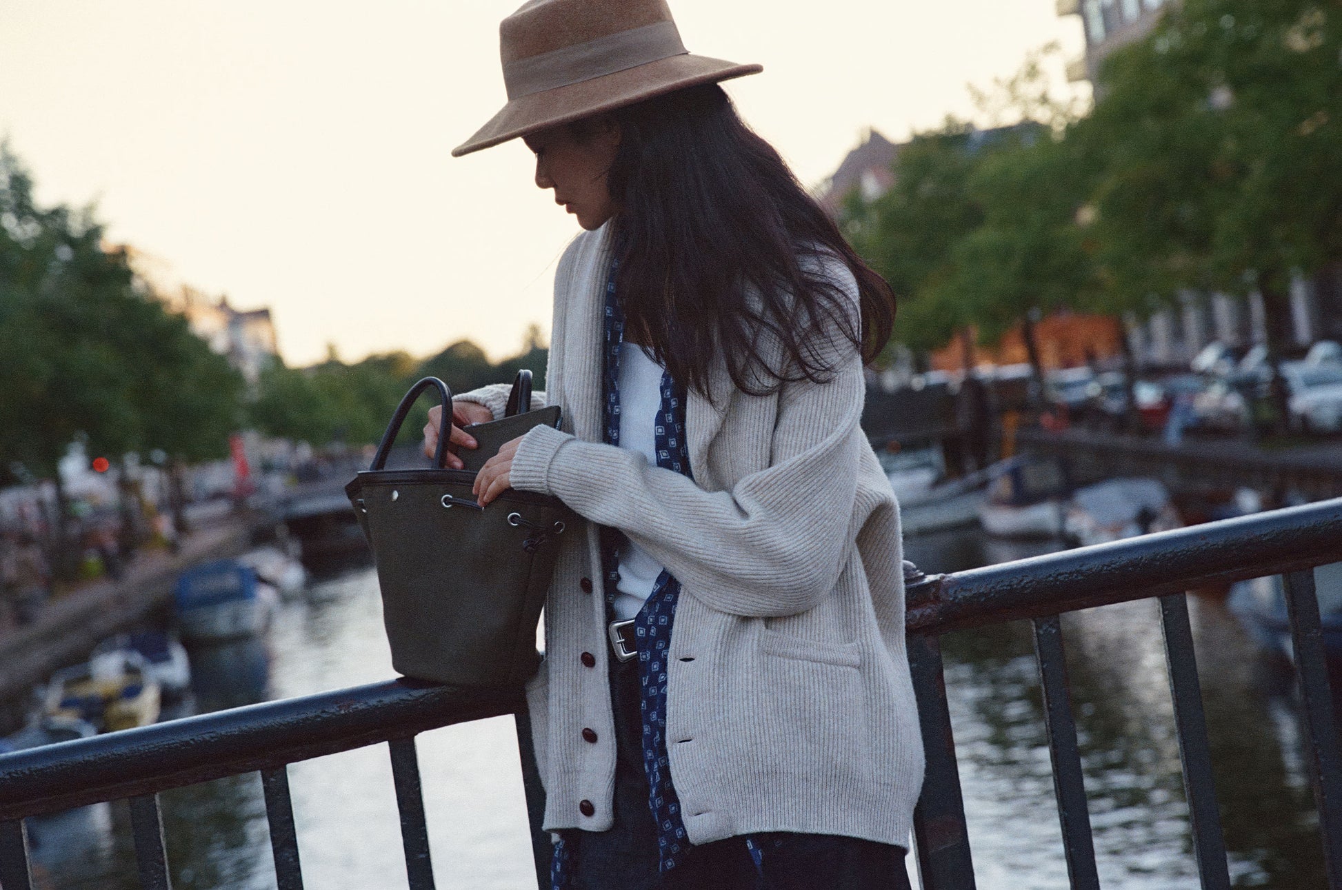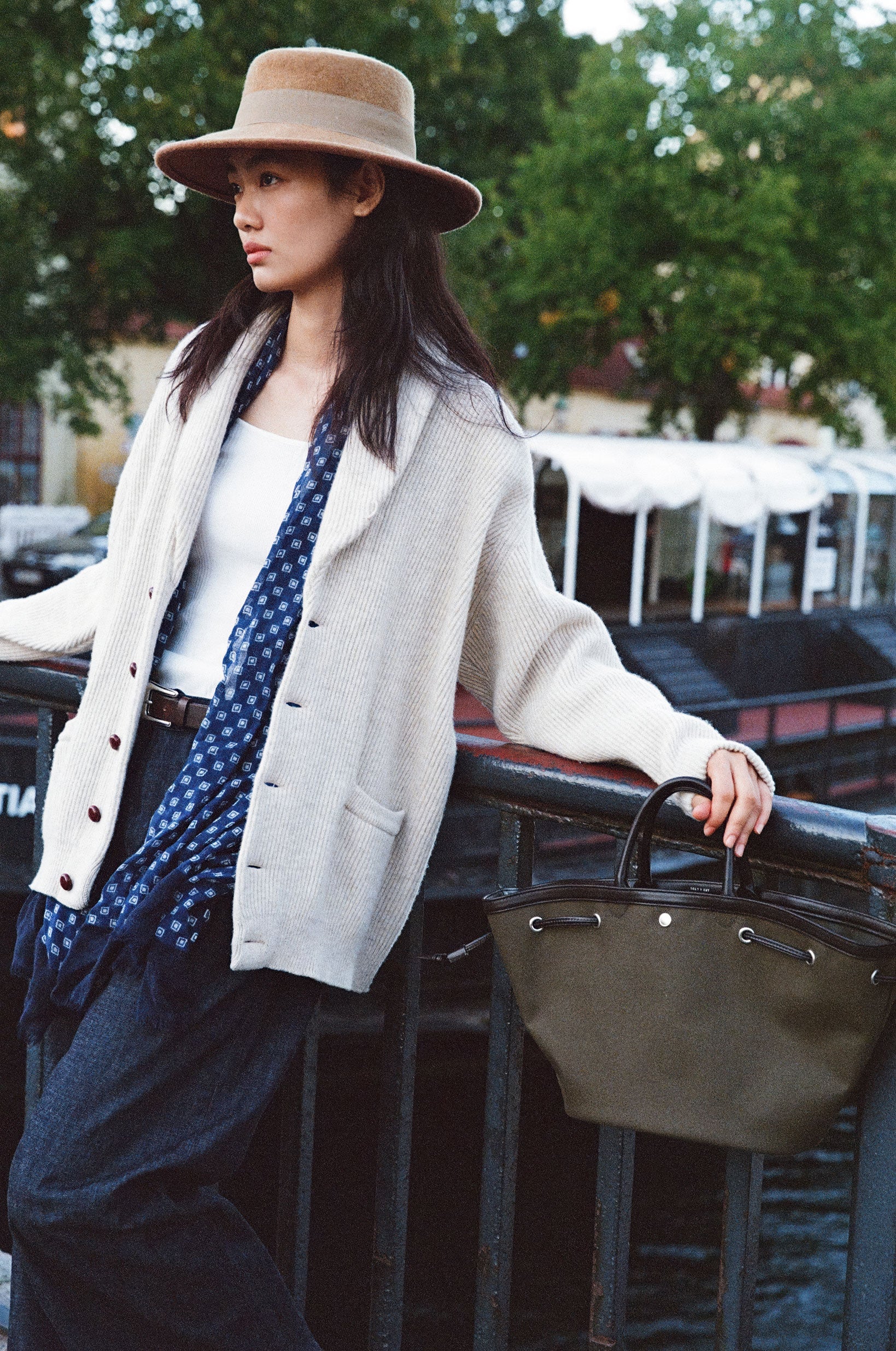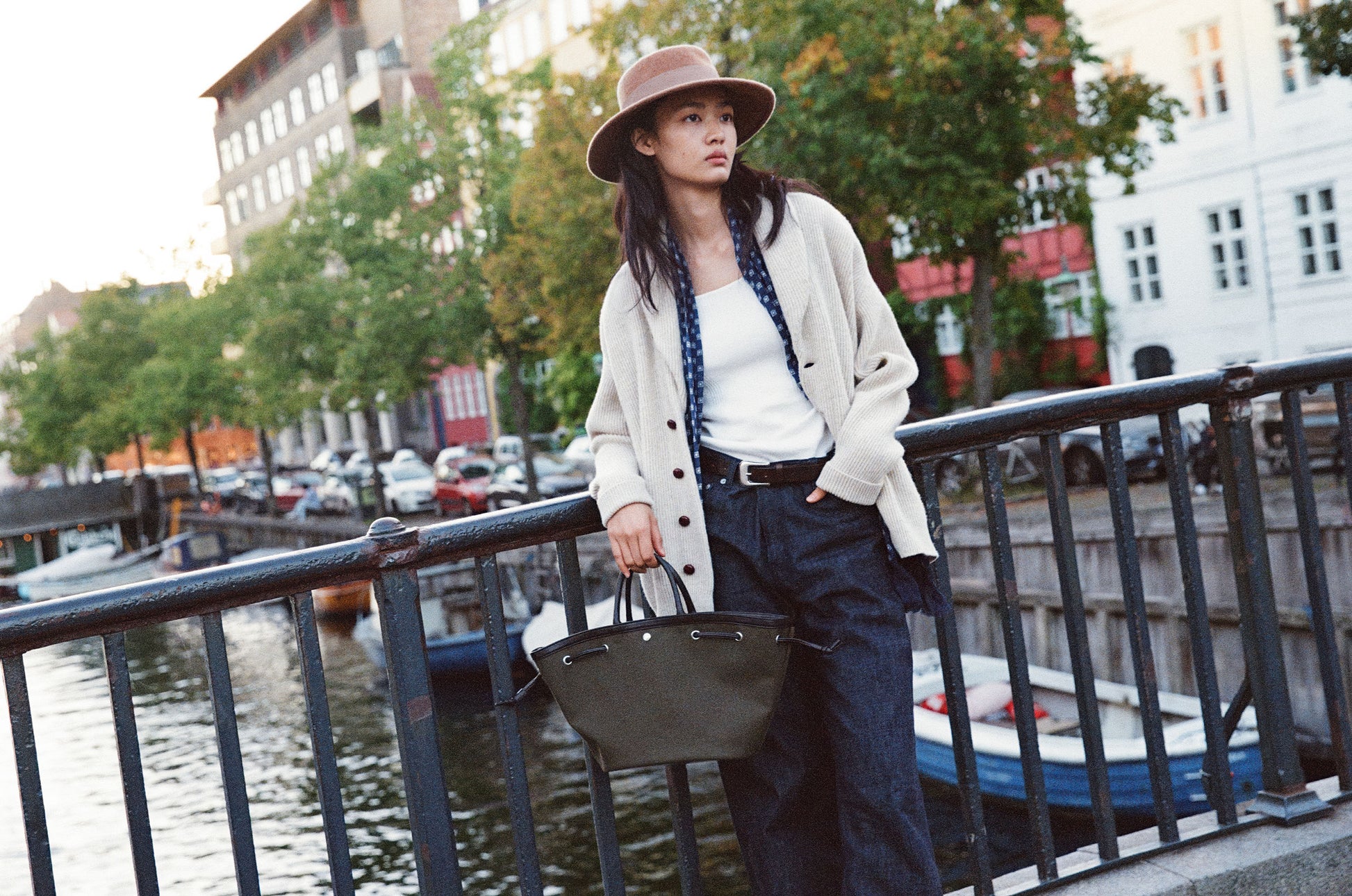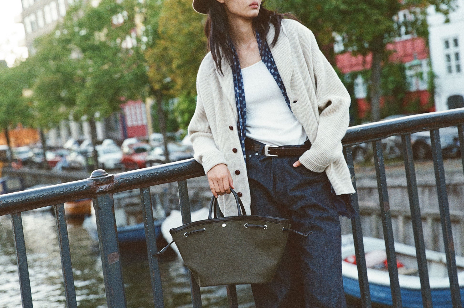 This shopper bag is crafted by combining soft sheepskin with cotton canvas material. Named "COQUILLE," which means "shell" in French, it embodies the feature of a bag that can be freely shaped using the leather string at the top. When carrying many belongings, you can spread it wide to form the shape of a shopper bag, or you can tighten the string to use it as a bucket bag. There's a snap in the center with the logo embossed, allowing for secure closure. Additionally, it comes with a detachable pouch, making it convenient to store small essentials that are frequently needed. The soft and round strap provides a comfortable grip even when the bag is filled with many items, while the sturdy sheepskin bottom provides stability to the bag.